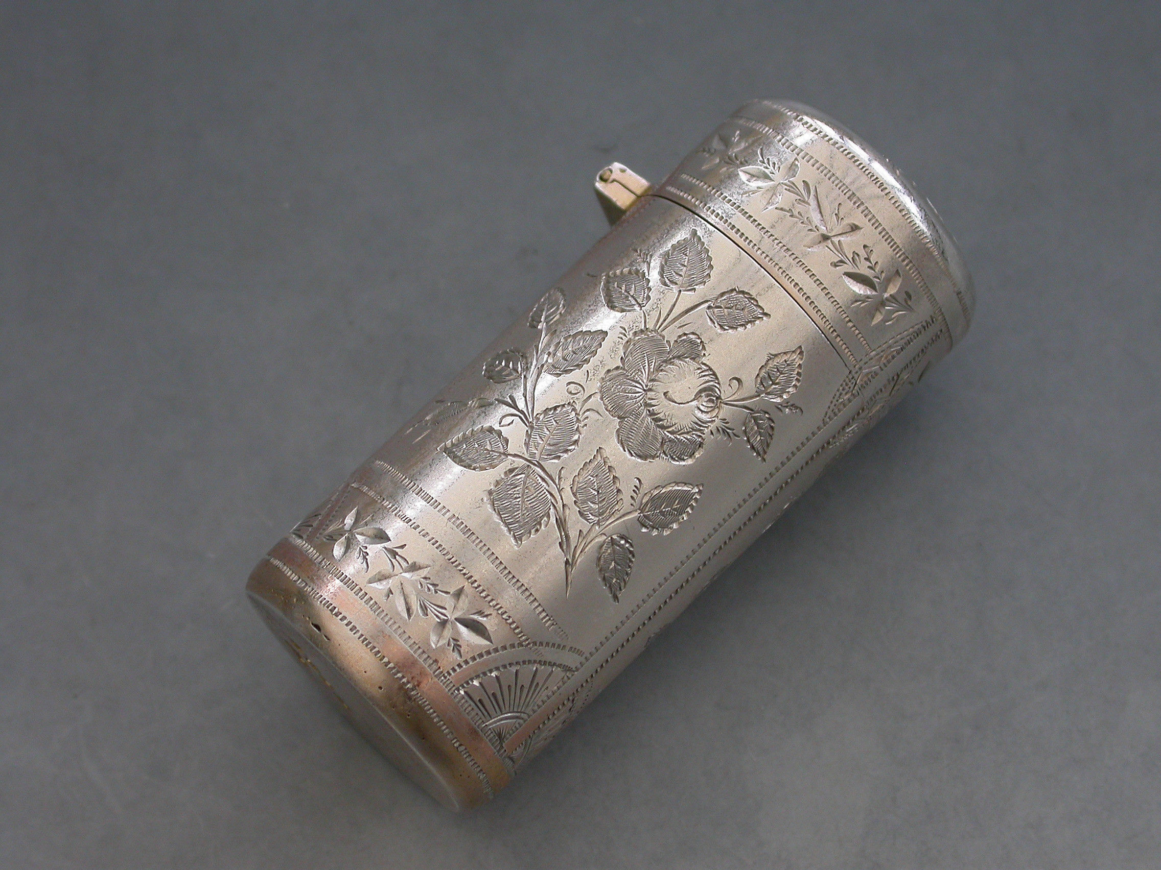 A fine quality Victorian silver Scent Bottle of cylindrical form with hinged lid, glass liner and stopper, the body crisply engraved with panels of roses and leaves.