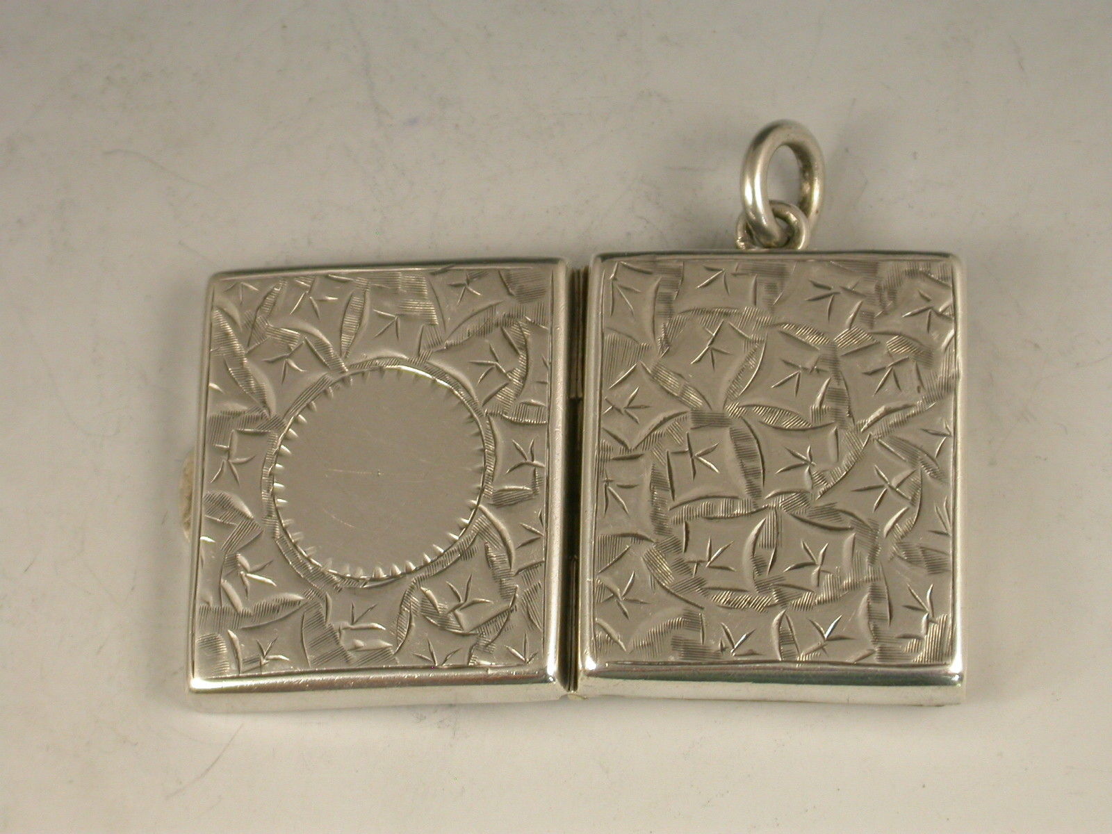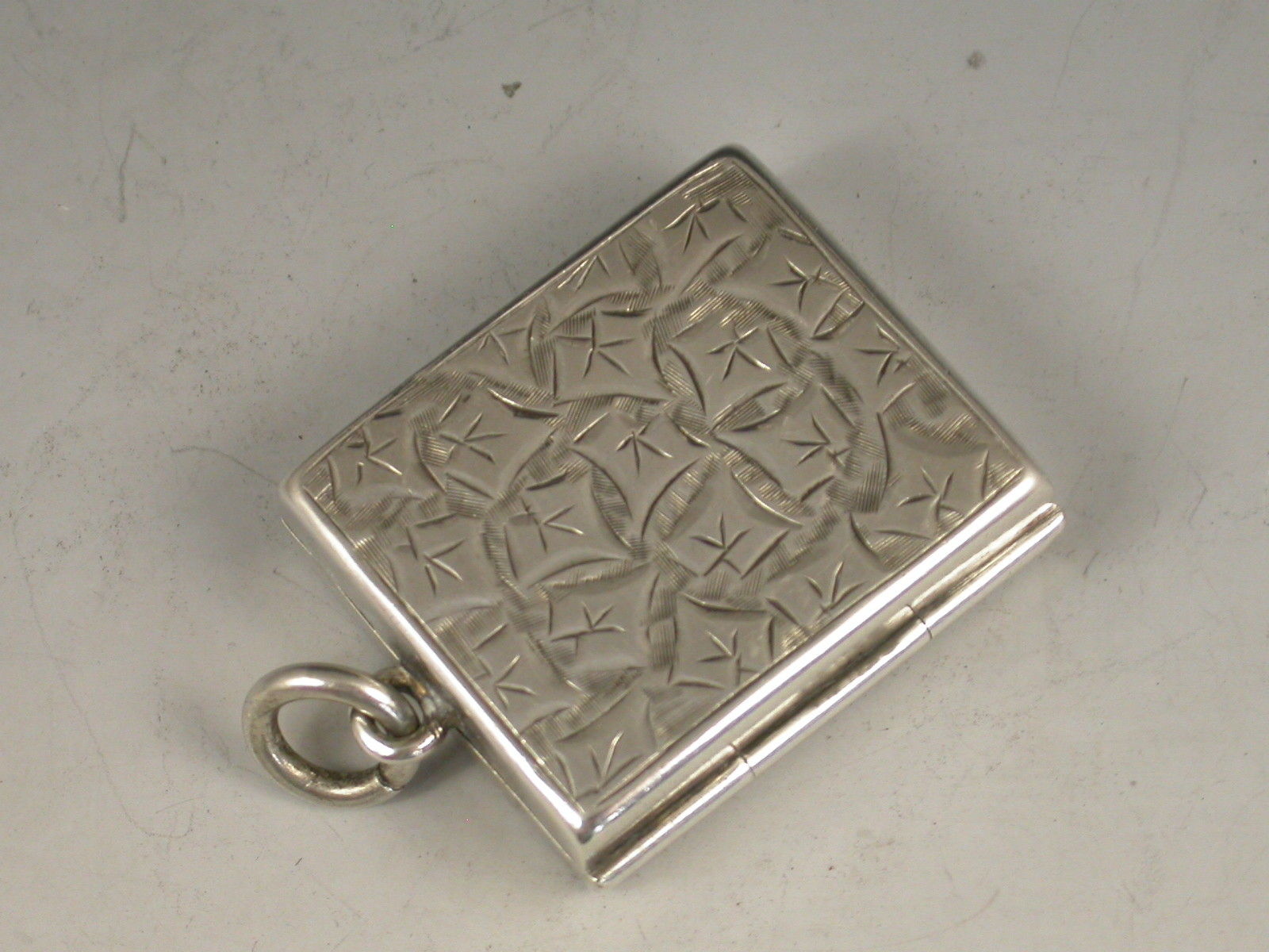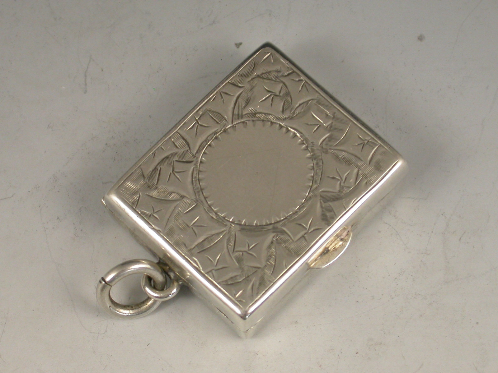 A good Victorian silver Stamp Case of hinged rectangular form with attached suspension ring, the base and cover engraved with ivy leaf decoration surrounding a vacant circular cartouche, the silver gilt interior with a sprung compartment to hold and dispense stamps.