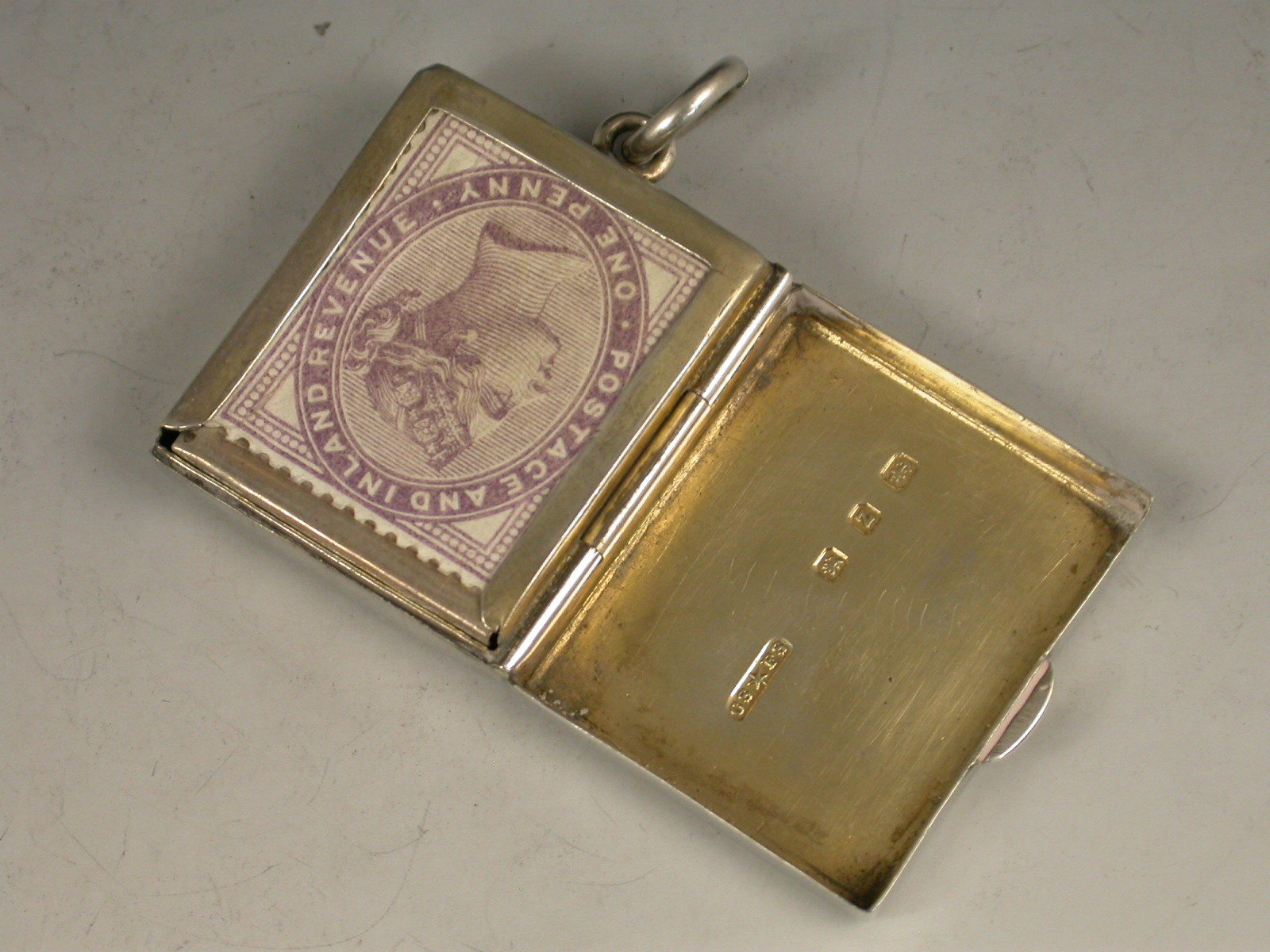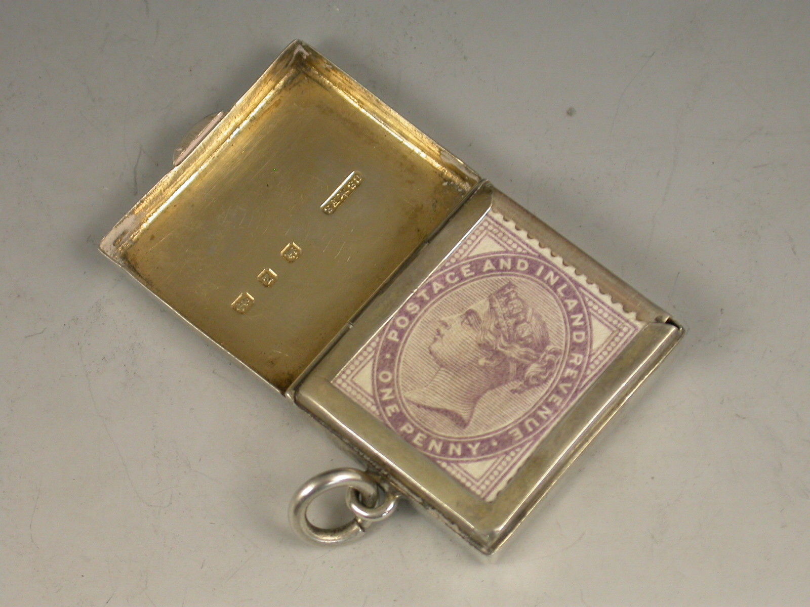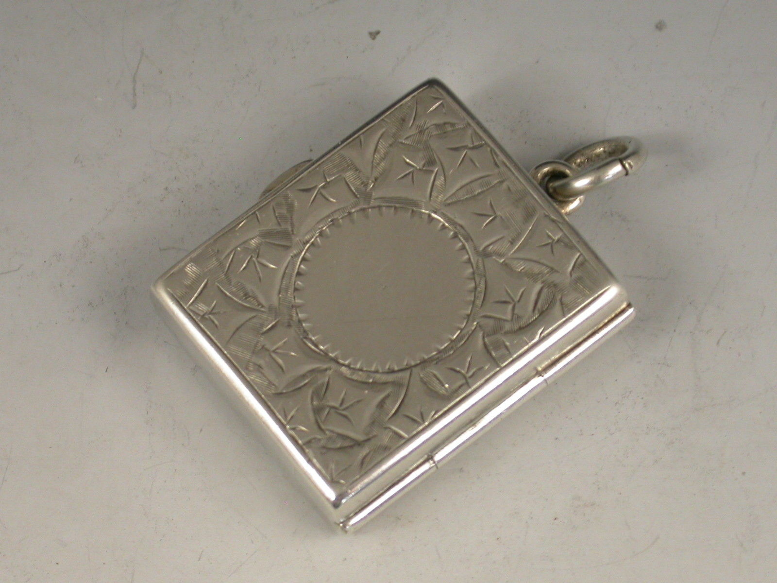 A good Victorian silver Stamp Case of hinged rectangular form with attached suspension ring, the base and cover engraved with ivy leaf decoration surrounding a vacant circular cartouche, the silver gilt interior with a sprung compartment to hold and dispense stamps.