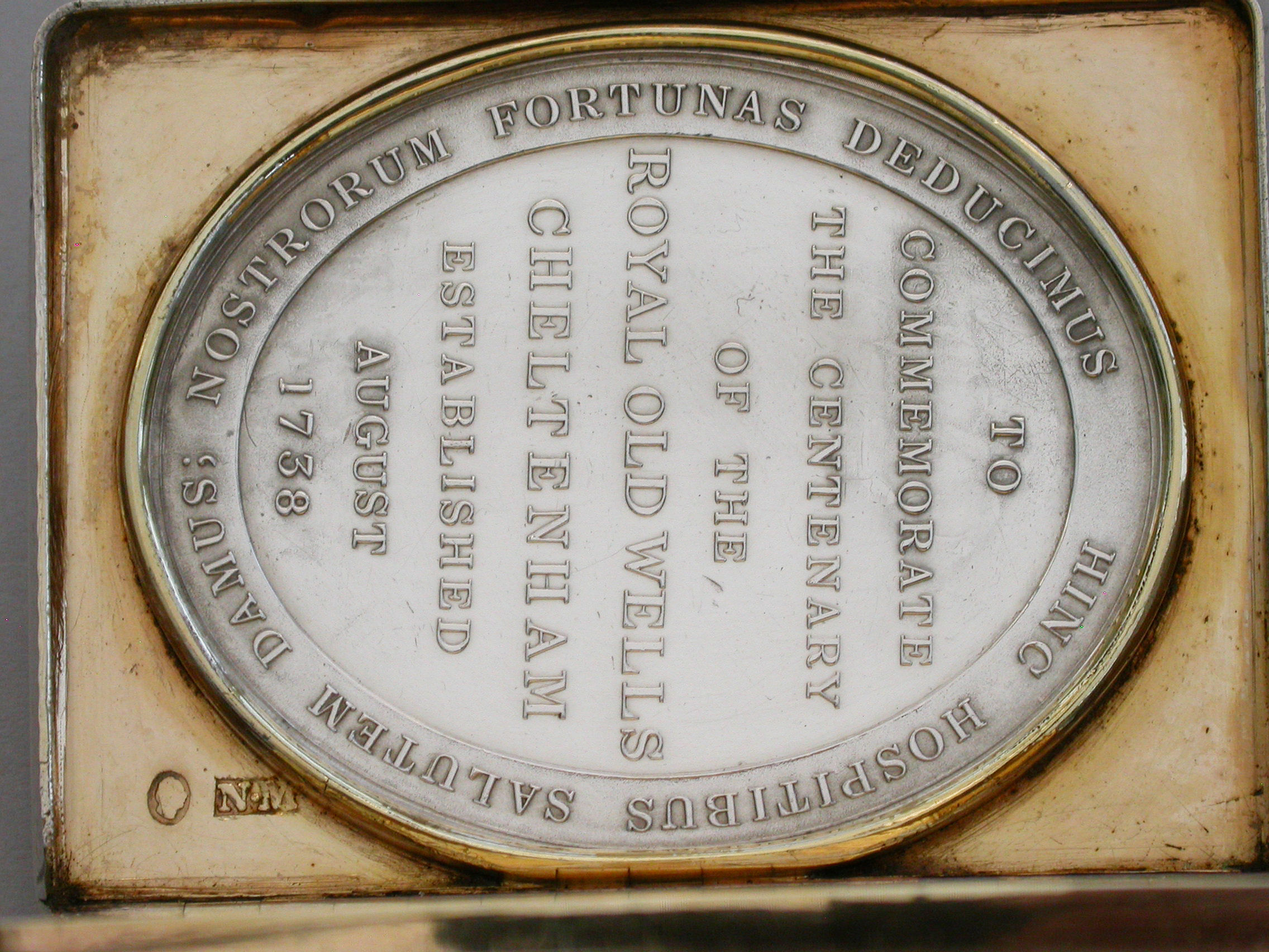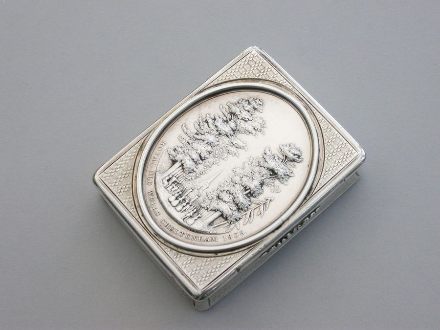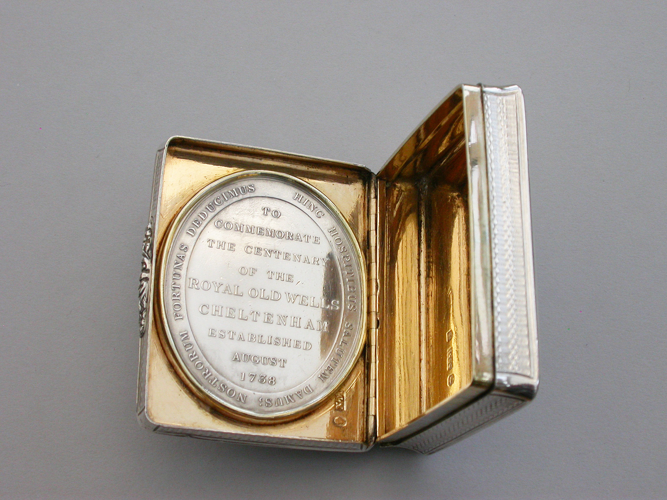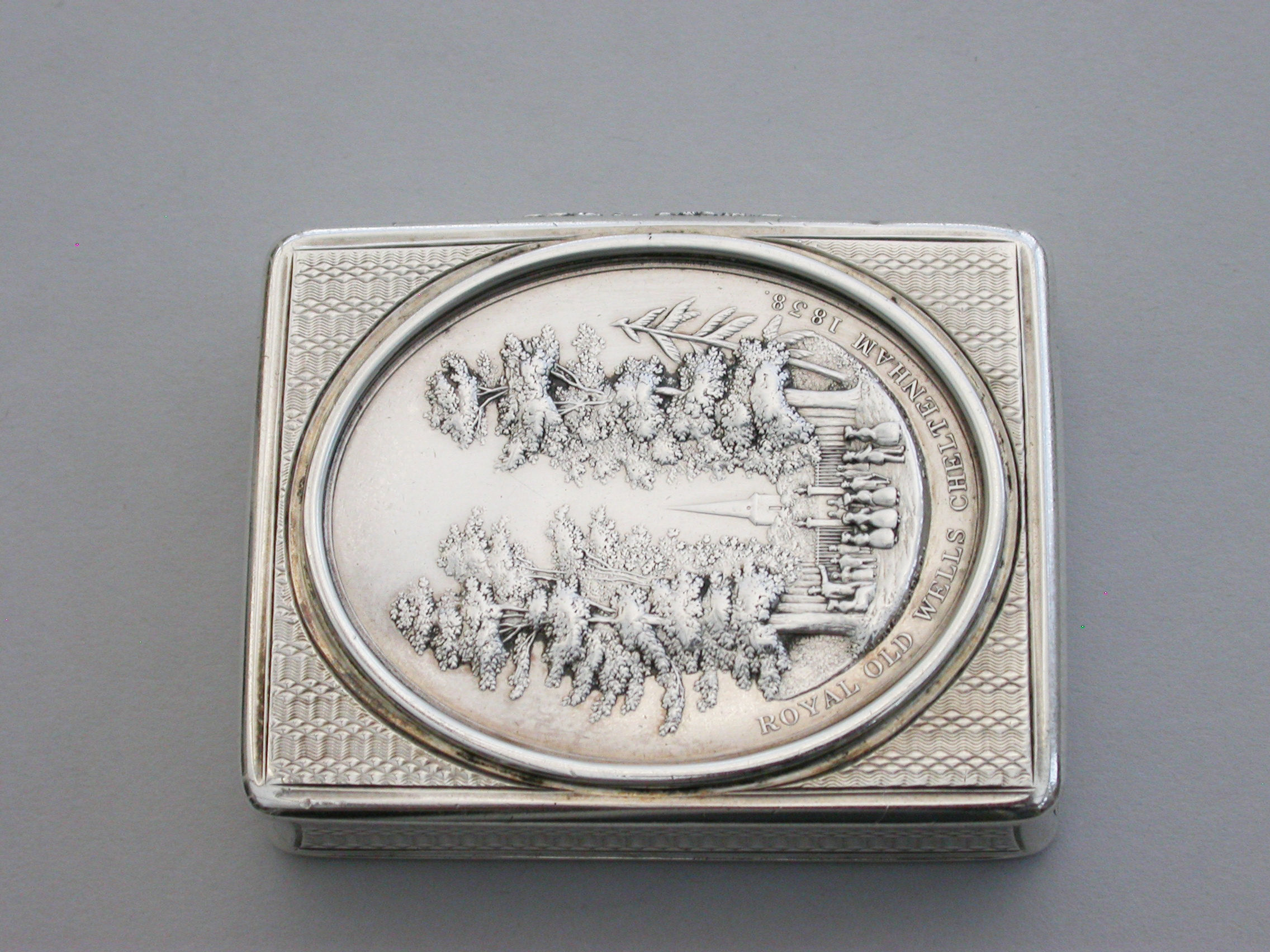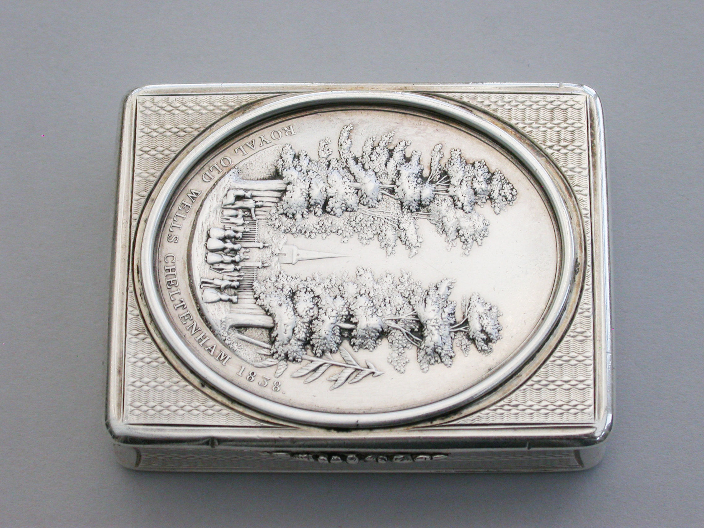 A rare early Victorian silver Snuff Box of compressed rounded rectangular form with engine turned decoration to the base and sides, the lid inset with signed silver medallion depicting The Royal Old Wells in Cheltenham and made to commemorate its centenary in 1838. The medal signed by J Richards & T W Ingram. The box with original silver gilt interior.