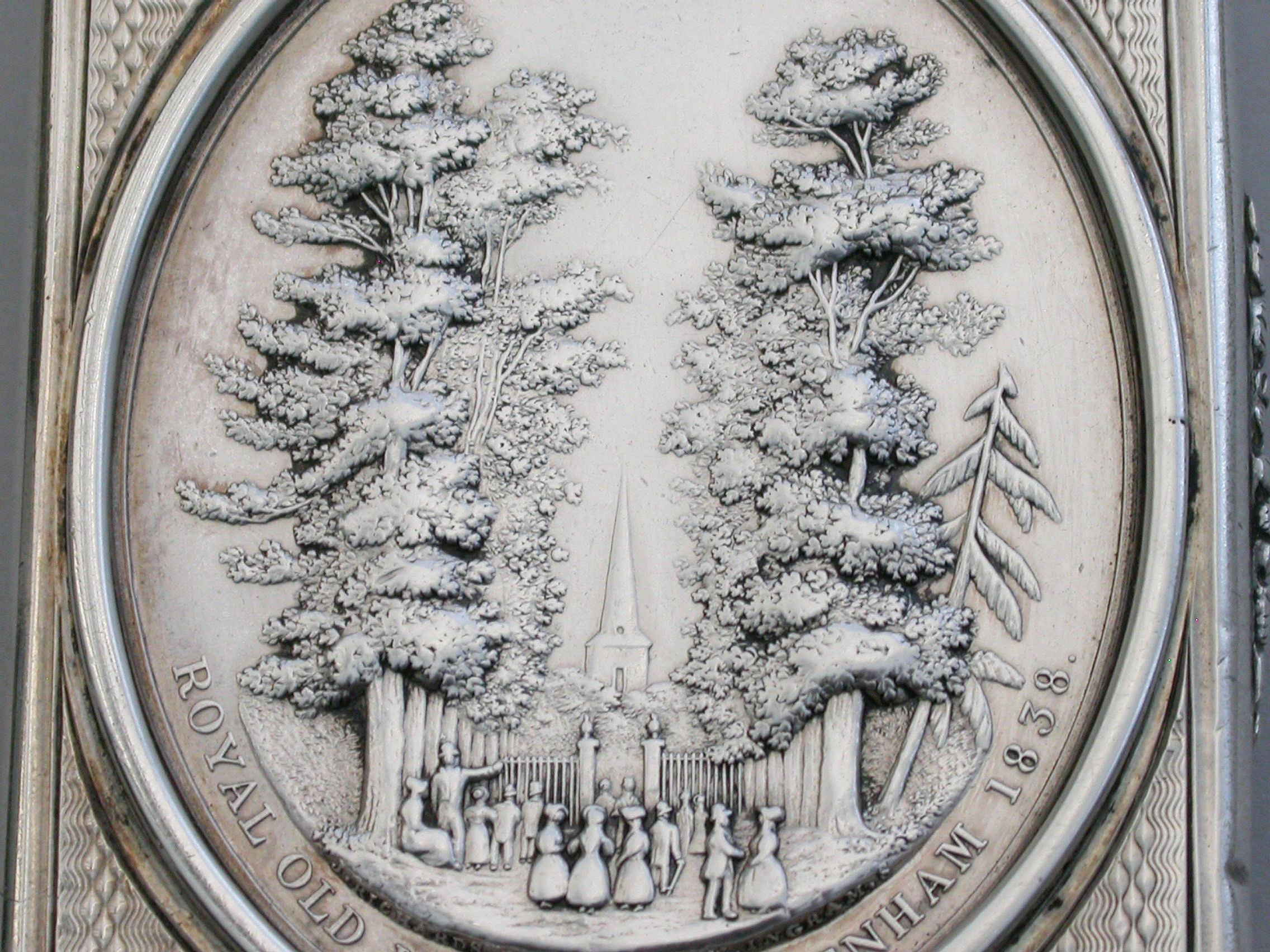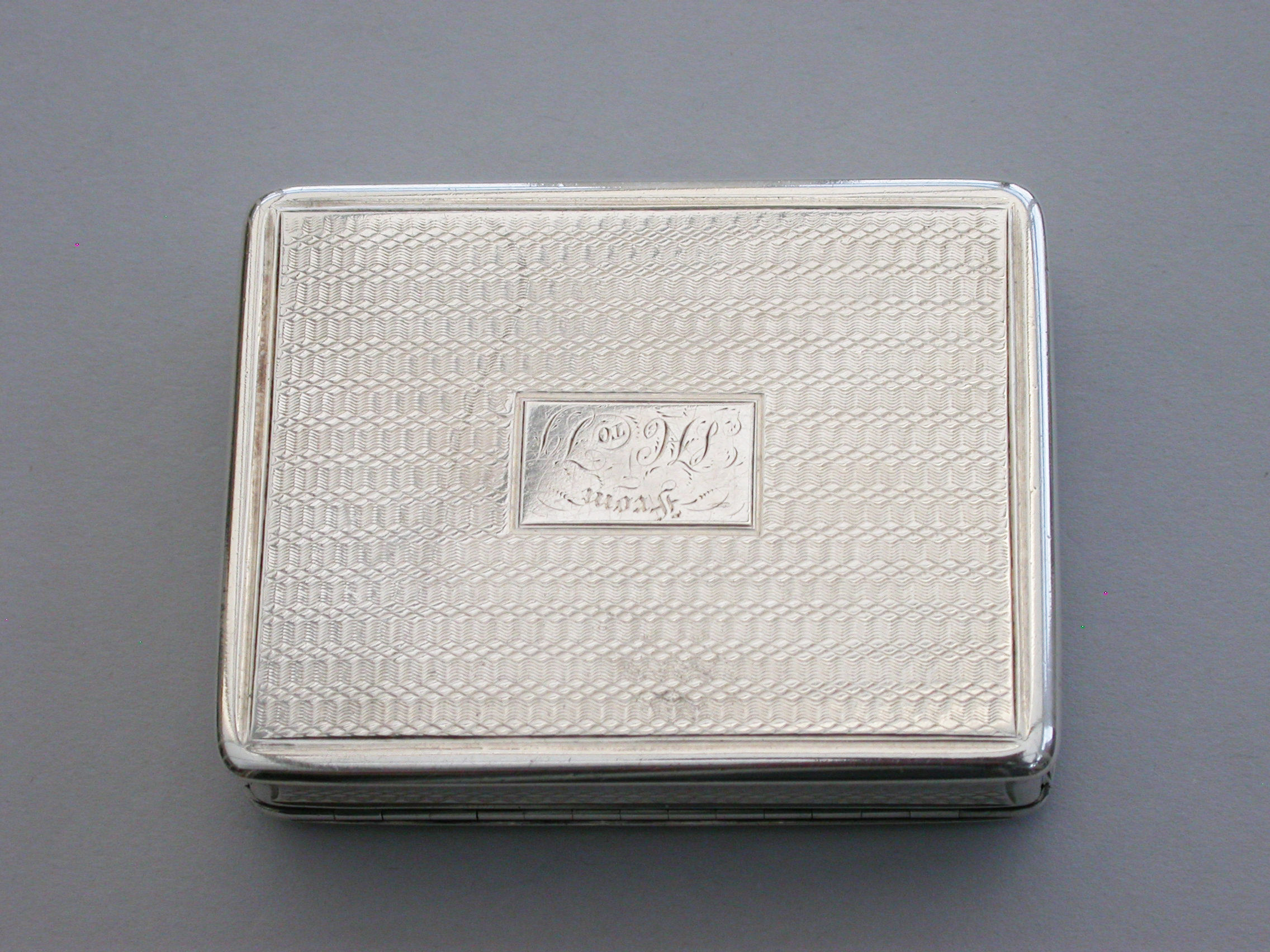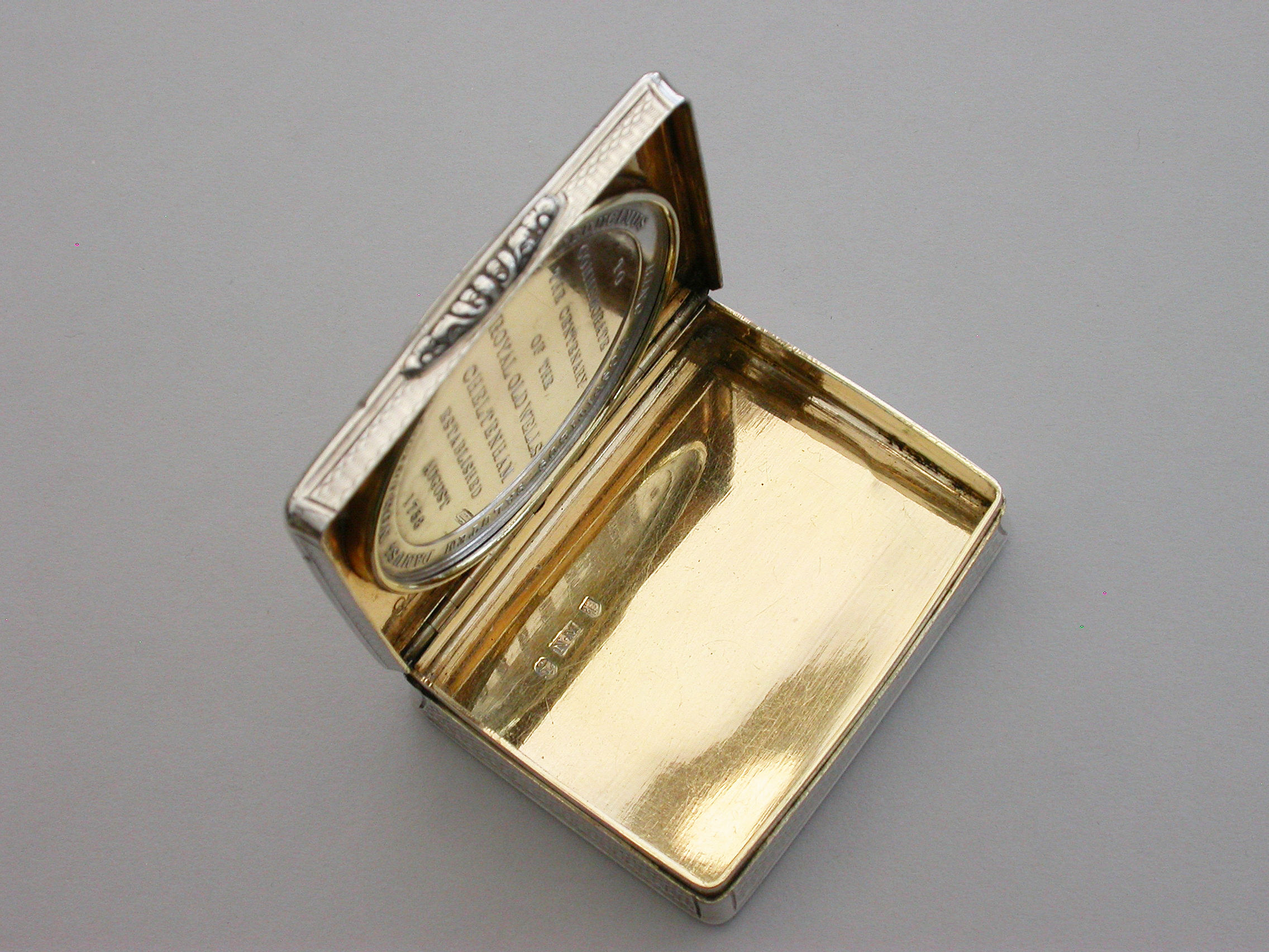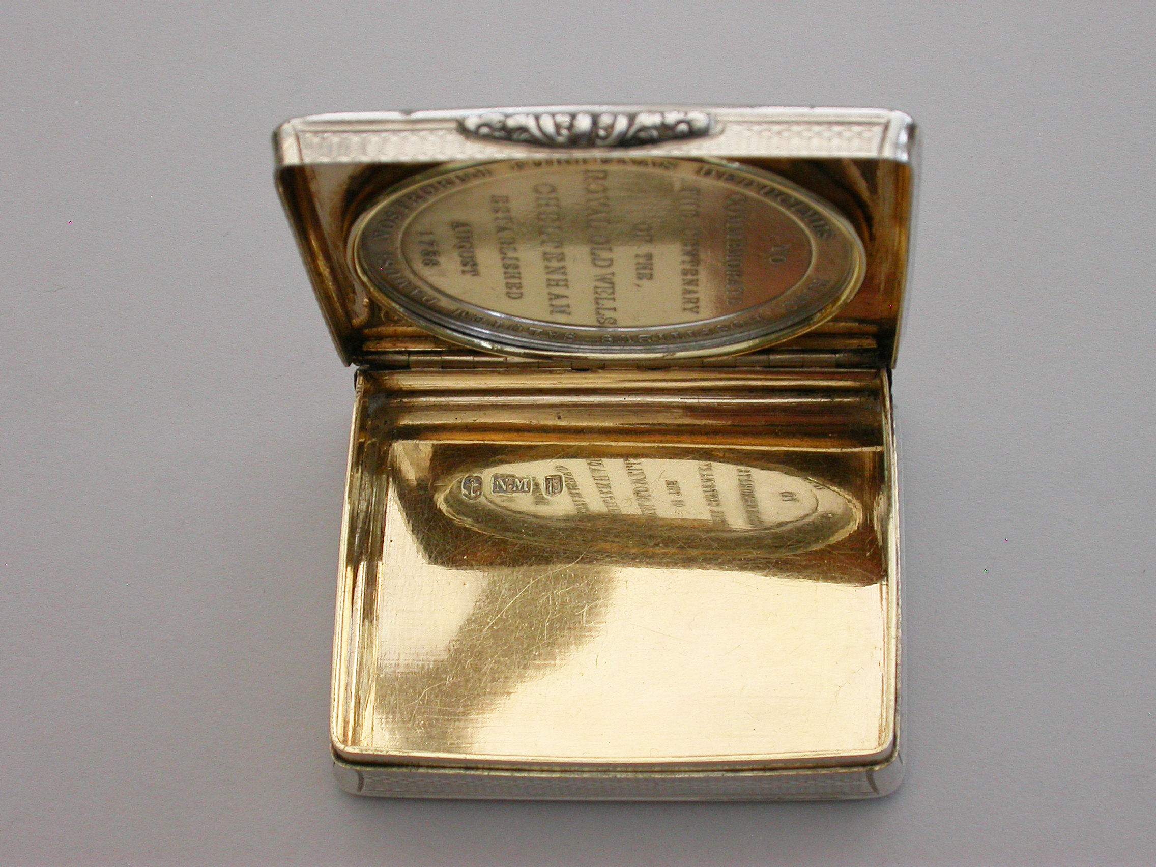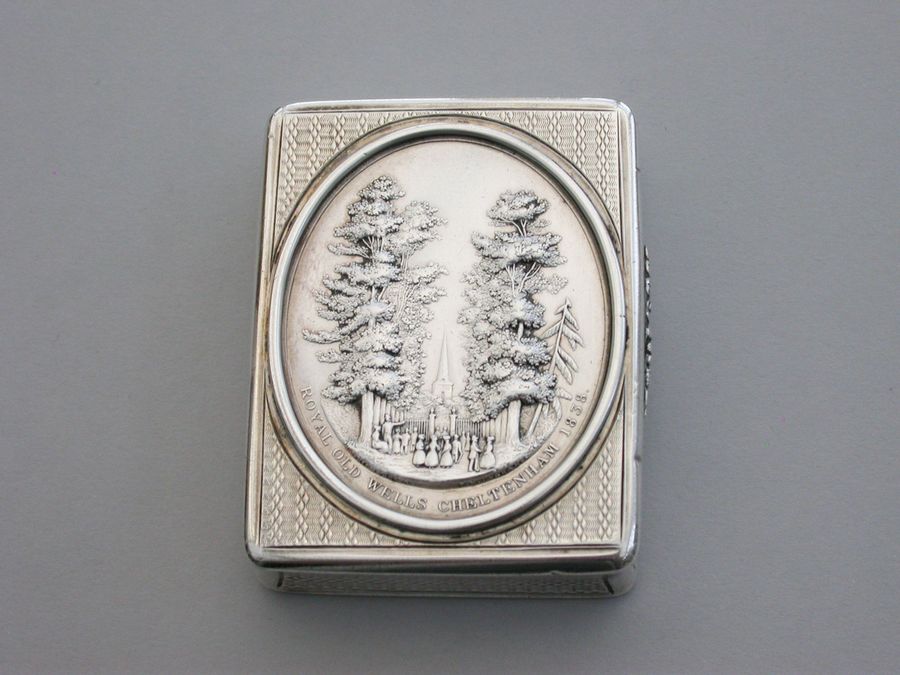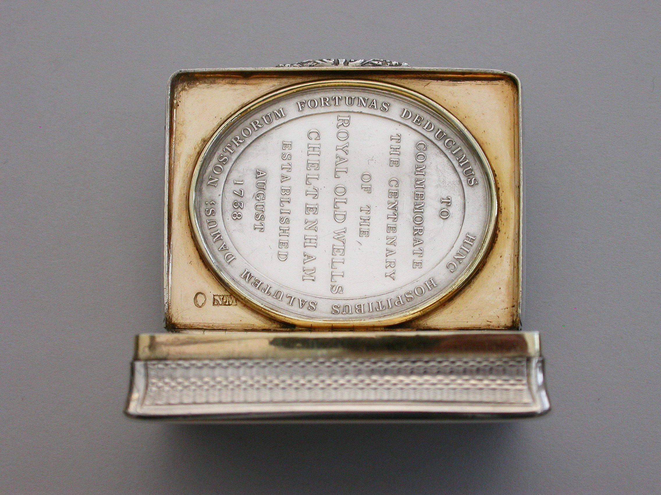 A rare early Victorian silver Snuff Box of compressed rounded rectangular form with engine turned decoration to the base and sides, the lid inset with signed silver medallion depicting The Royal Old Wells in Cheltenham and made to commemorate its centenary in 1838. The medal signed by J Richards & T W Ingram. The box with original silver gilt interior.