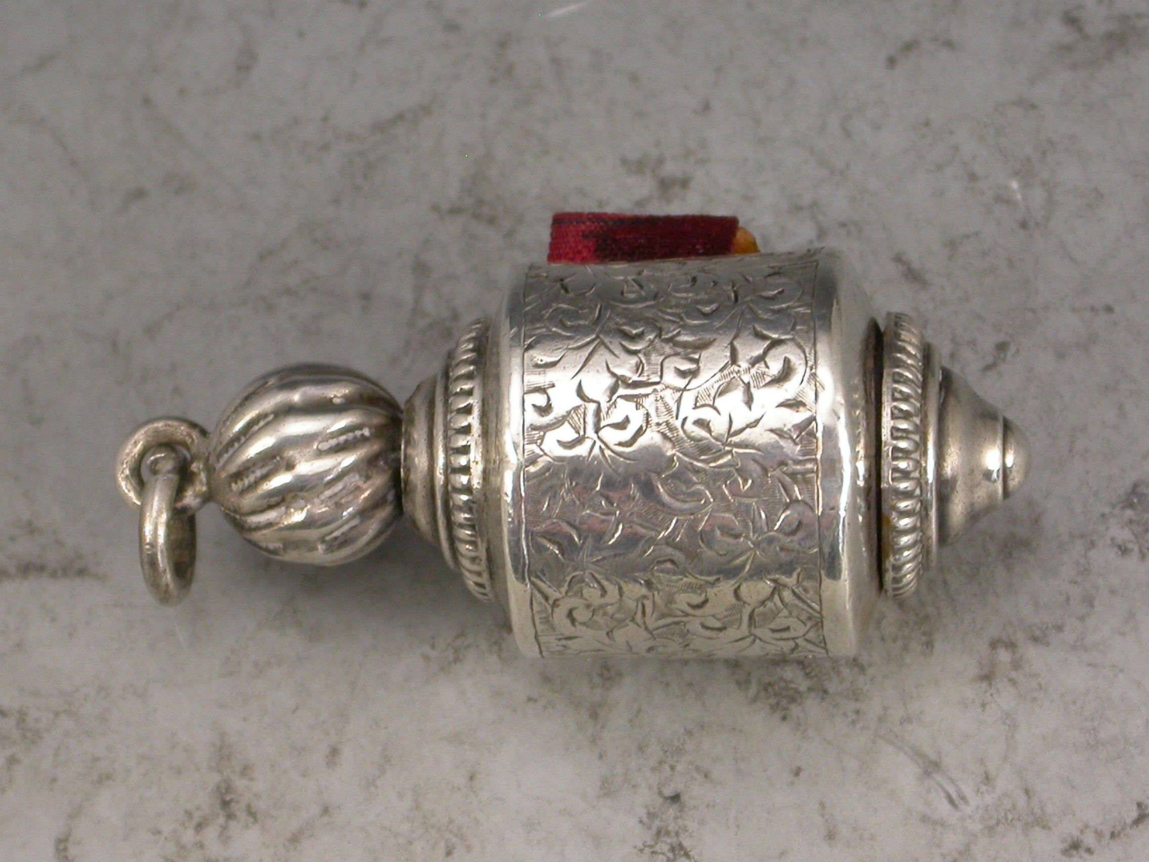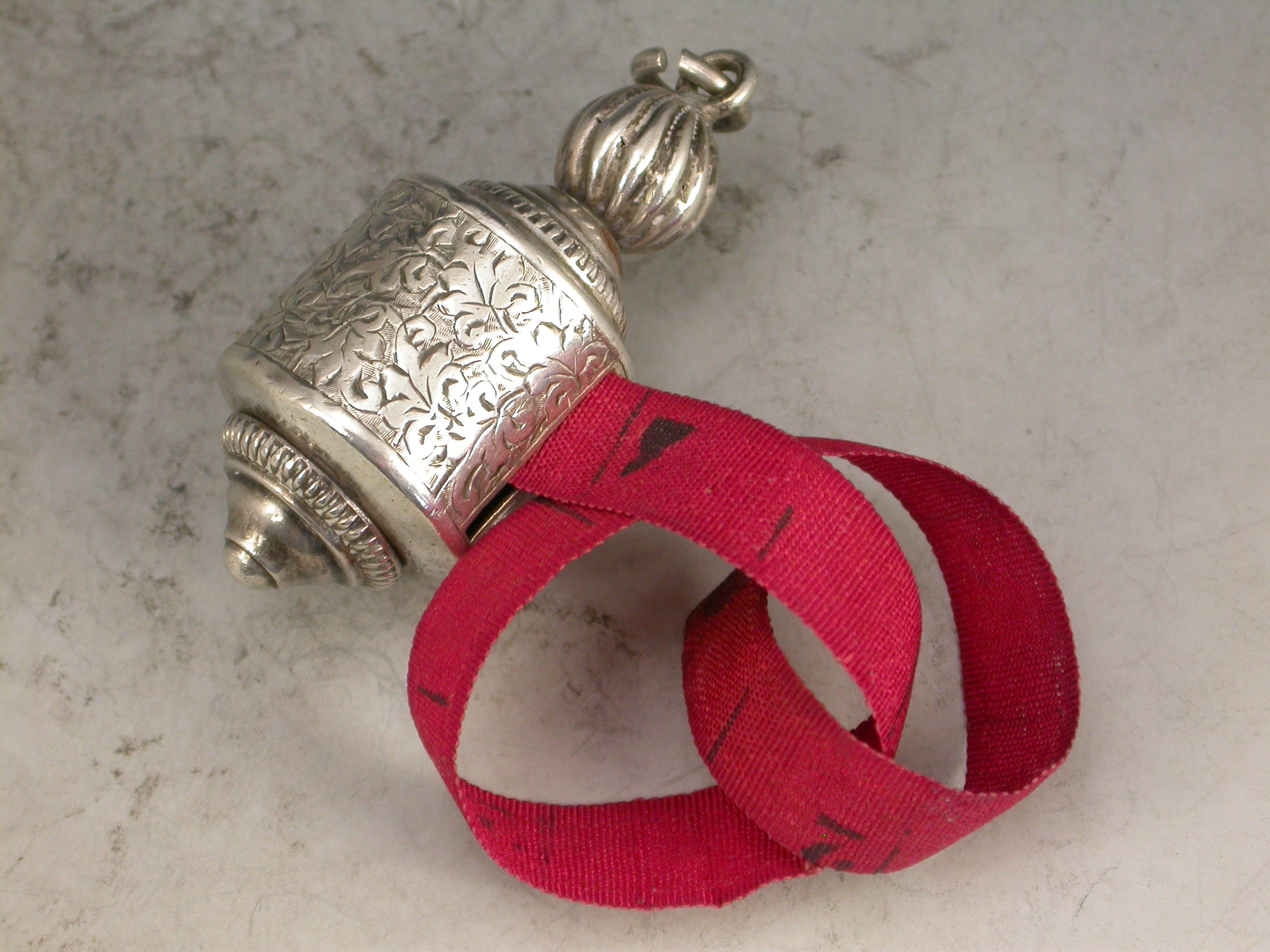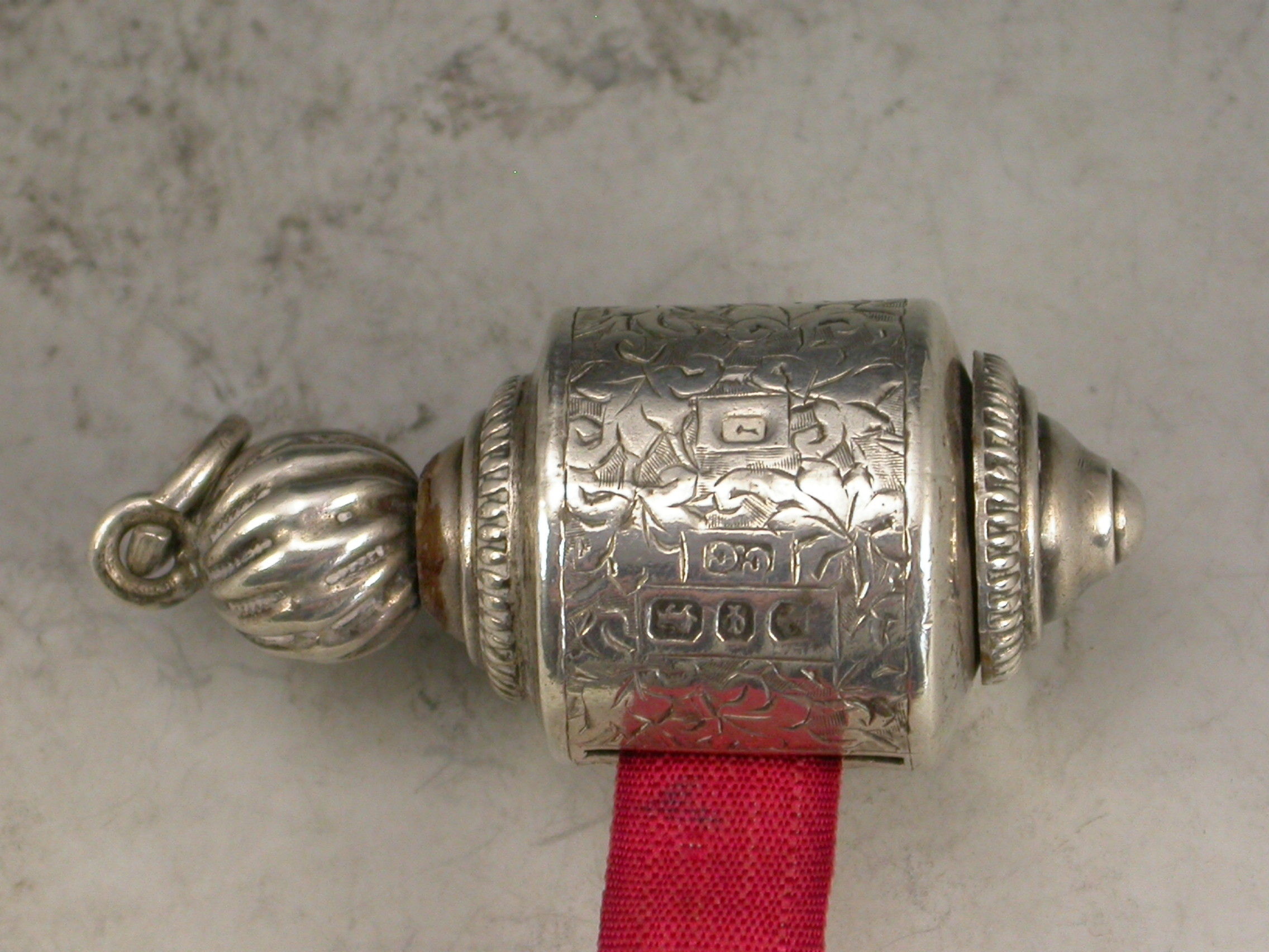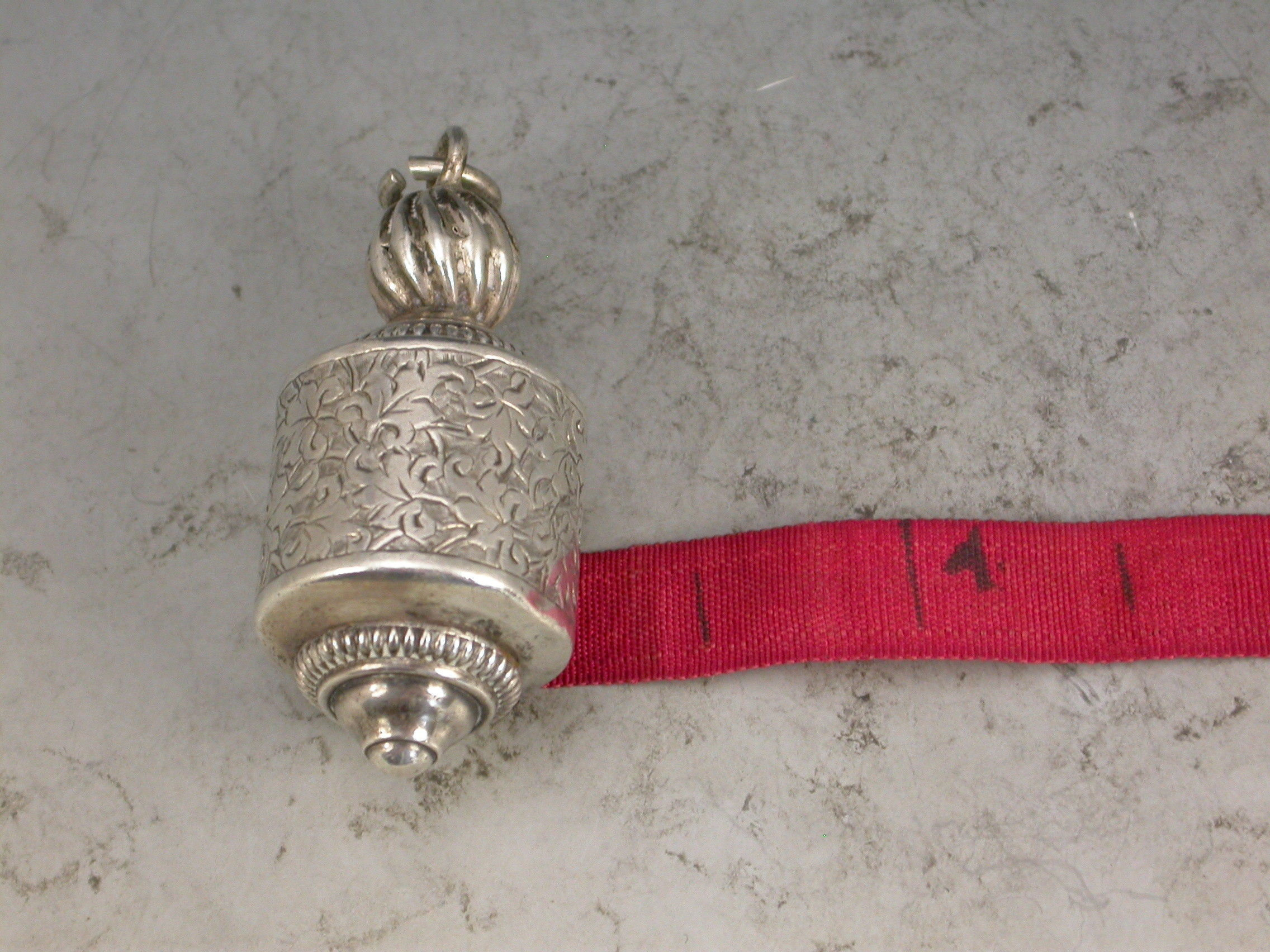 A good Victorian fully hallmarked silver Tape Measure of cylindrical form with ball finial and attached suspension ring. Complete with original red silk tape.