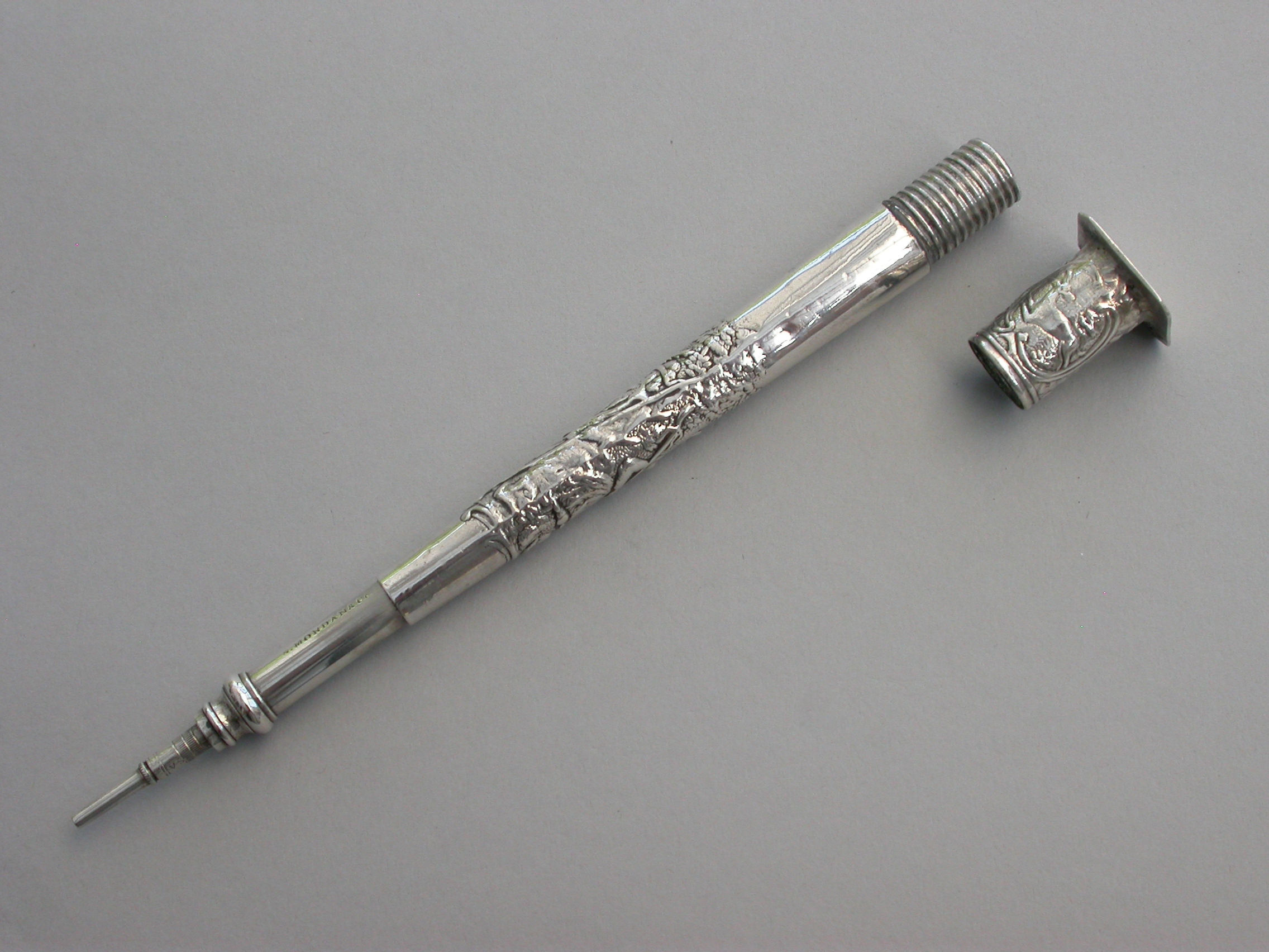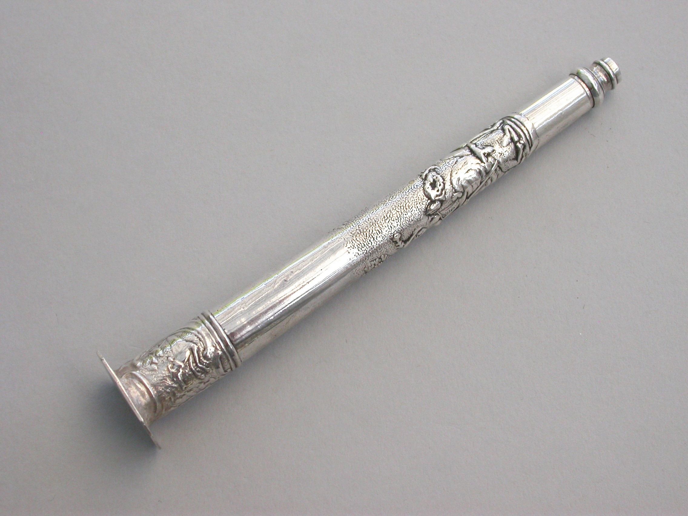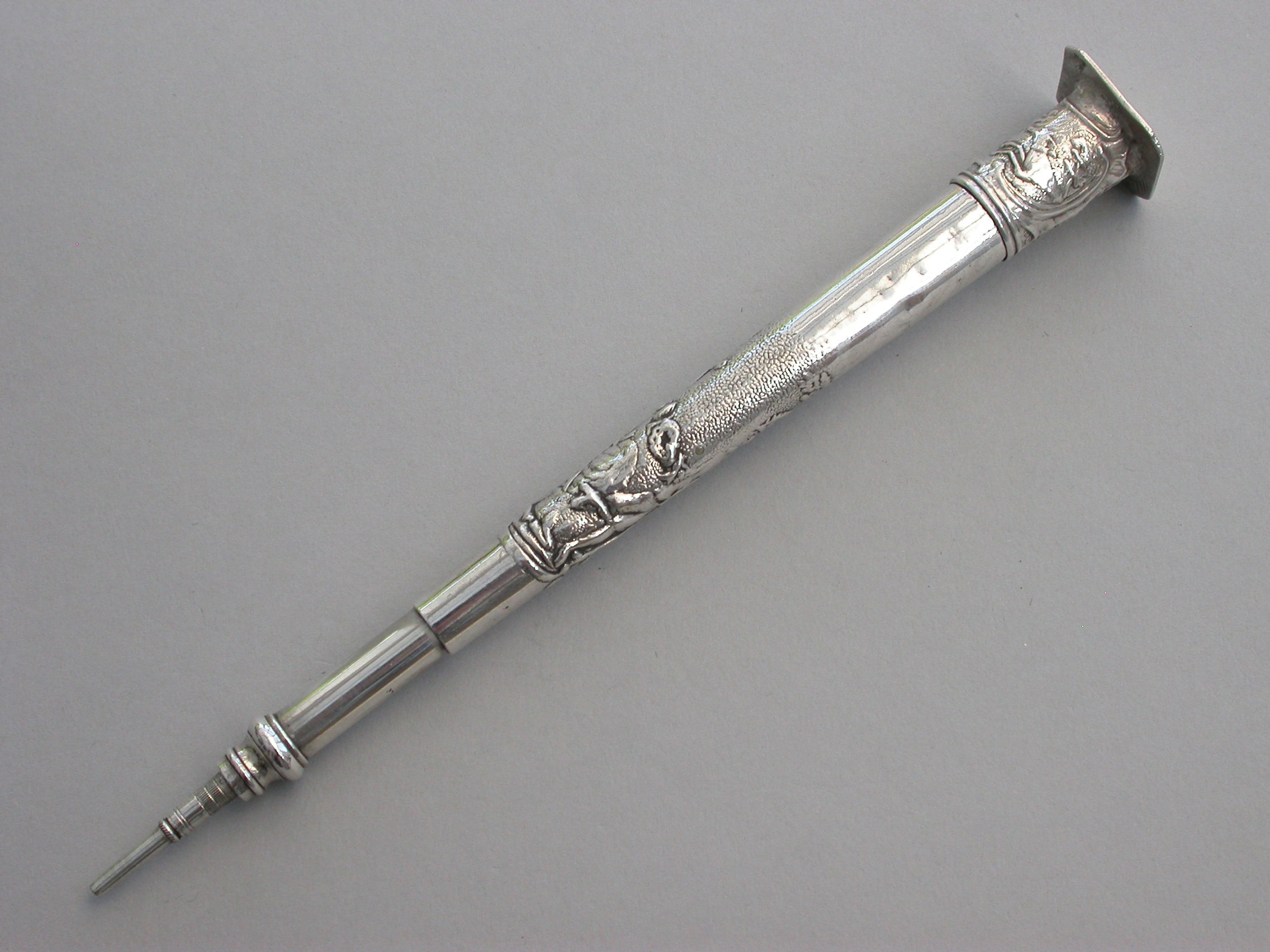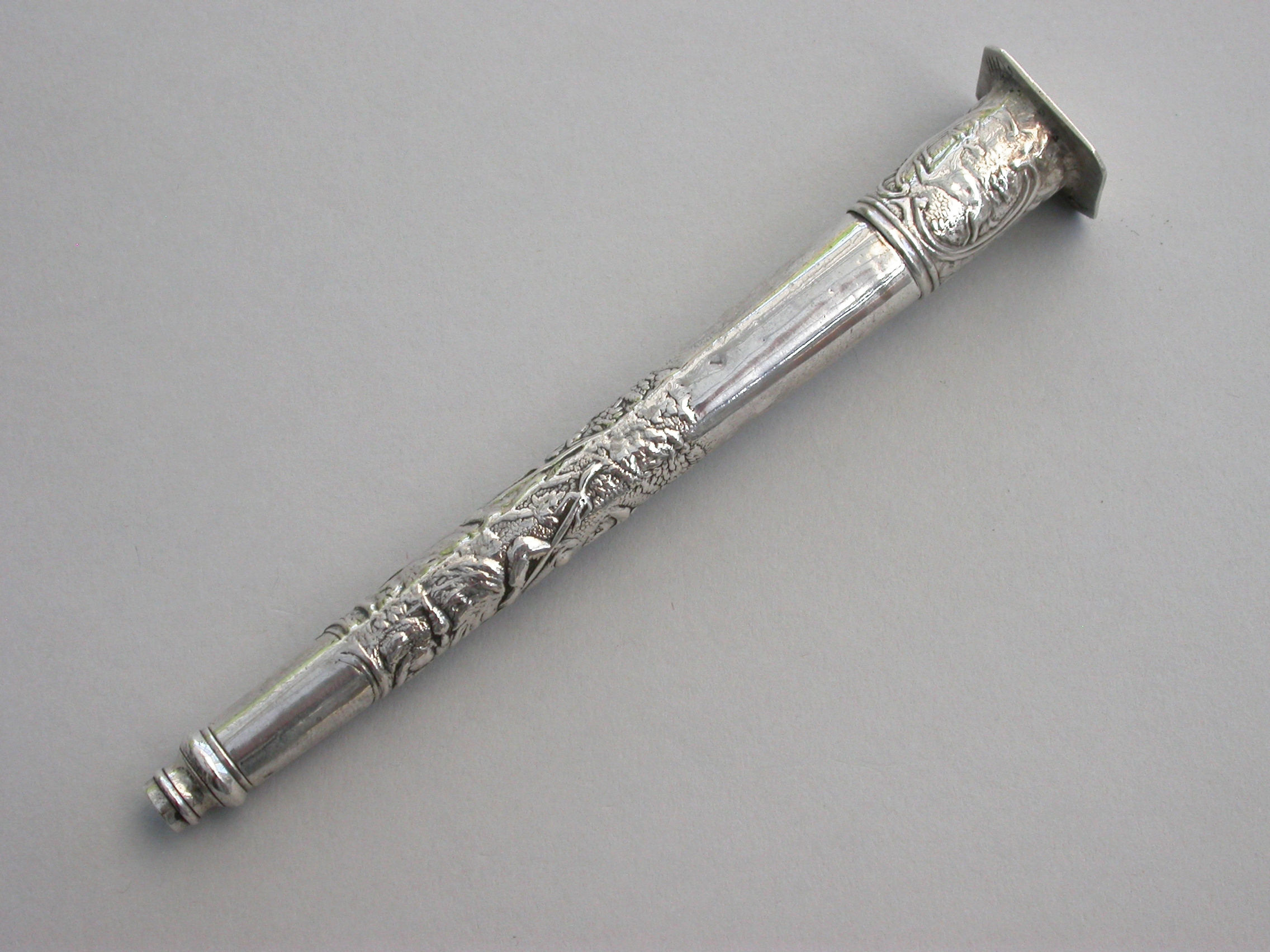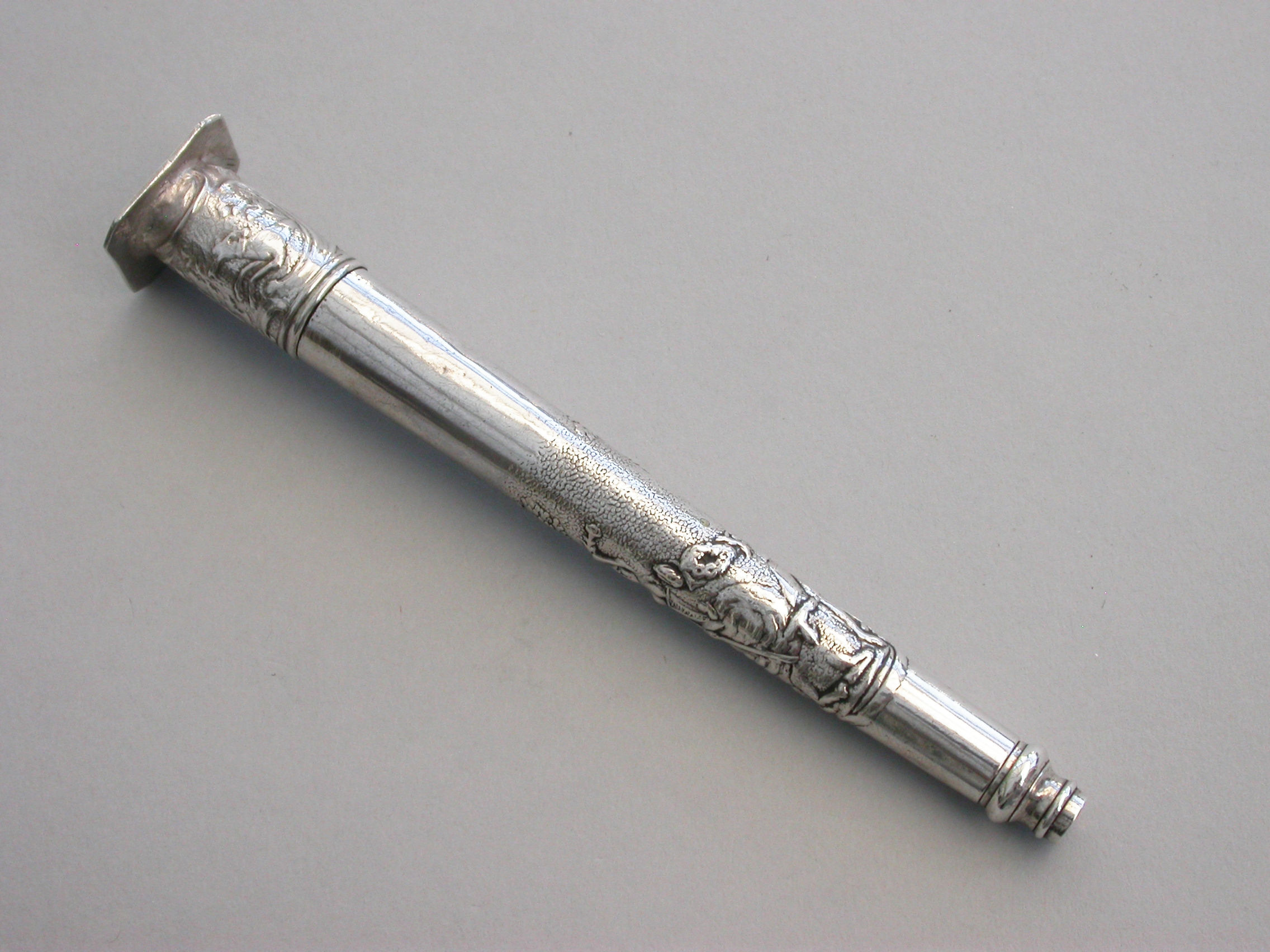 A good large Victorian silver telescopic Propelling Pencil mounted inside an early 18th century Dutch silver Needle / Bodkin Case, the body chased with a pastoral scene depicting a Shepherd and Shepherdess, the screw-off seal finial engraved with a hound chasing a deer.