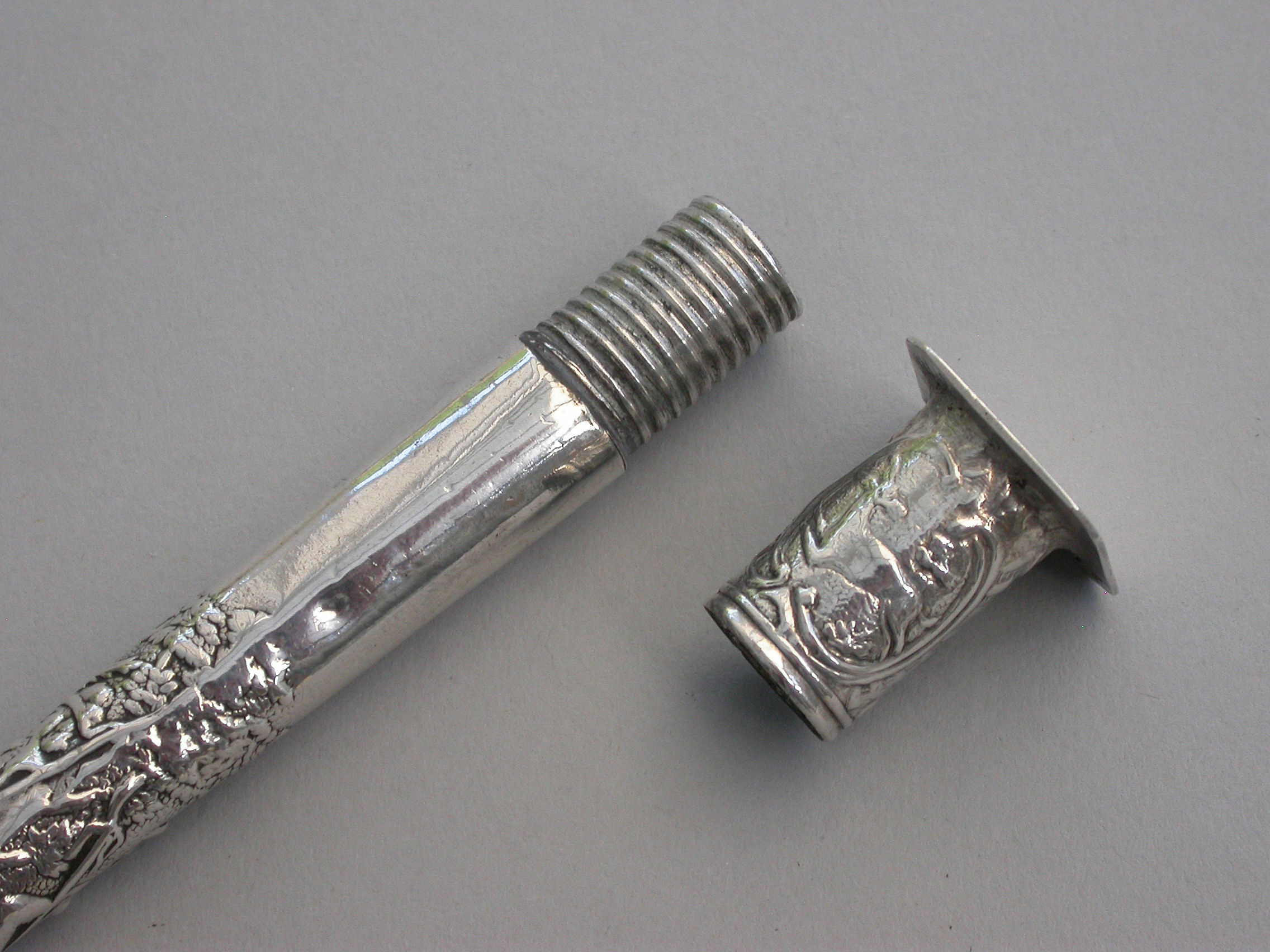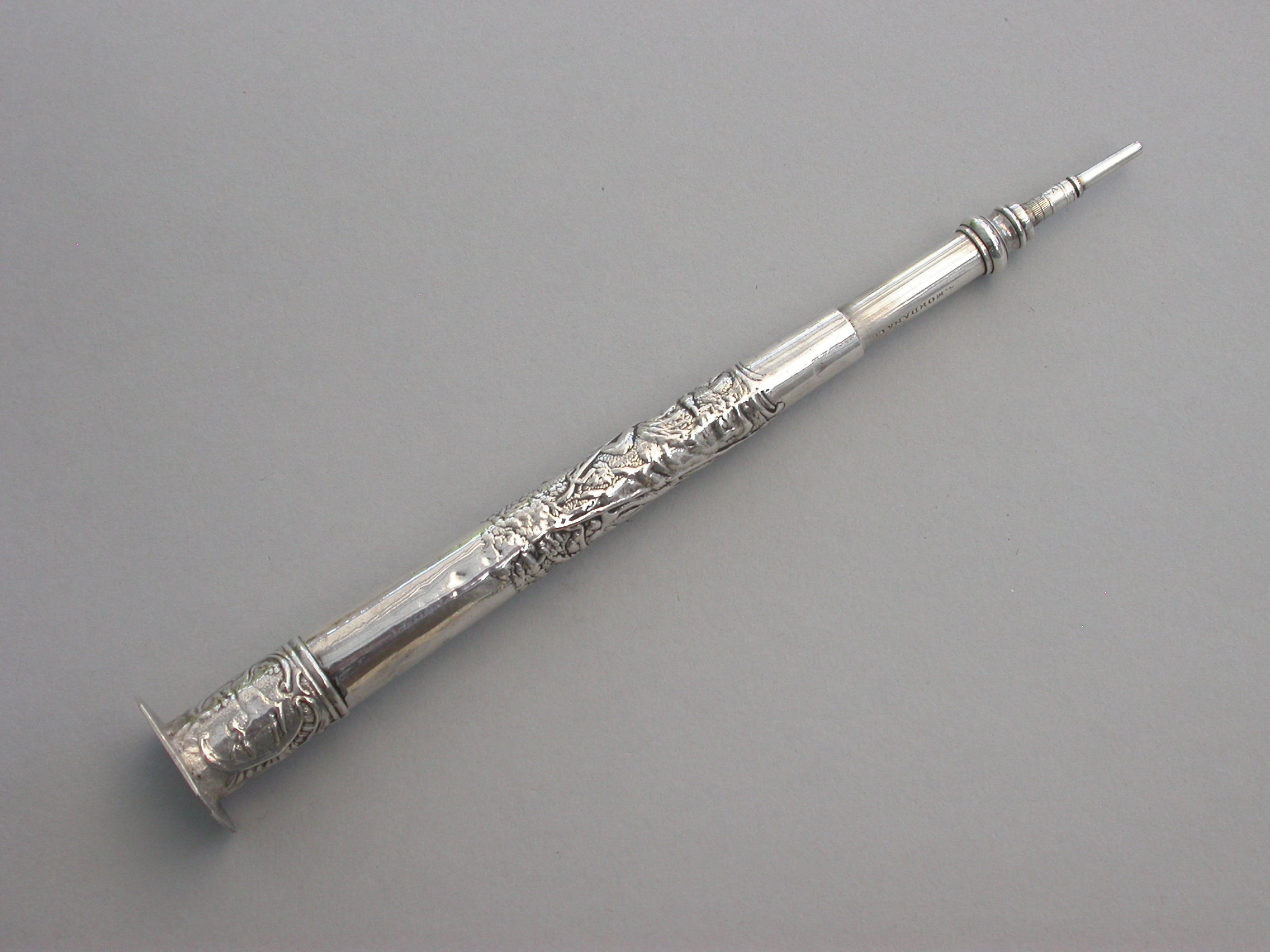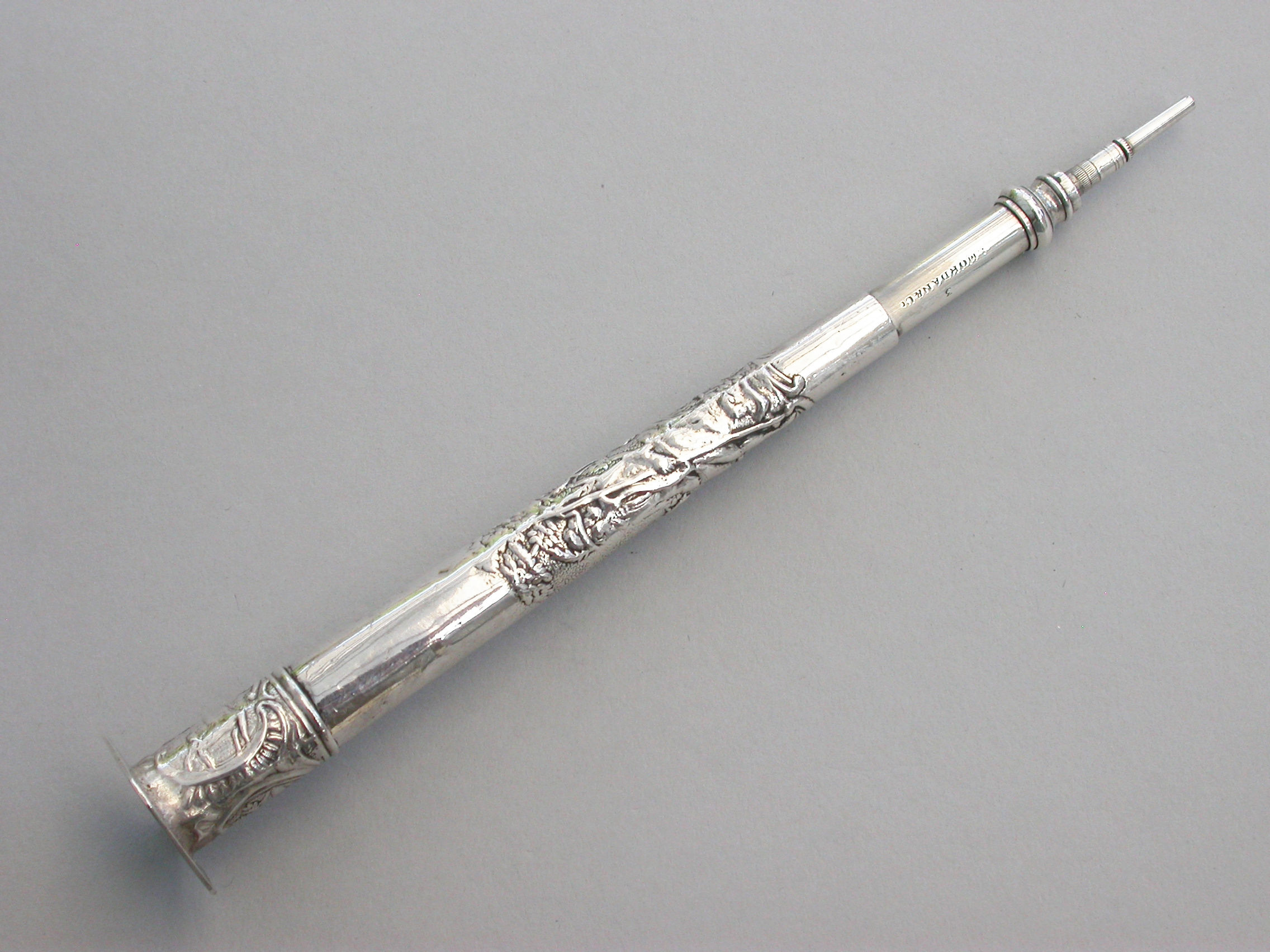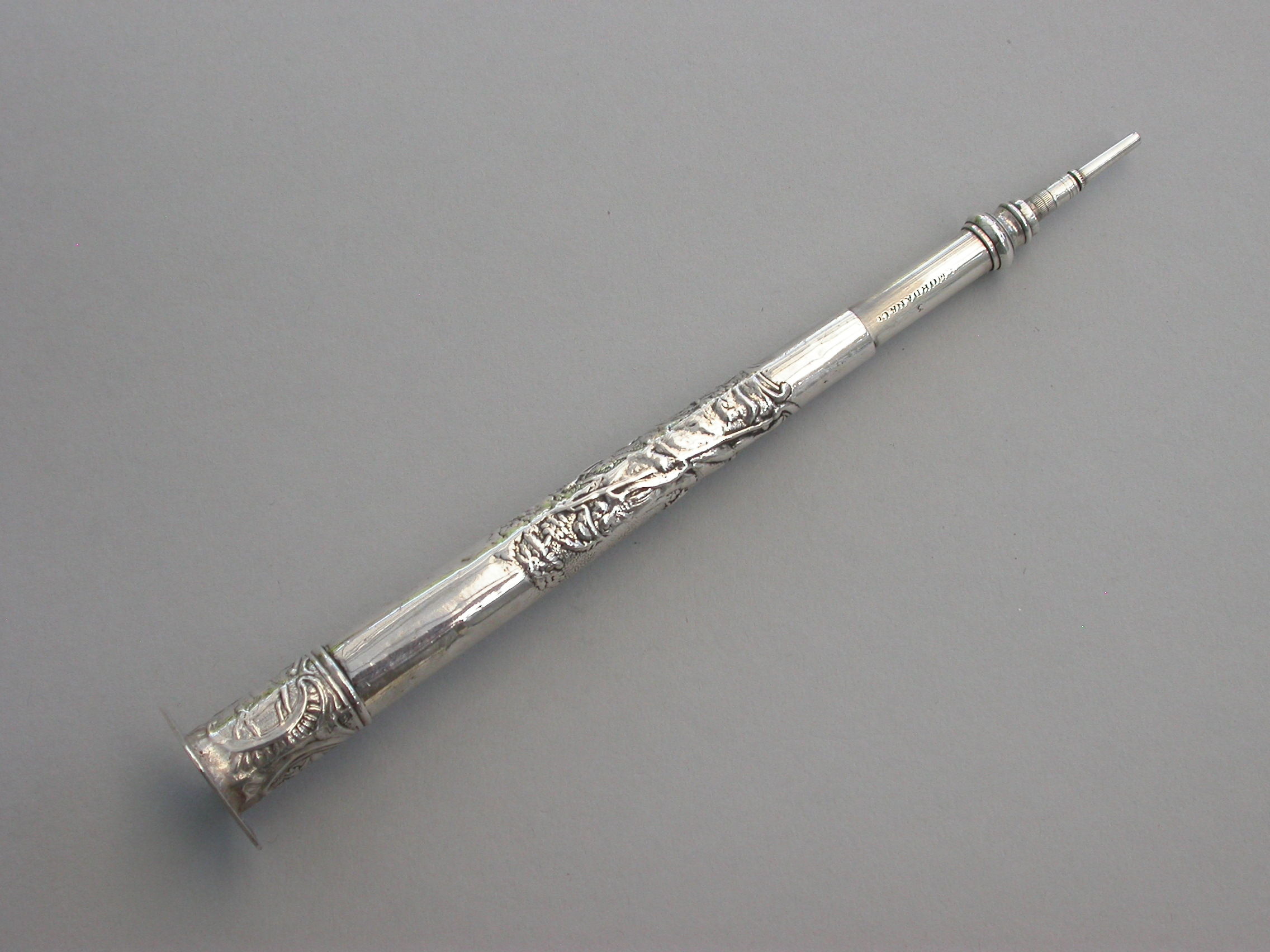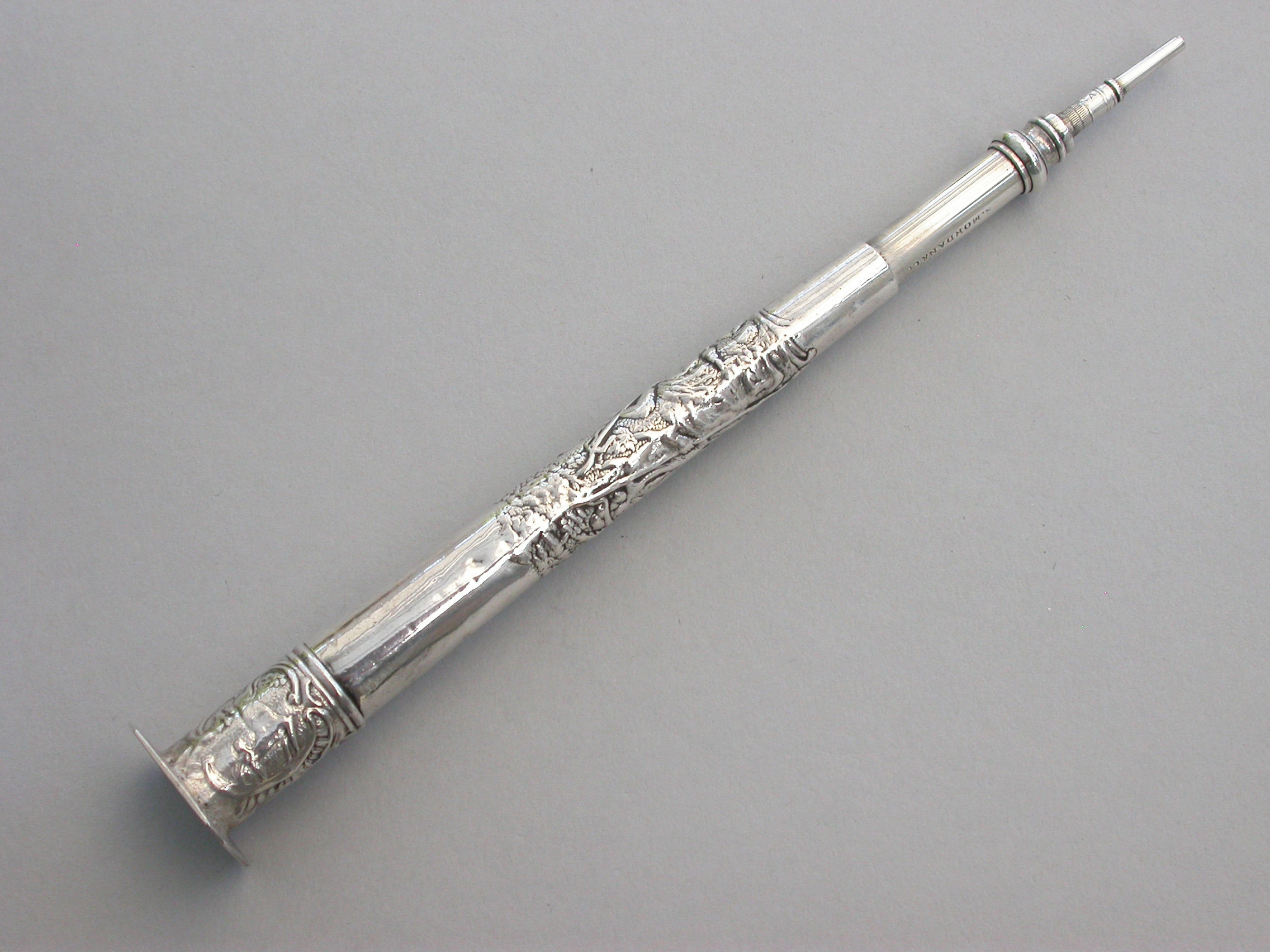 A good large Victorian silver telescopic Propelling Pencil mounted inside an early 18th century Dutch silver Needle / Bodkin Case, the body chased with a pastoral scene depicting a Shepherd and Shepherdess, the screw-off seal finial engraved with a hound chasing a deer.