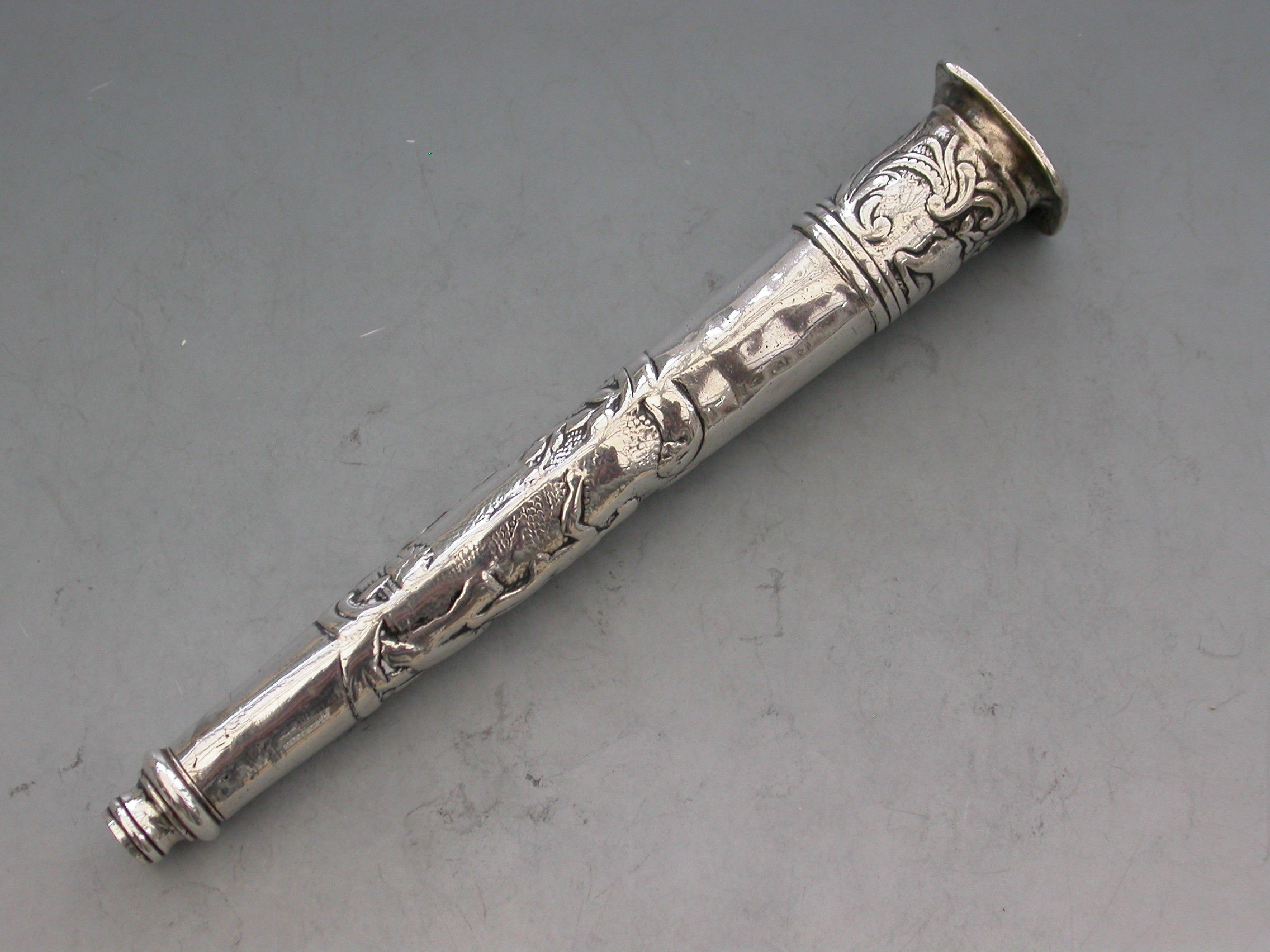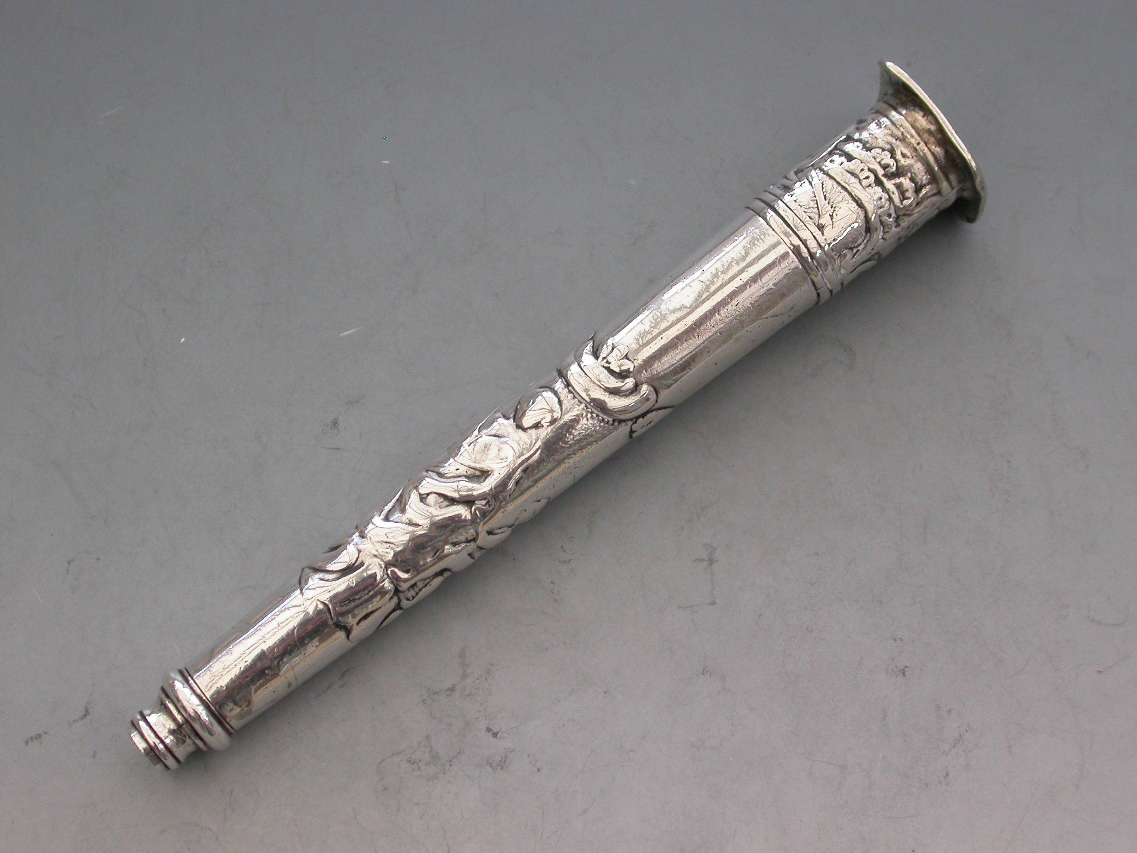 A good Victorian silver telescopic Propelling Pencil mounted inside an early 18th century Dutch silver Needle / Bodkin Case, the body chased with figures and a stag in woodland landscape, the screw-off seal finial engraved with a cypher.