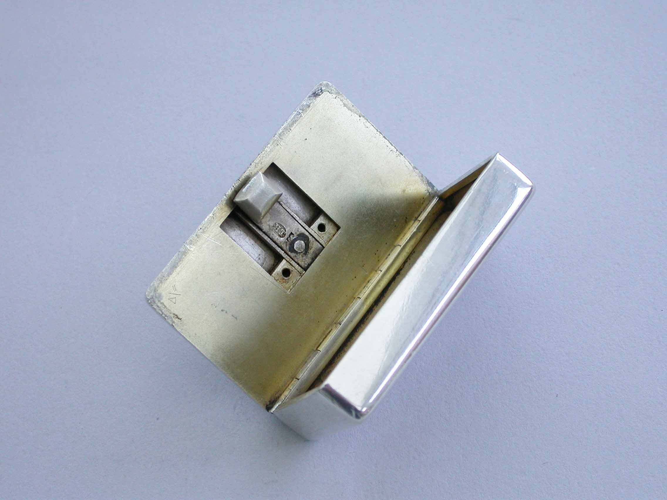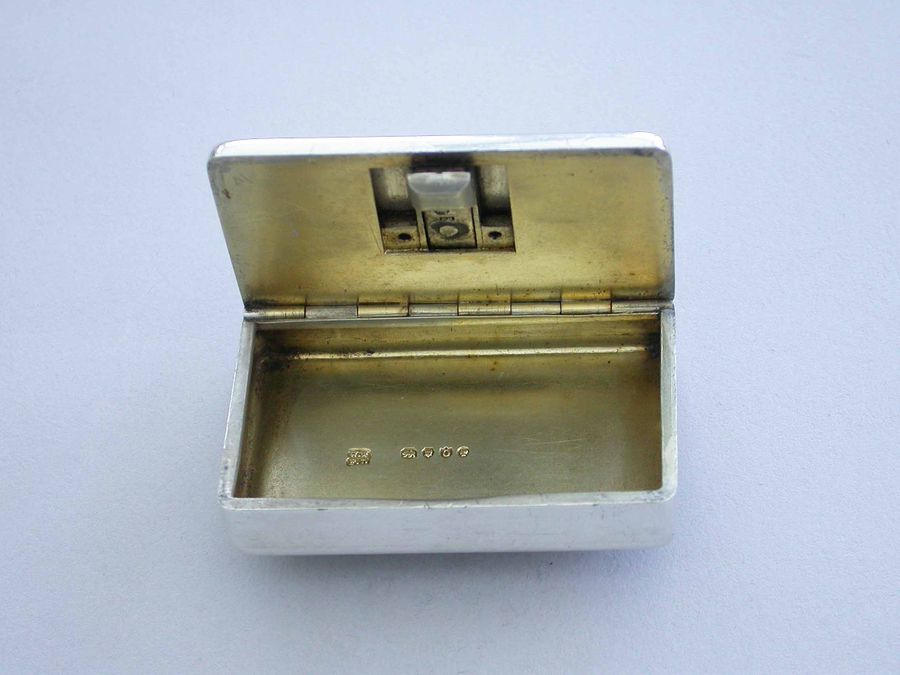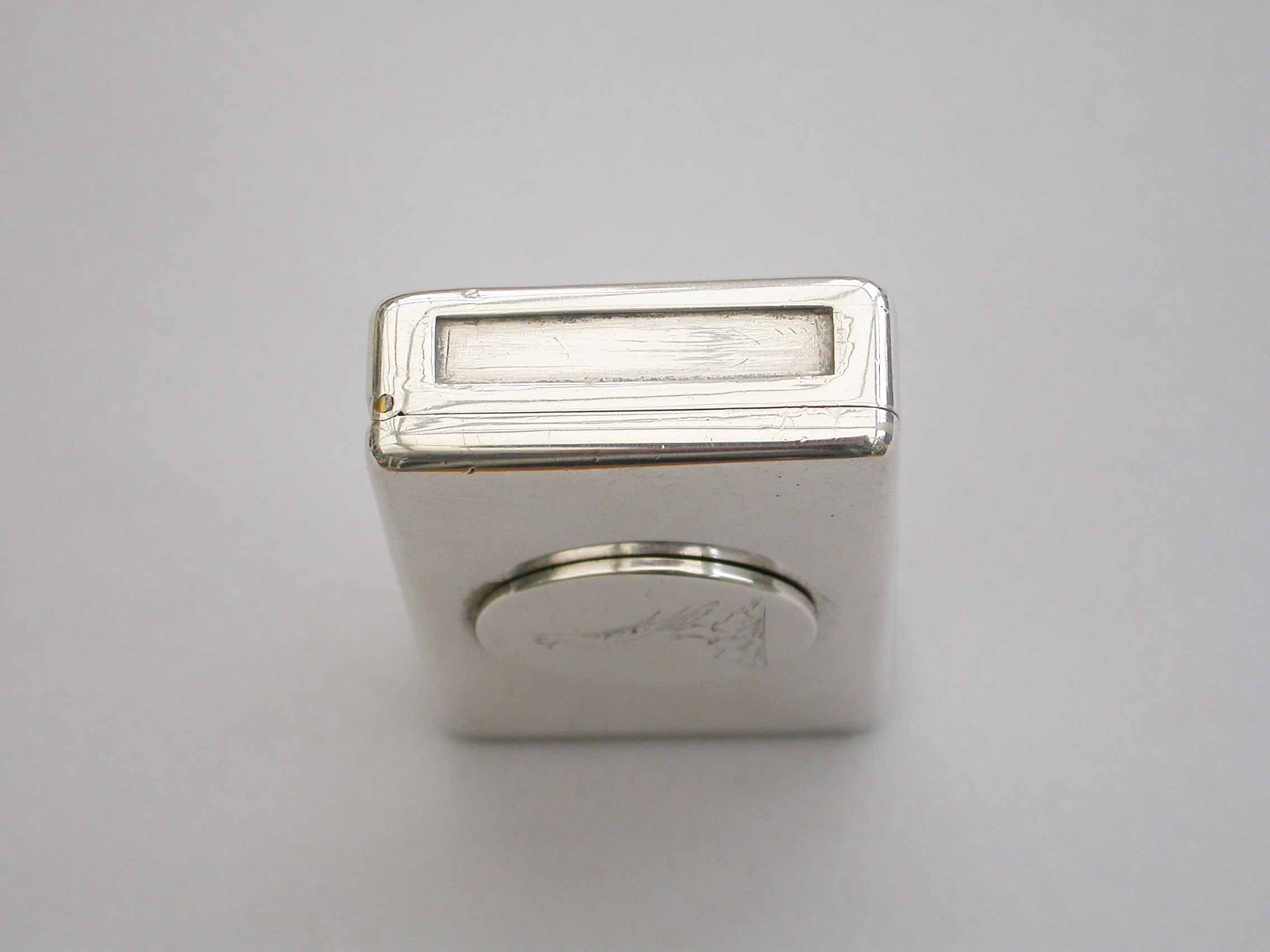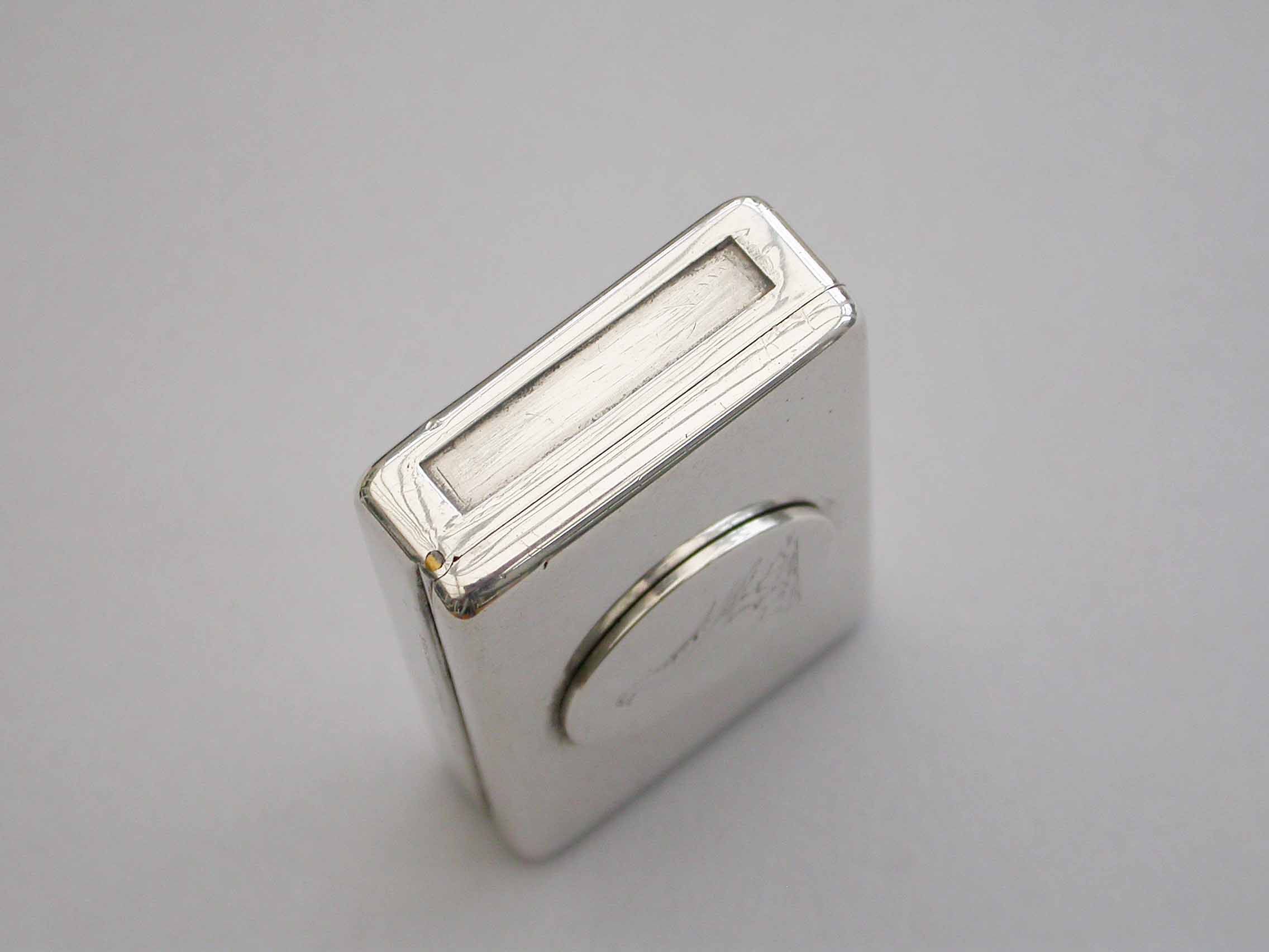 An unusual Victorian silver Trick Opening Vesta Case of rounded rectangular form, a circular plaque to the lid engraved with a crest of an heraldic bird. This can be slid upwards to release the sprung opening catch. Silver gilt interior and a recess to one side to hold the striker.