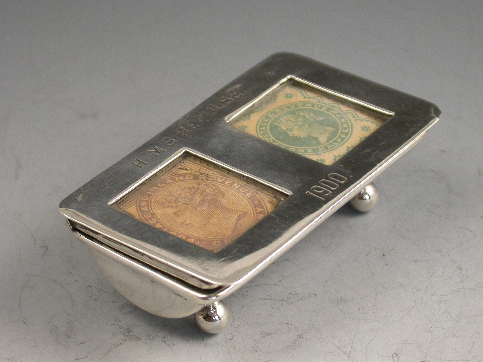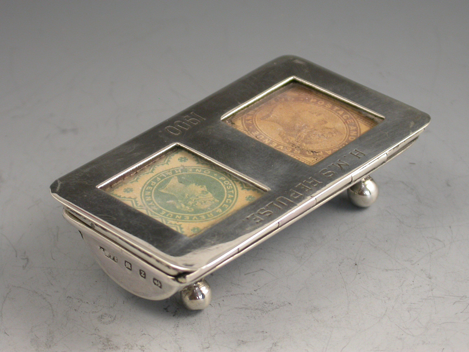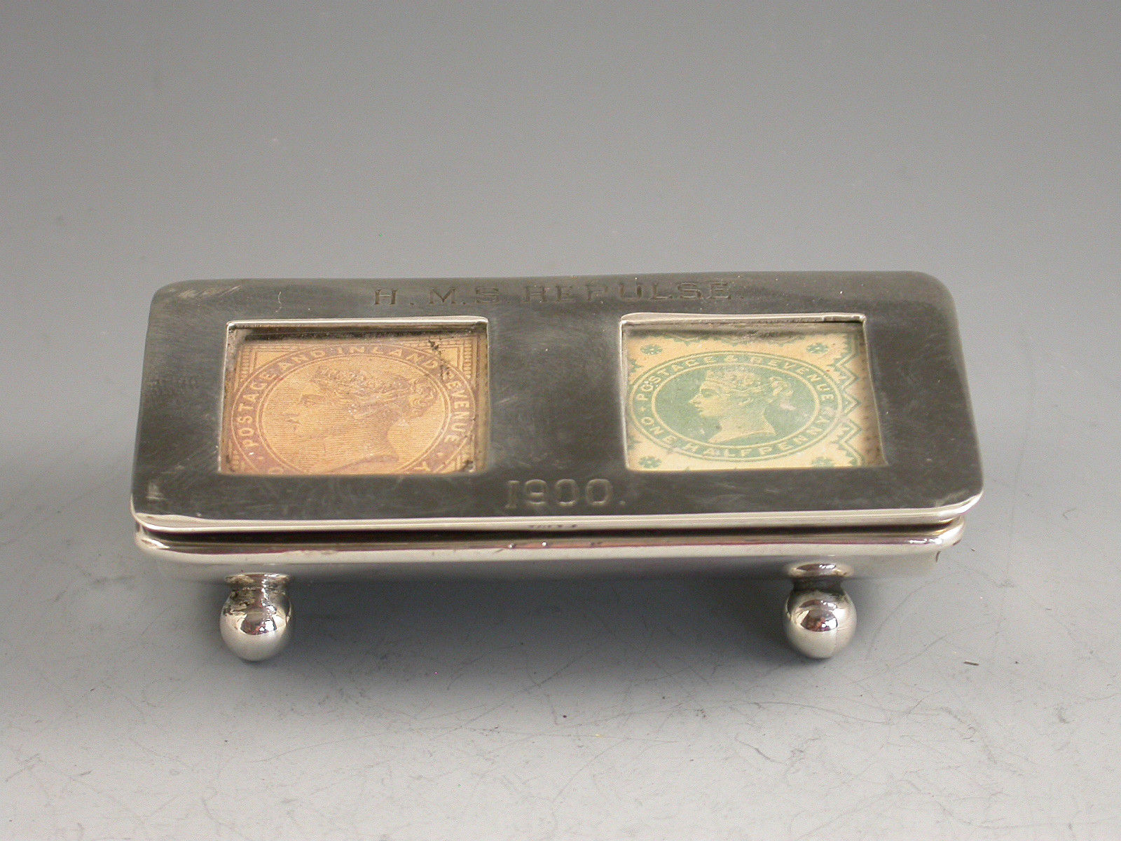 A good Victorian silver twin compartment Stamp Box of trough form, standing on four ball feet, the sprung hinged lid opening to reveal a silver gilt interior, the flat lid with two glazed compartments holding Victorian one penny lilac and half penny green stamps. The lid engraved - H.M.S. Repulse 1900.