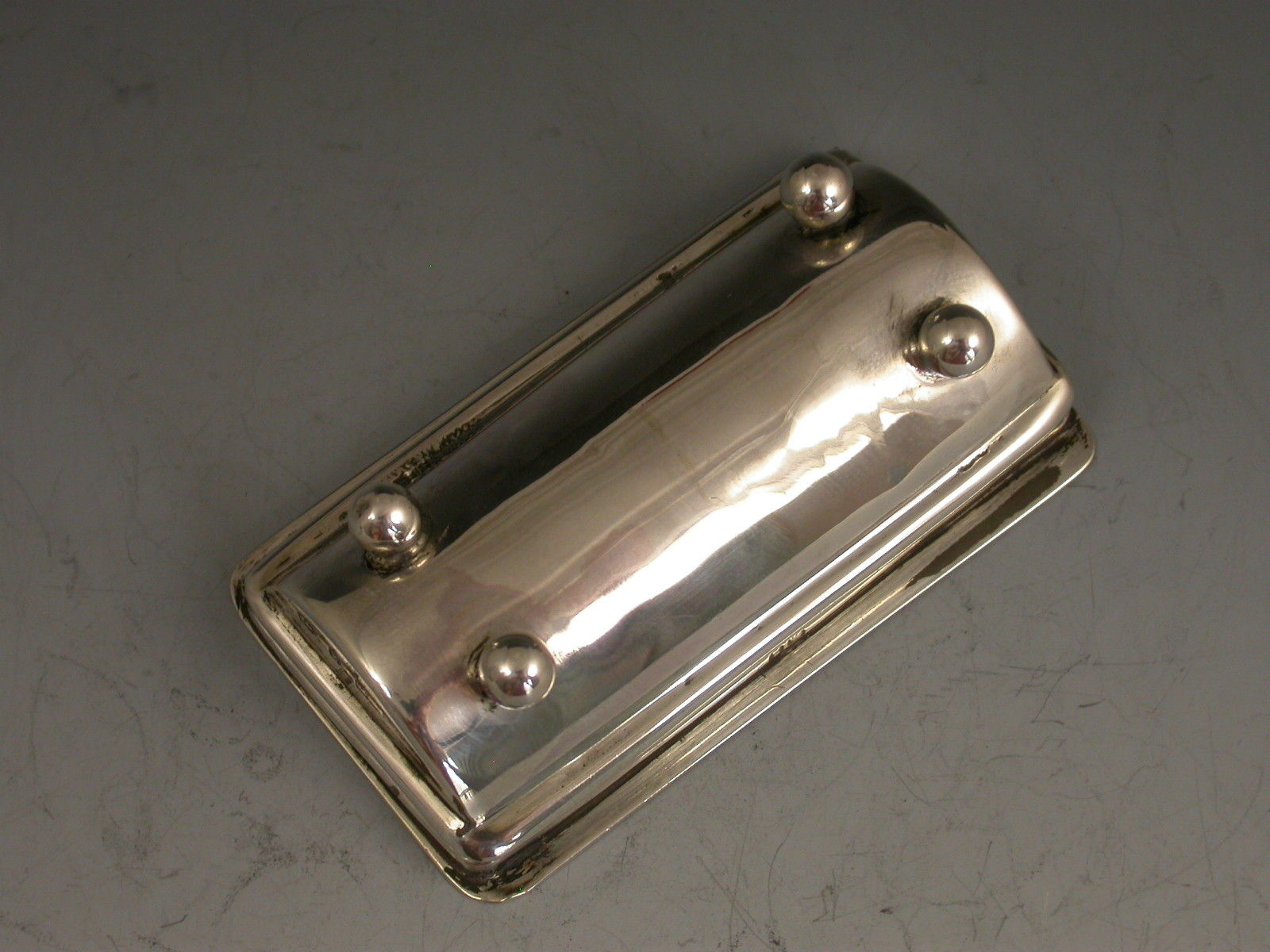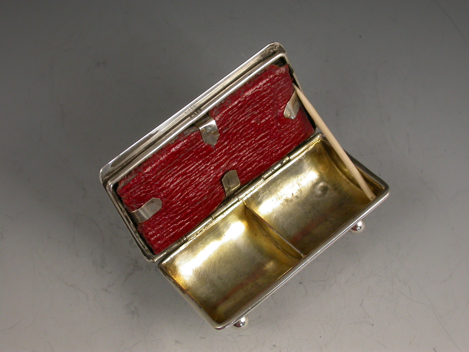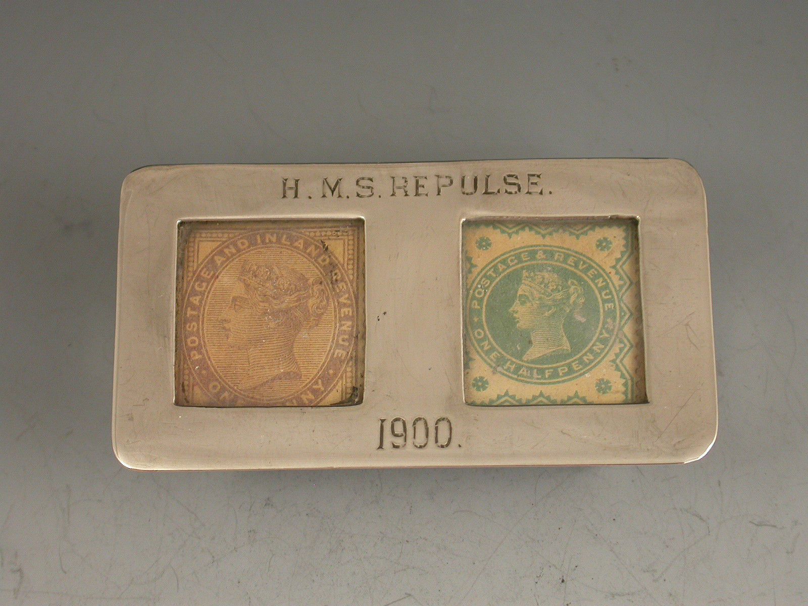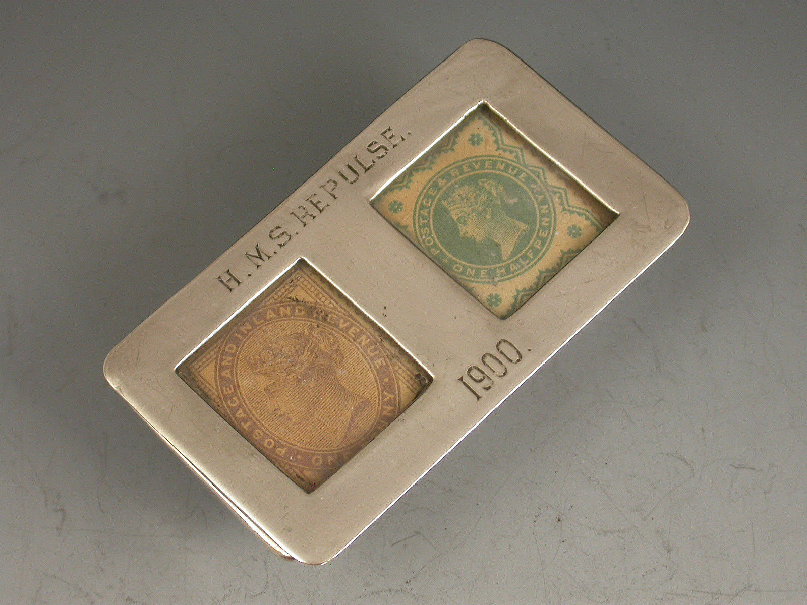A good Victorian silver twin compartment Stamp Box of trough form, standing on four ball feet, the sprung hinged lid opening to reveal a silver gilt interior, the flat lid with two glazed compartments holding Victorian one penny lilac and half penny green stamps. The lid engraved - H.M.S. Repulse 1900.