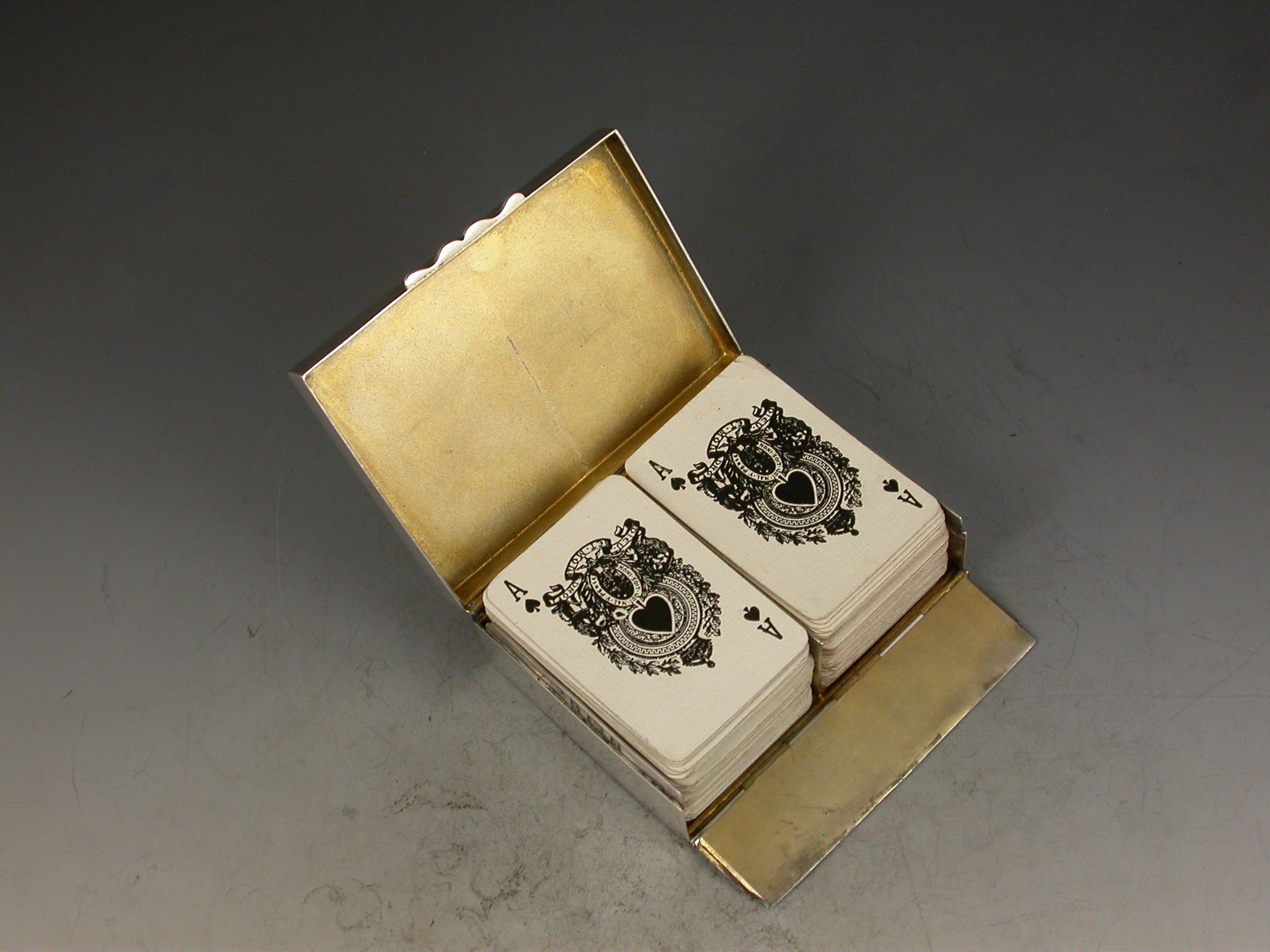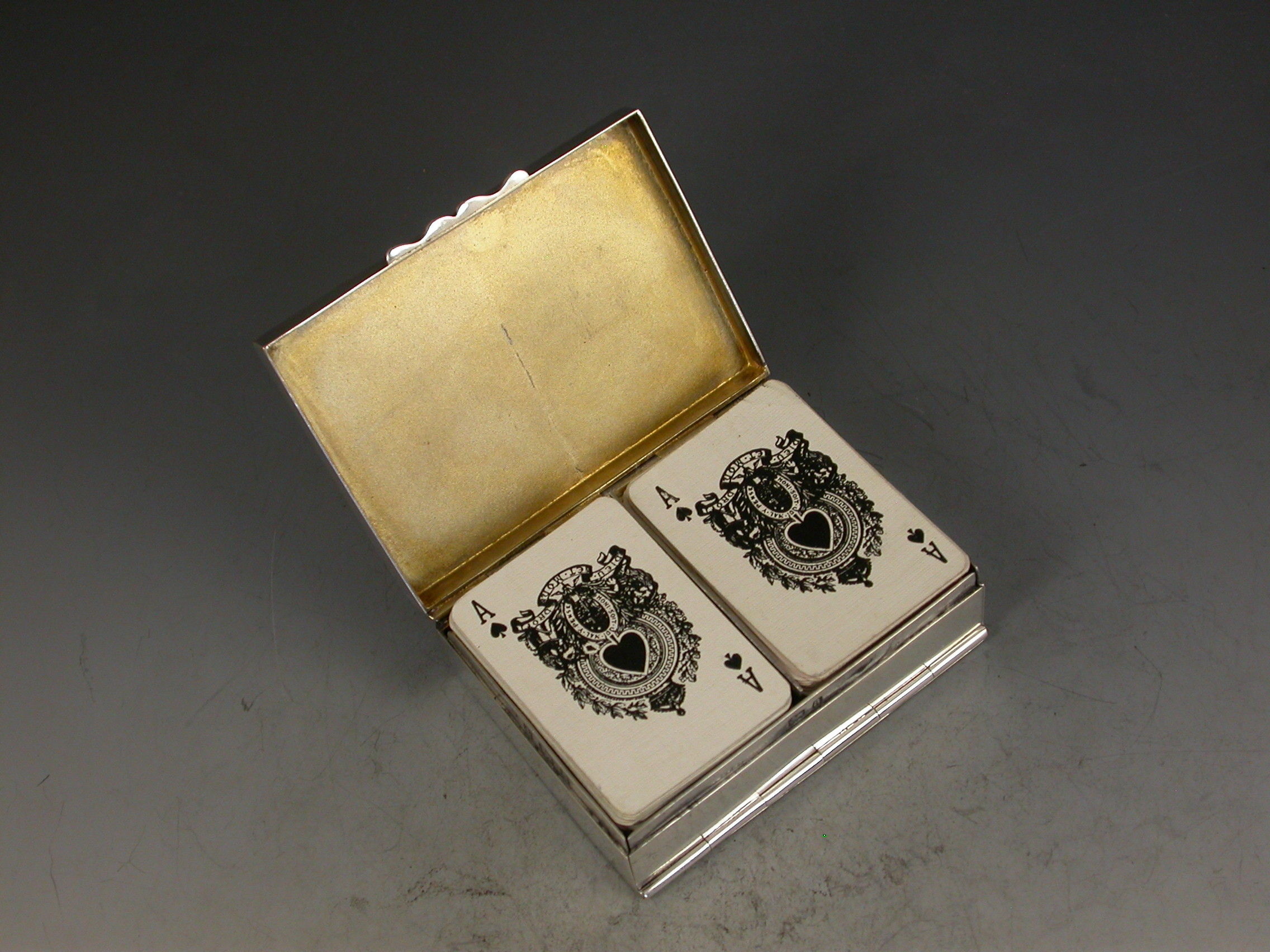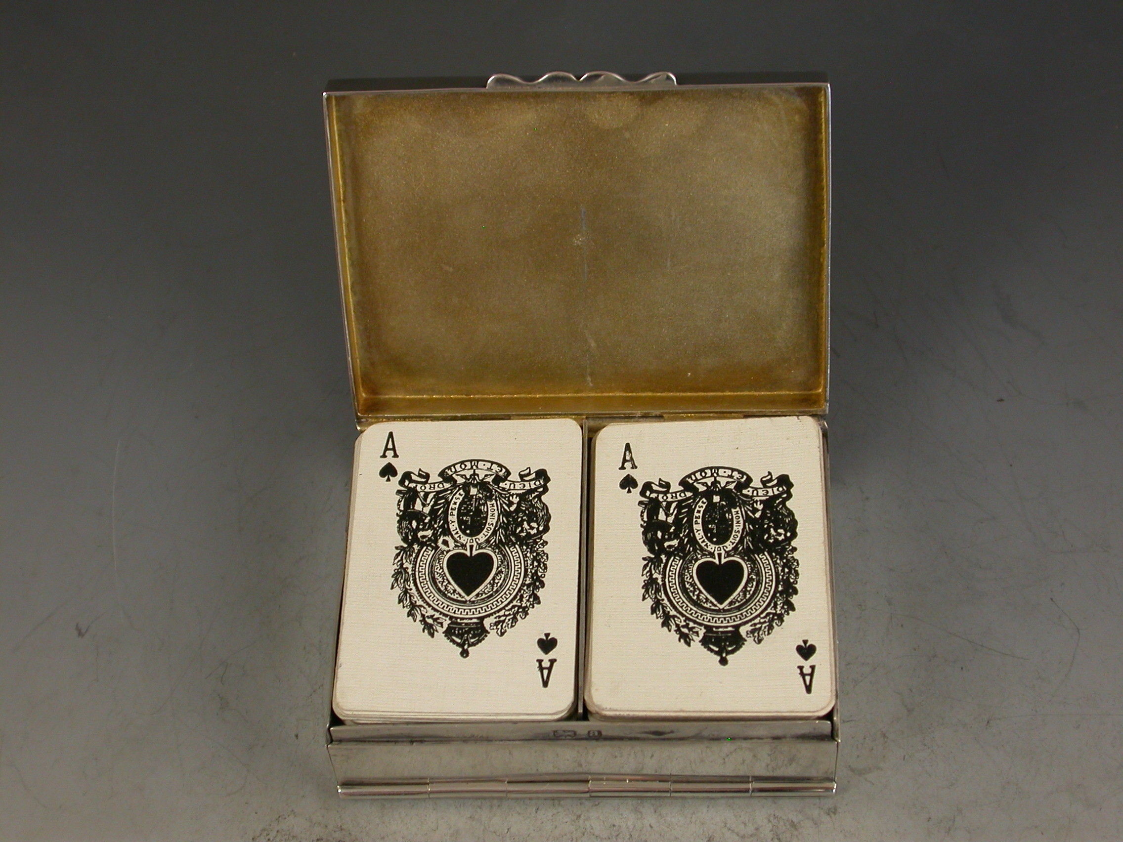 A good Victorian silver twin-pack miniature Playing Cards Box of plain oblong form with hinged cover and fall-down front, containing two packs of contemporary miniature playing cards the backs embossed with Nelson's Victory and Drake's Revenge, the ace of spades with Victorian Crown, Coat of Arms and motto.