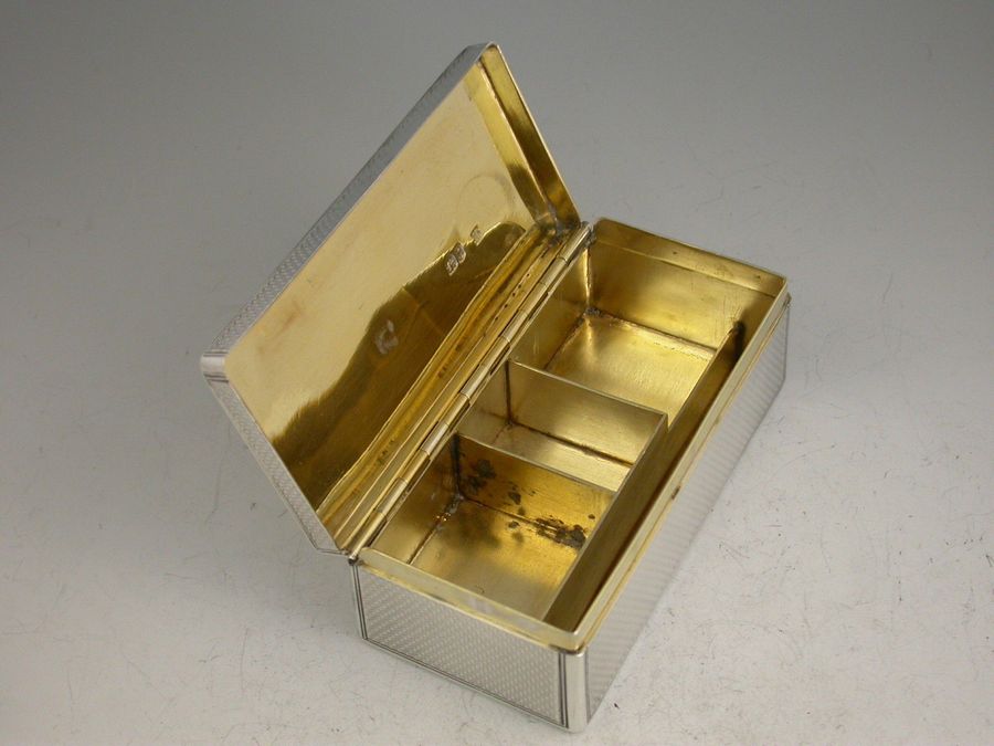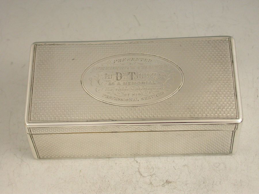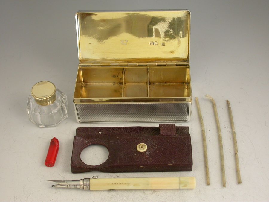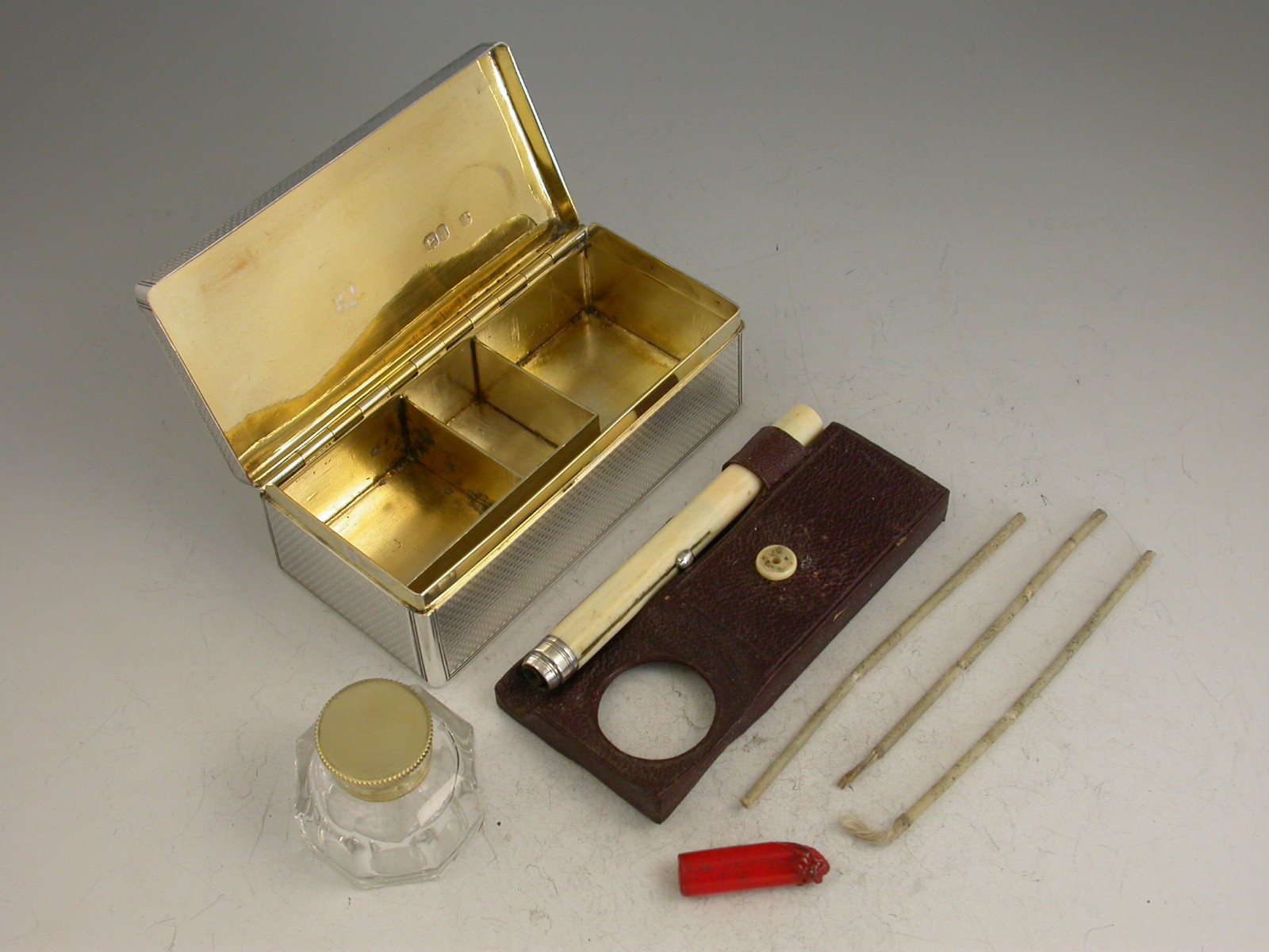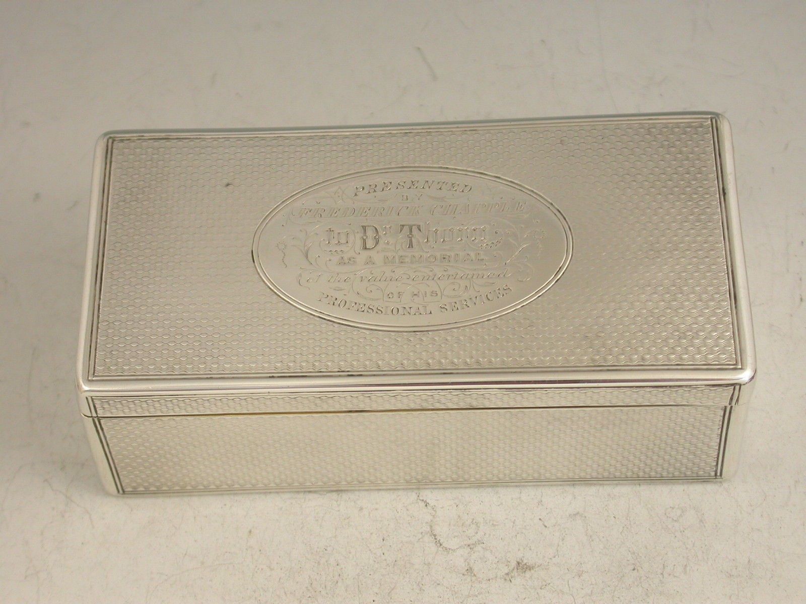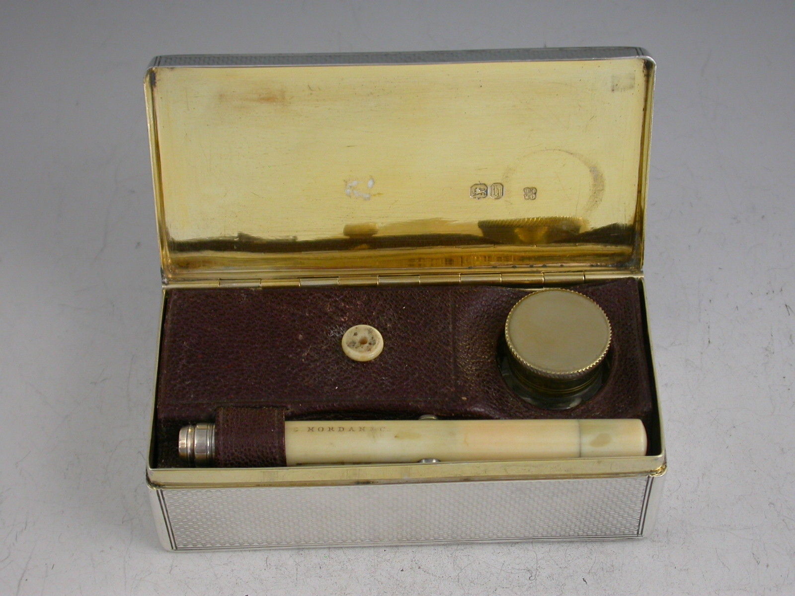 An unusual Victorian silver Writing Box of rectangular form with all over engine turned decoration, an oval cartouche to the lid engraved with a contemporary medical presentation inscription. The silver gilt interior with four compartments for inkwell, tapers, seals and sealing wax, all covered with a leather platform holding a silver mounted ivory sliding dip pen and propelling pencil, by Sampson Mordan & Co, with screw off lid concealing a lead reservoir.