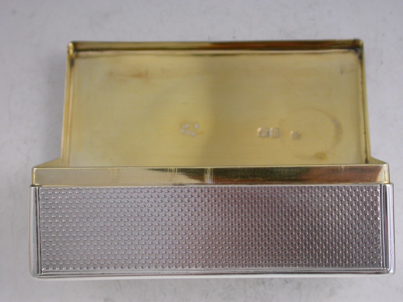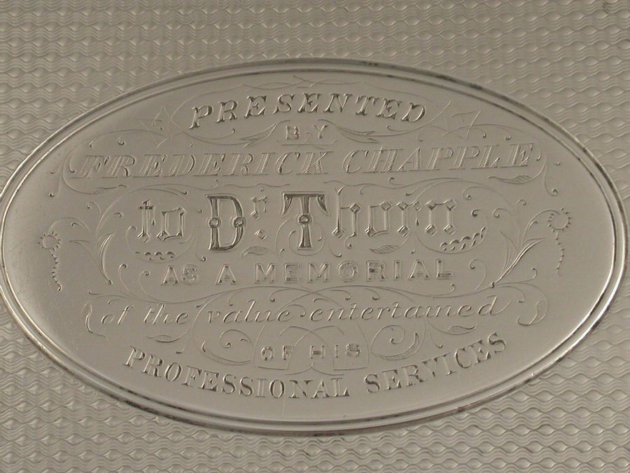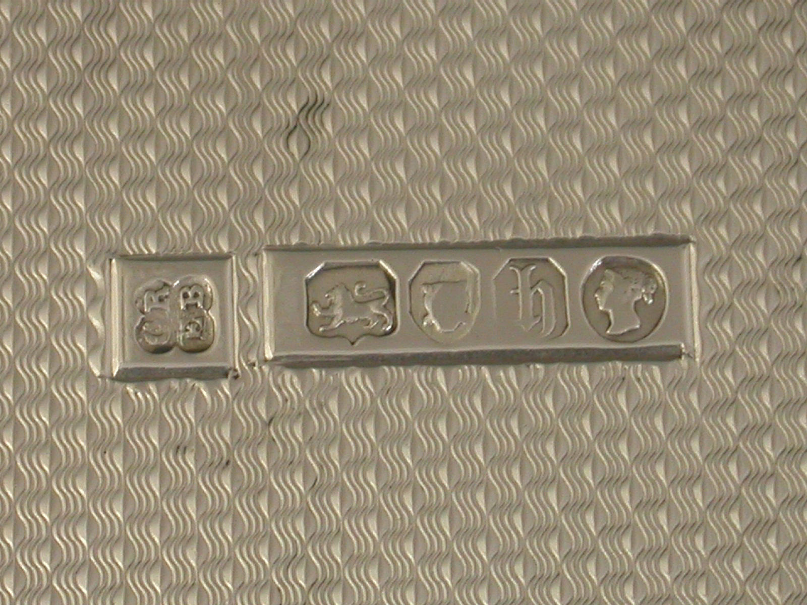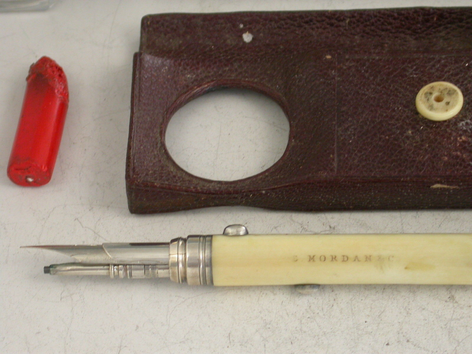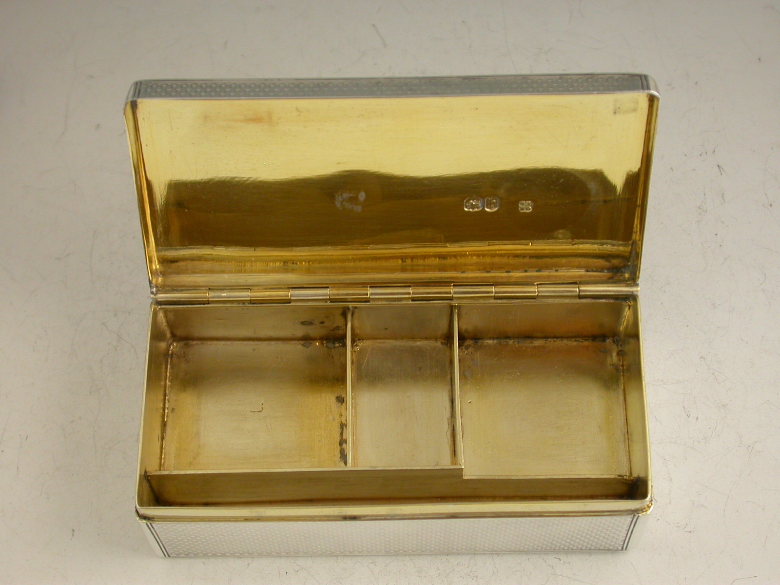 An unusual Victorian silver Writing Box of rectangular form with all over engine turned decoration, an oval cartouche to the lid engraved with a contemporary medical presentation inscription. The silver gilt interior with four compartments for inkwell, tapers, seals and sealing wax, all covered with a leather platform holding a silver mounted ivory sliding dip pen and propelling pencil, by Sampson Mordan & Co, with screw off lid concealing a lead reservoir.