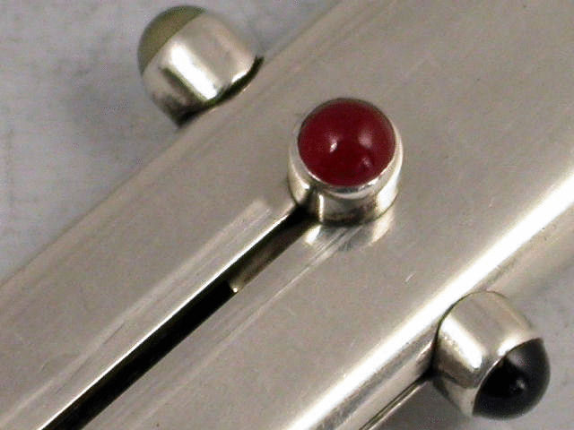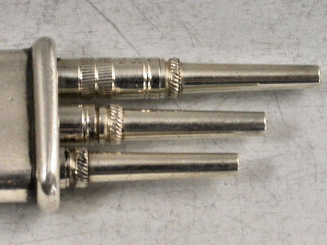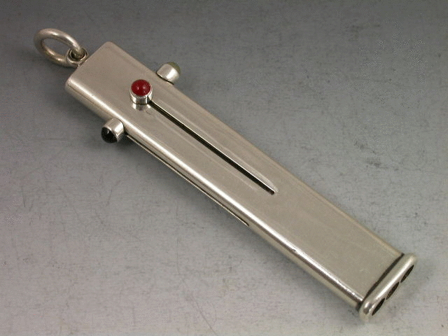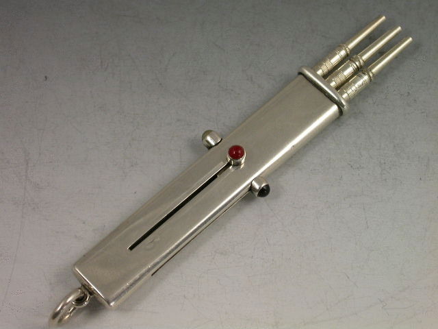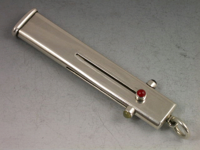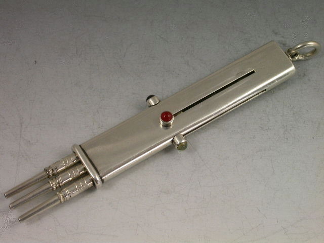 A good early 20th century three colour Extending Pencil of rounded rectangular form, the central slide action mechanism with red glass terminal, one side with cream terminal and the other with black. Attached suspension ring.