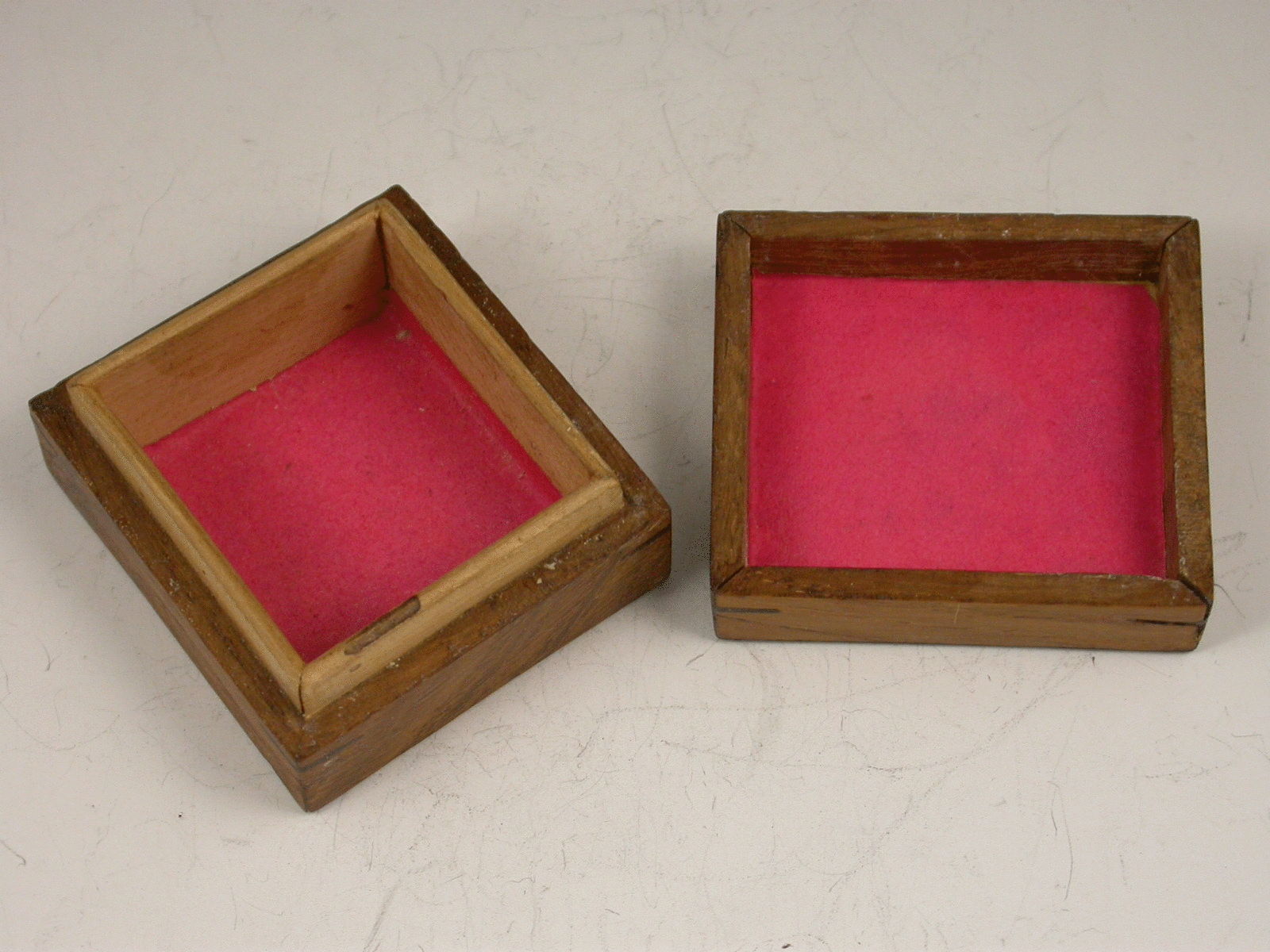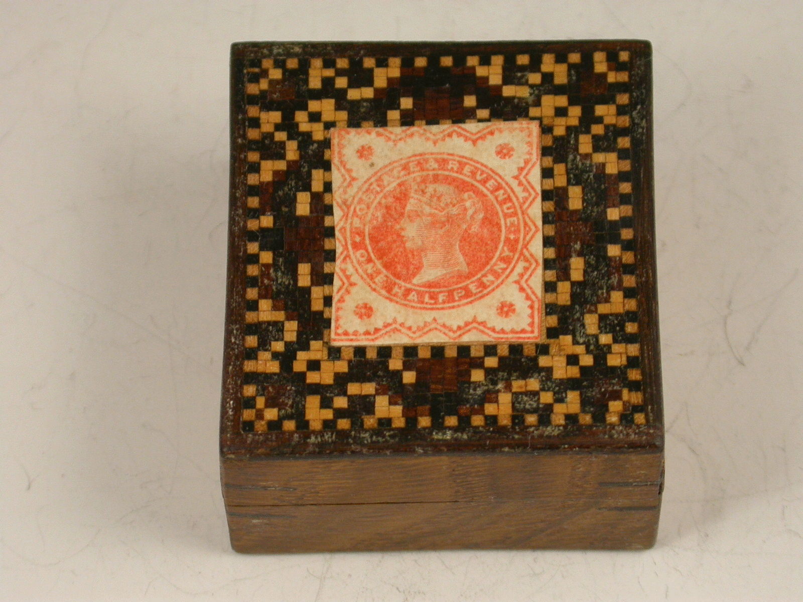 A mid 19th century Tunbridgeware rectangular wooden Stamp Box, the lid inlaid with a mosaic pattern and a ½ d vermilion Victorian stamp.