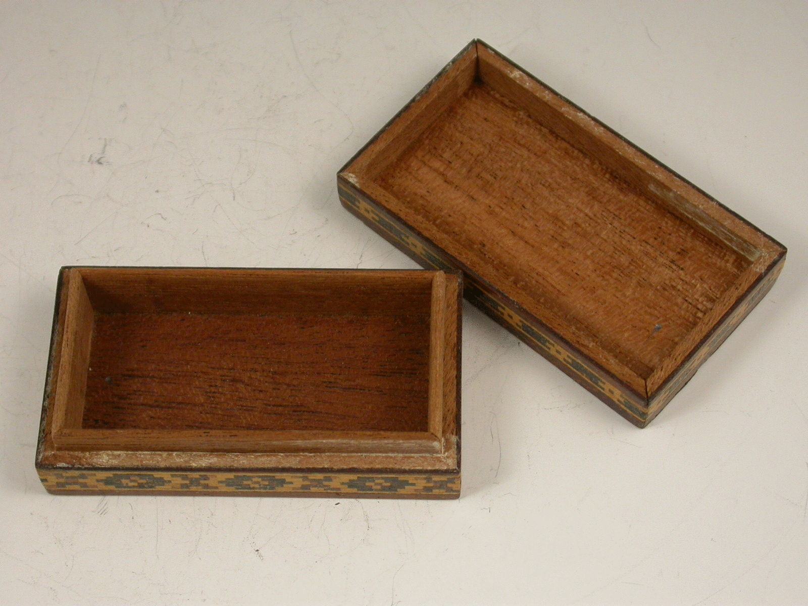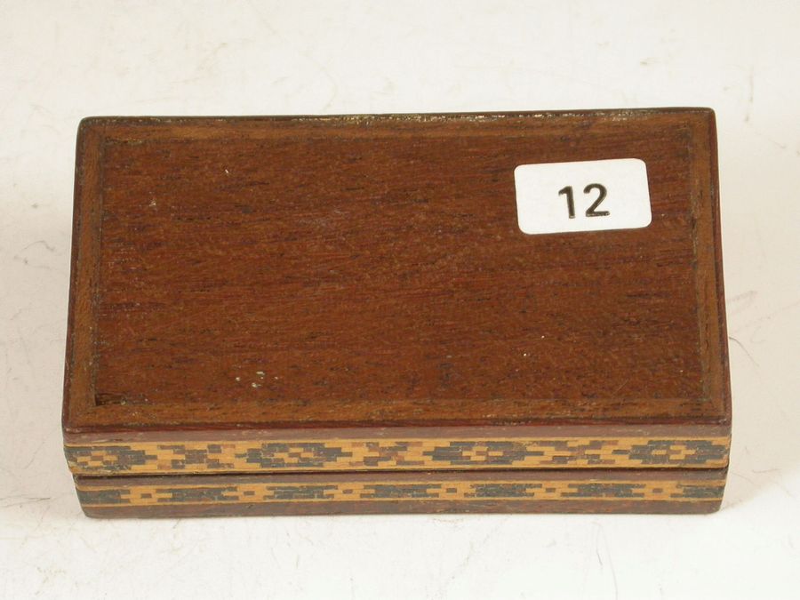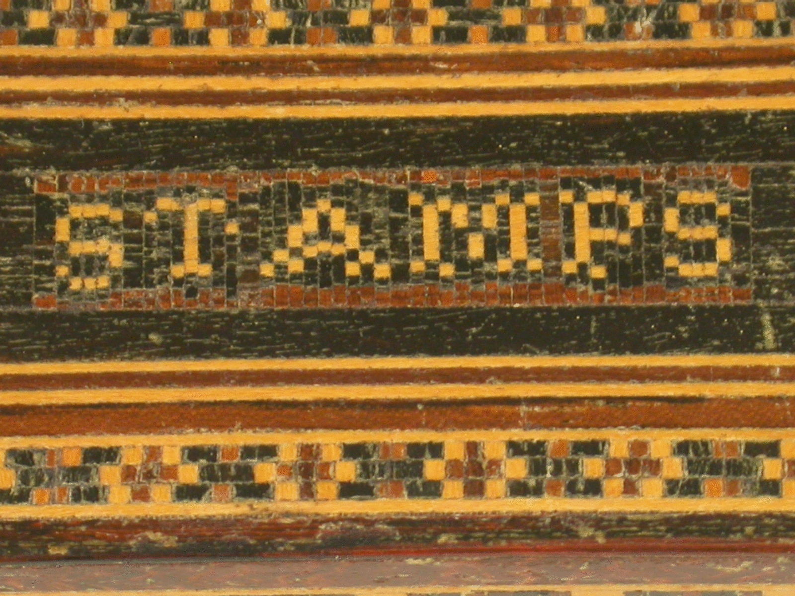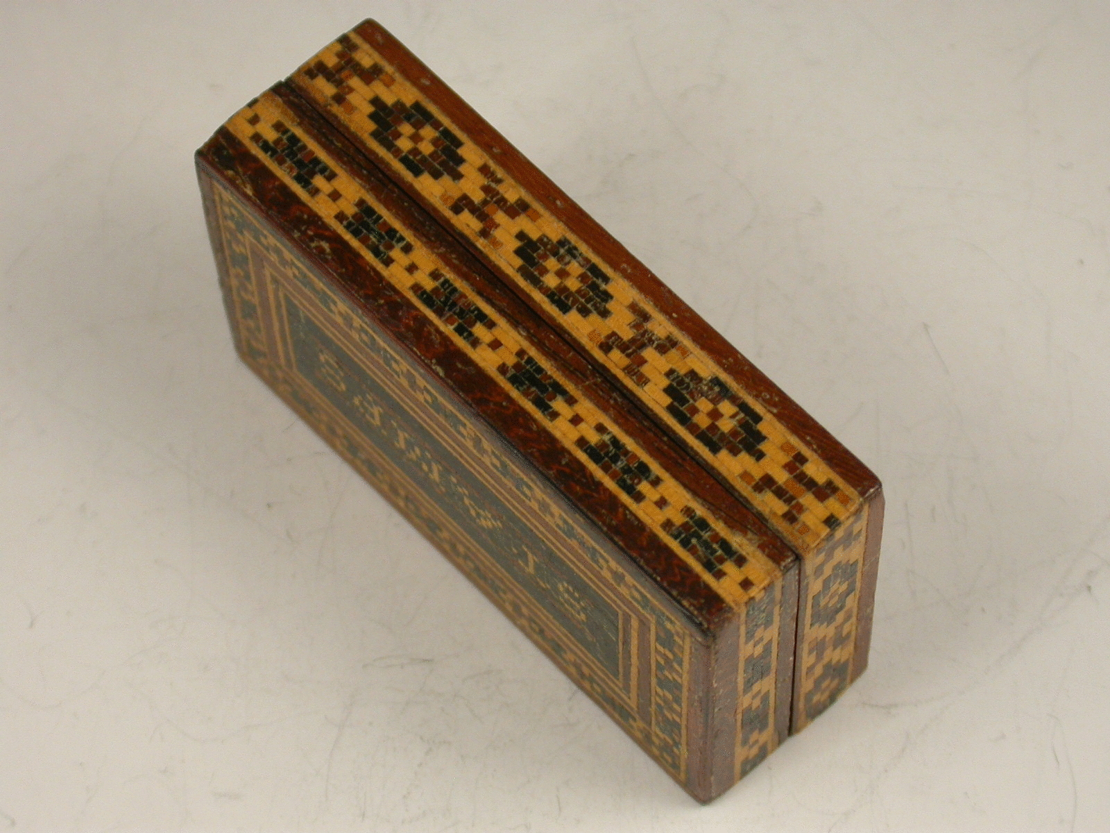 A late 19th century Tunbridgeware rectangular wooden Stamp Box, the lid and sides inlaid with a mosaic patterns, the lid with the word stamps.