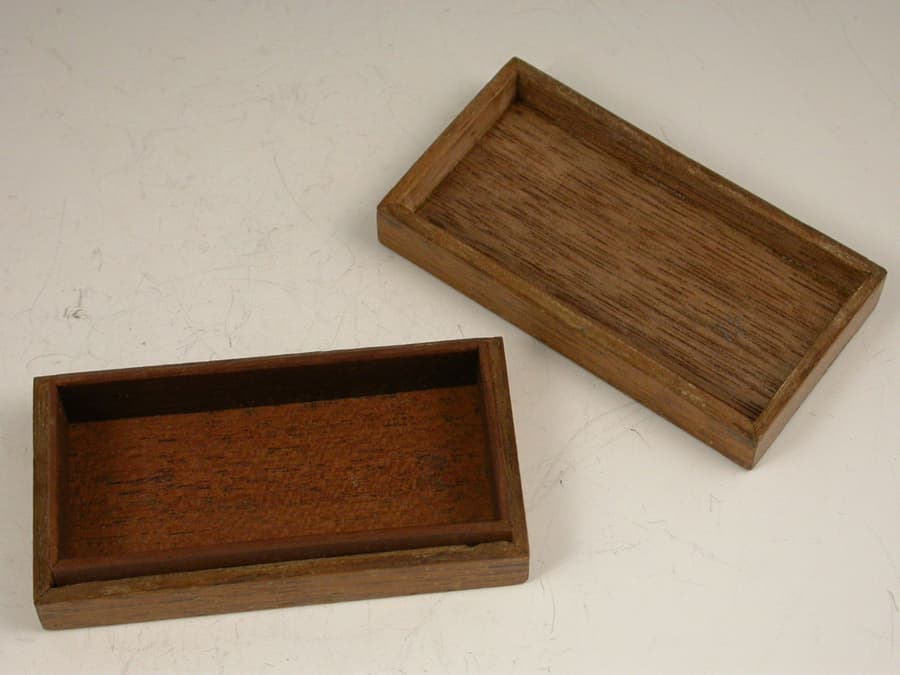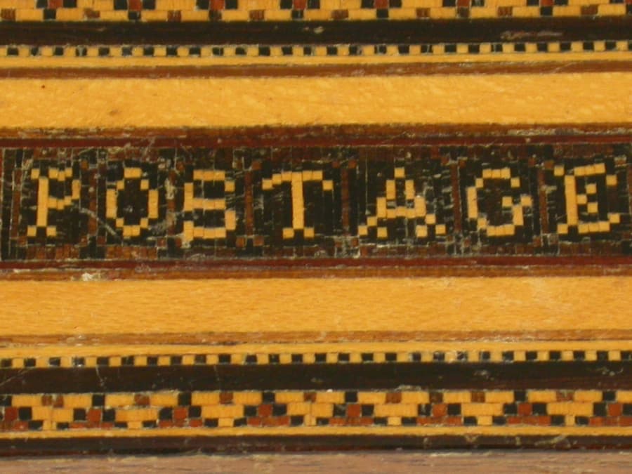 A late 19th century Tunbridgeware rectangular wooden Stamp Box, the lid inlaid with mosaic patterns and the word postage.