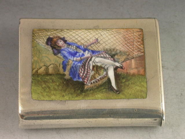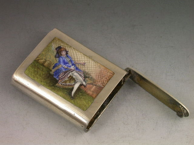 A rare Victorian silver and enamel Vesta Case of rounded rectangular form with hinged flat flip top lid, the finely enamelled panel to the front depicting a pretty girl in a blue dress laying back on a hammock in a garden scene.