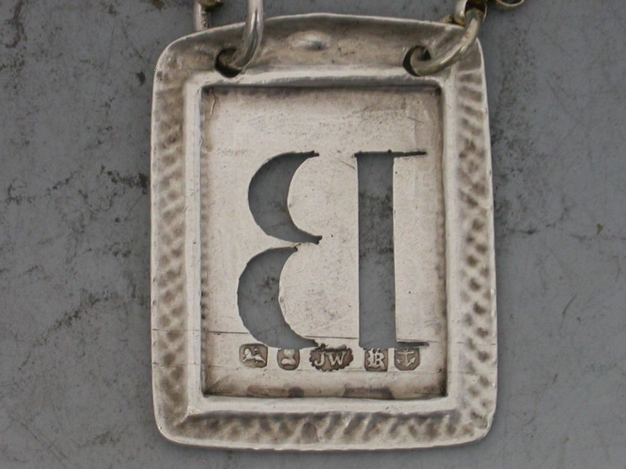A good William IV rectangular silver Wine Label of ""postage stamp"" form pierced with an initial letter 'B', the border of Ouroboros form (a snake eating its own tail).