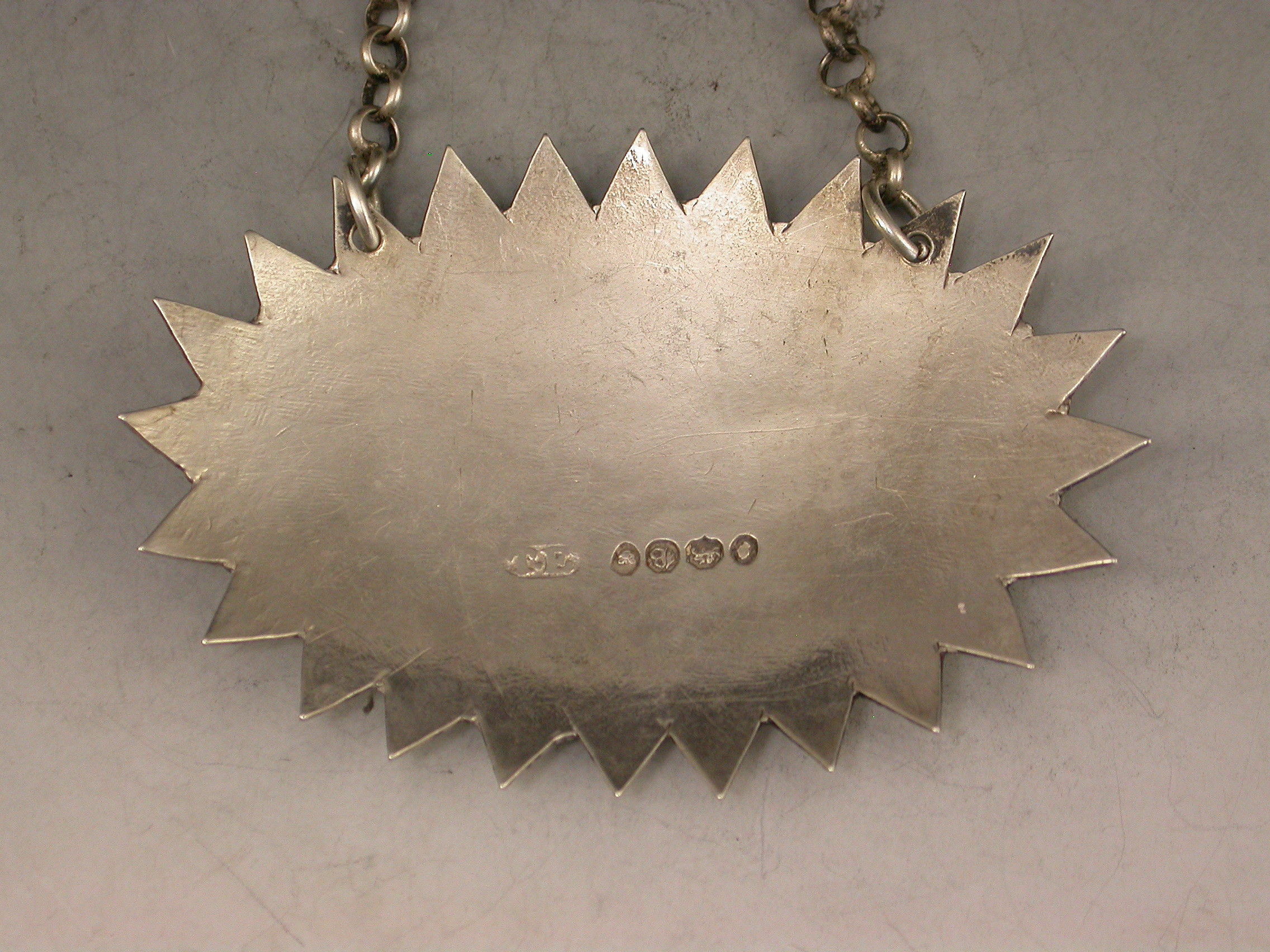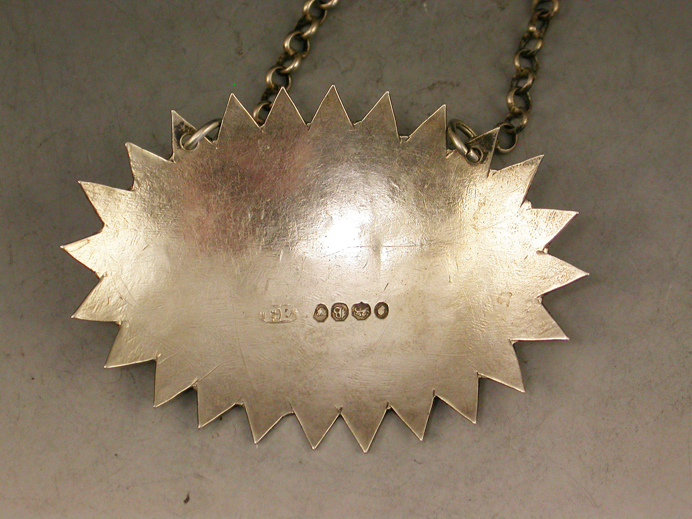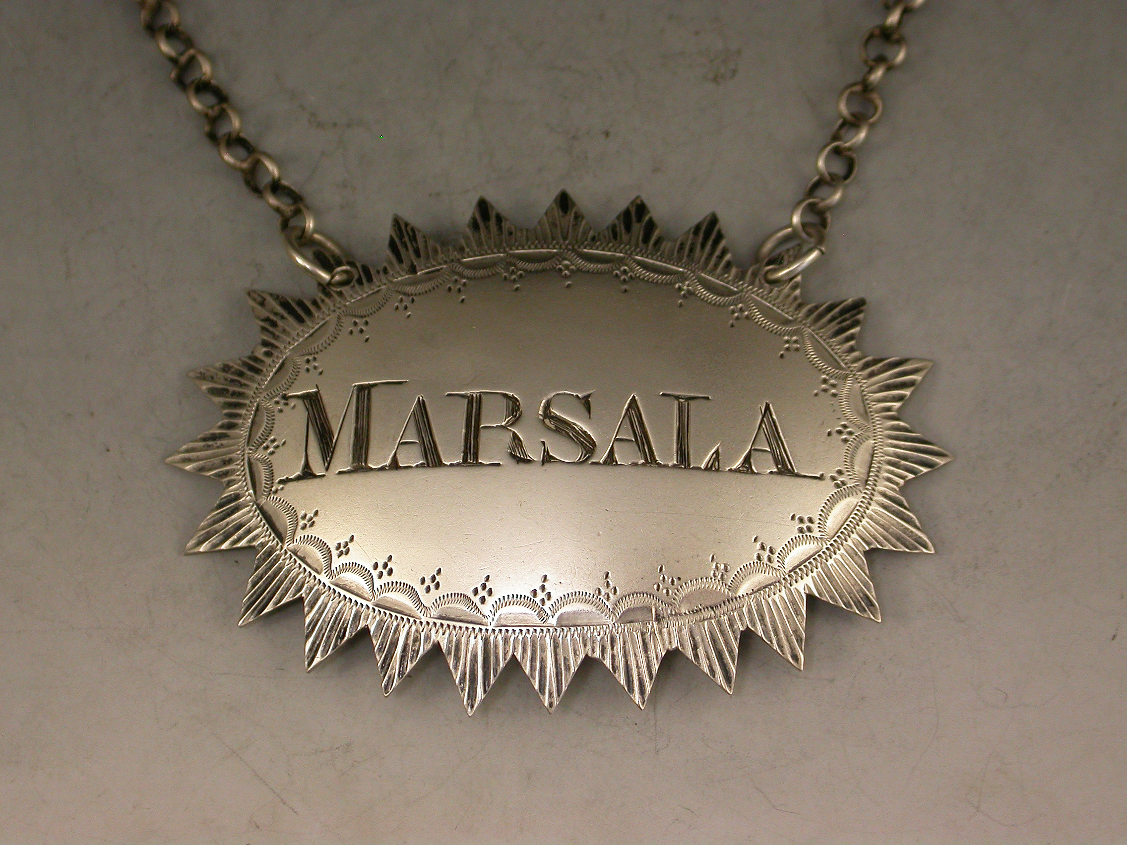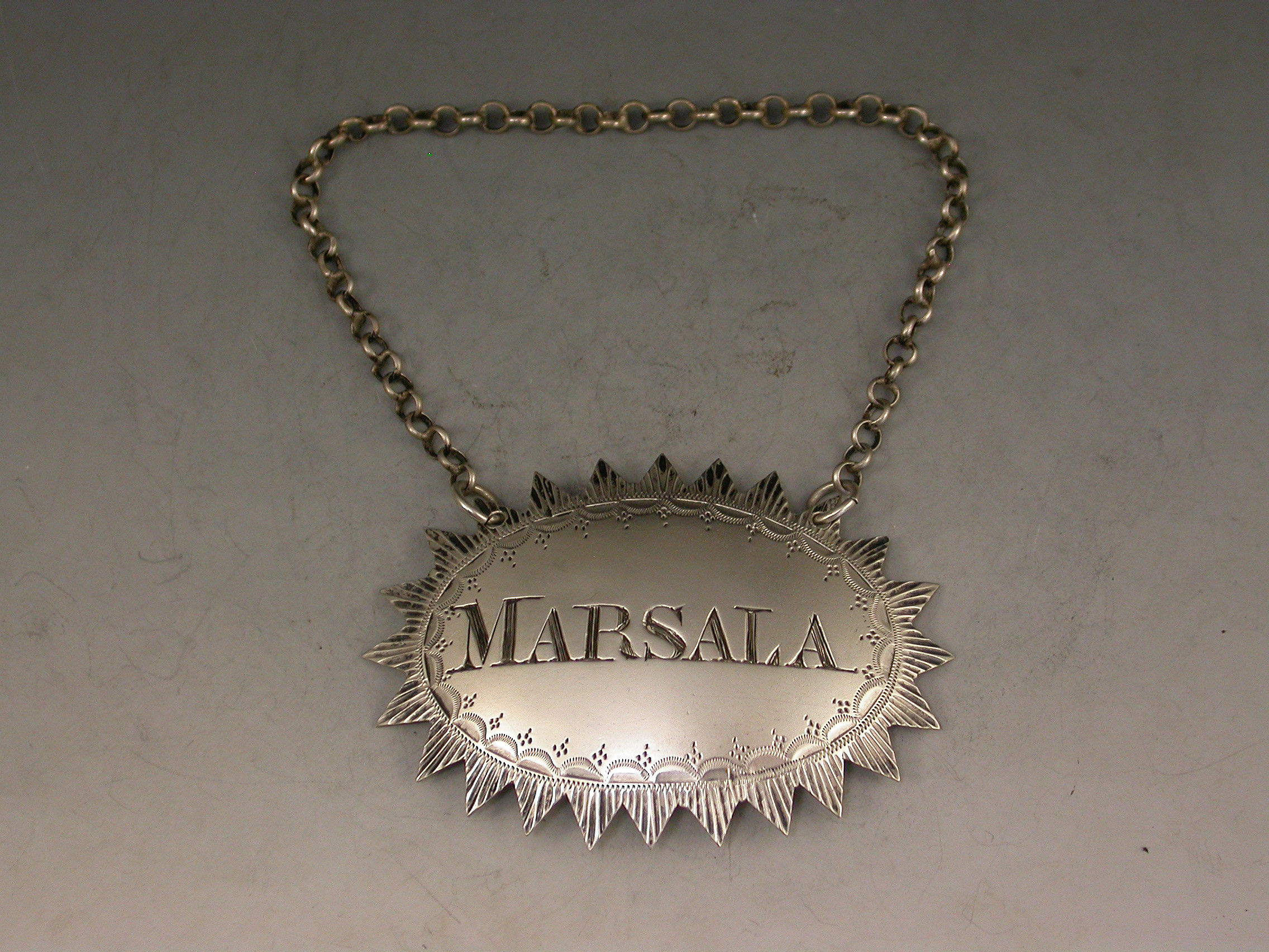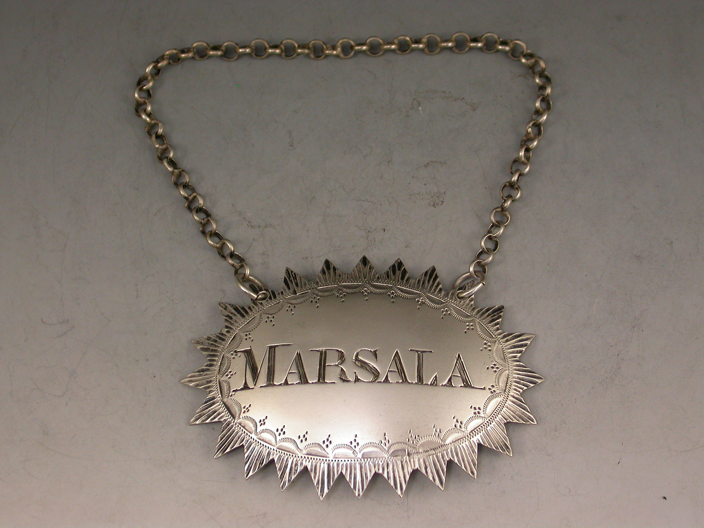 A very unusual William IV silver Wine Label of large oval form with cut ""dog-tooth"" border and bright cut decoration surrounding the incised title for Marsala.