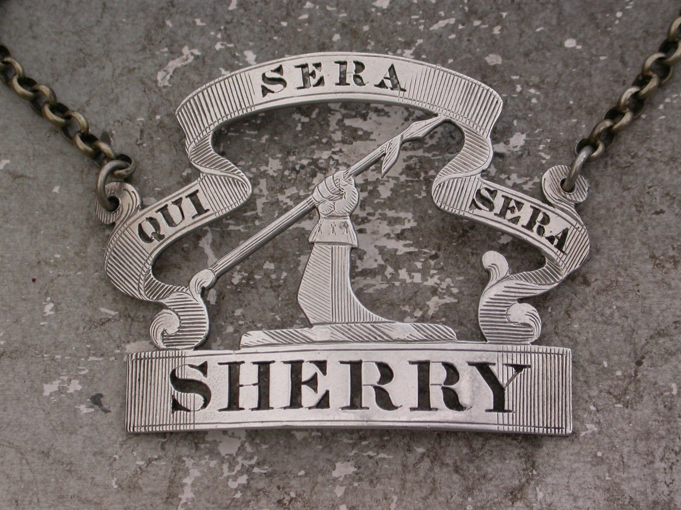 A rare William IV Armorial silver Wine Label of pierced form depicting the crest of the Ffolkes family of Norfolk below a pierced banner with the motto 'Qui Sera Sera' (what will be, will be). The name plate pierced for Sherry.