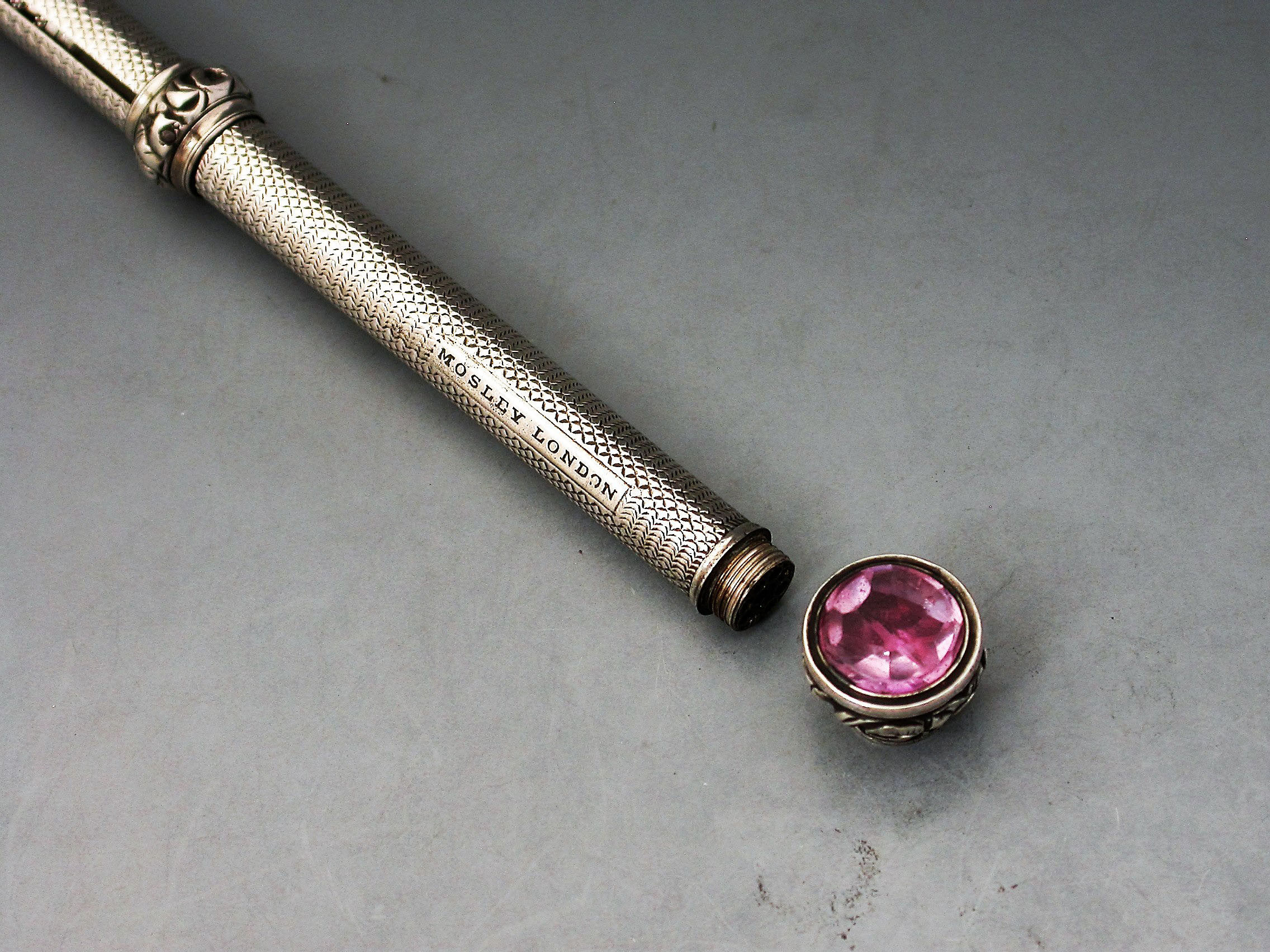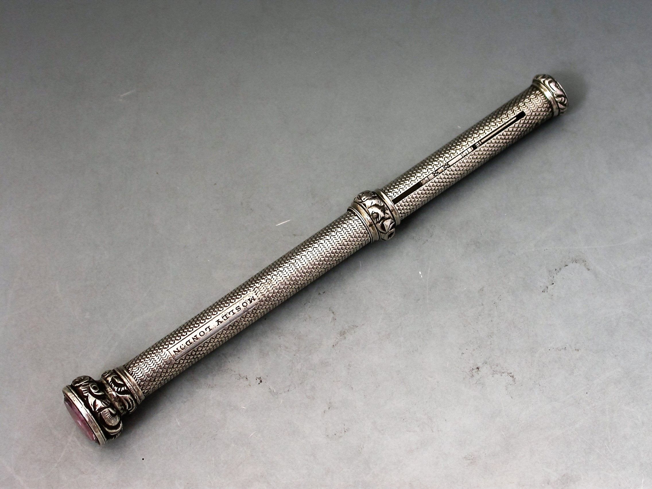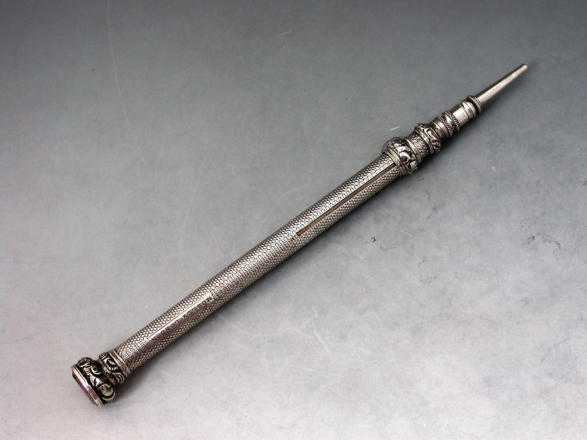A good William IV / early Victorian silver Propelling Pencil with engine turned decoration to the barrel, foliate chased slider ring and seal terminal which is set with an amethyst seal stone and unscrews to reveal a rifled lead reservoir.