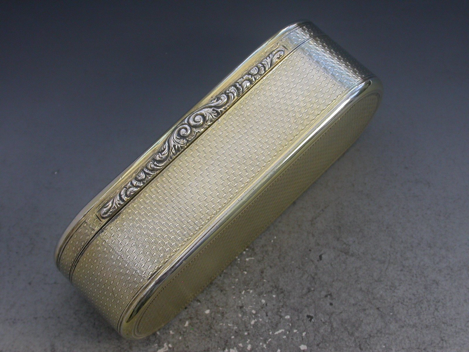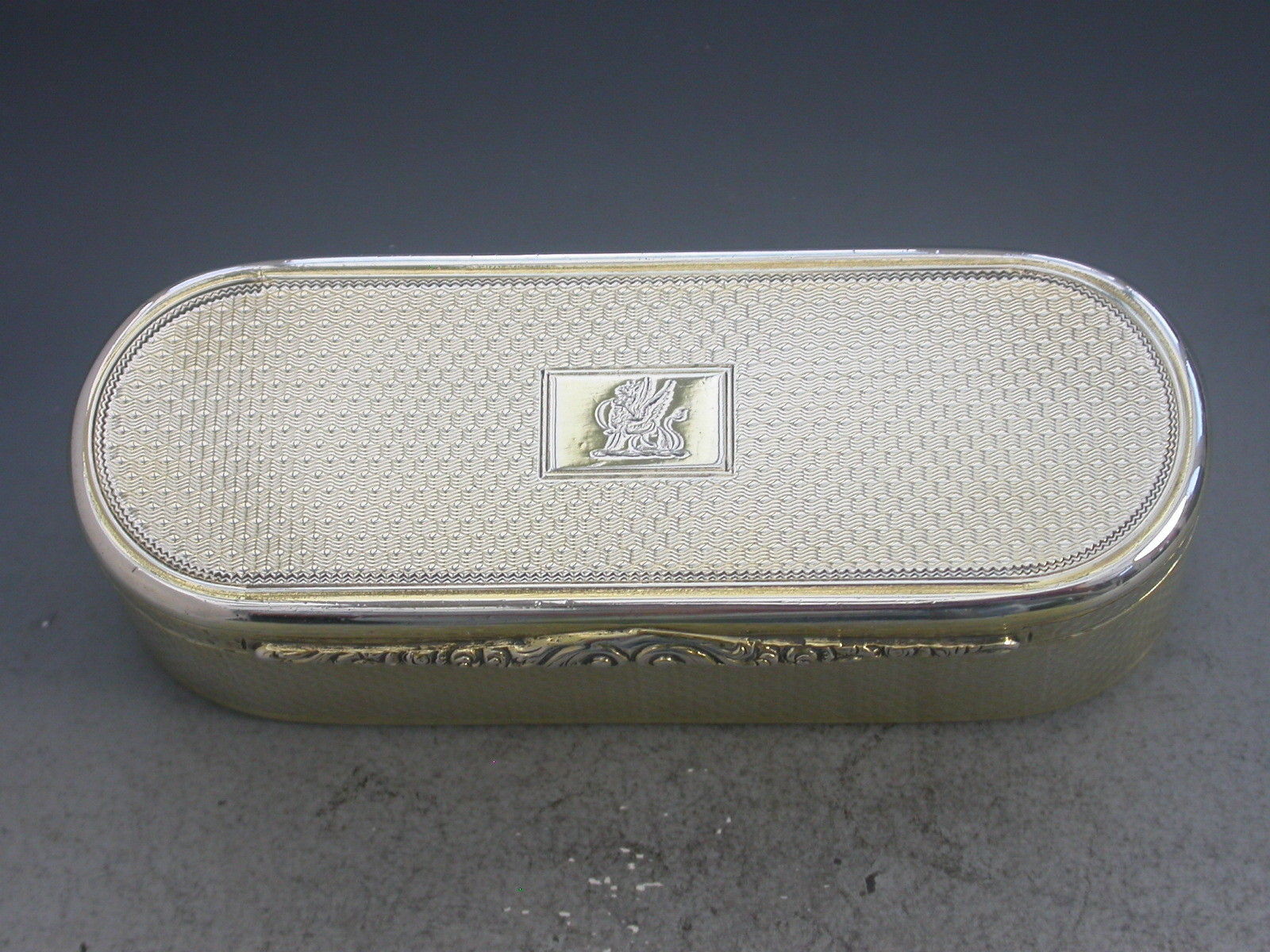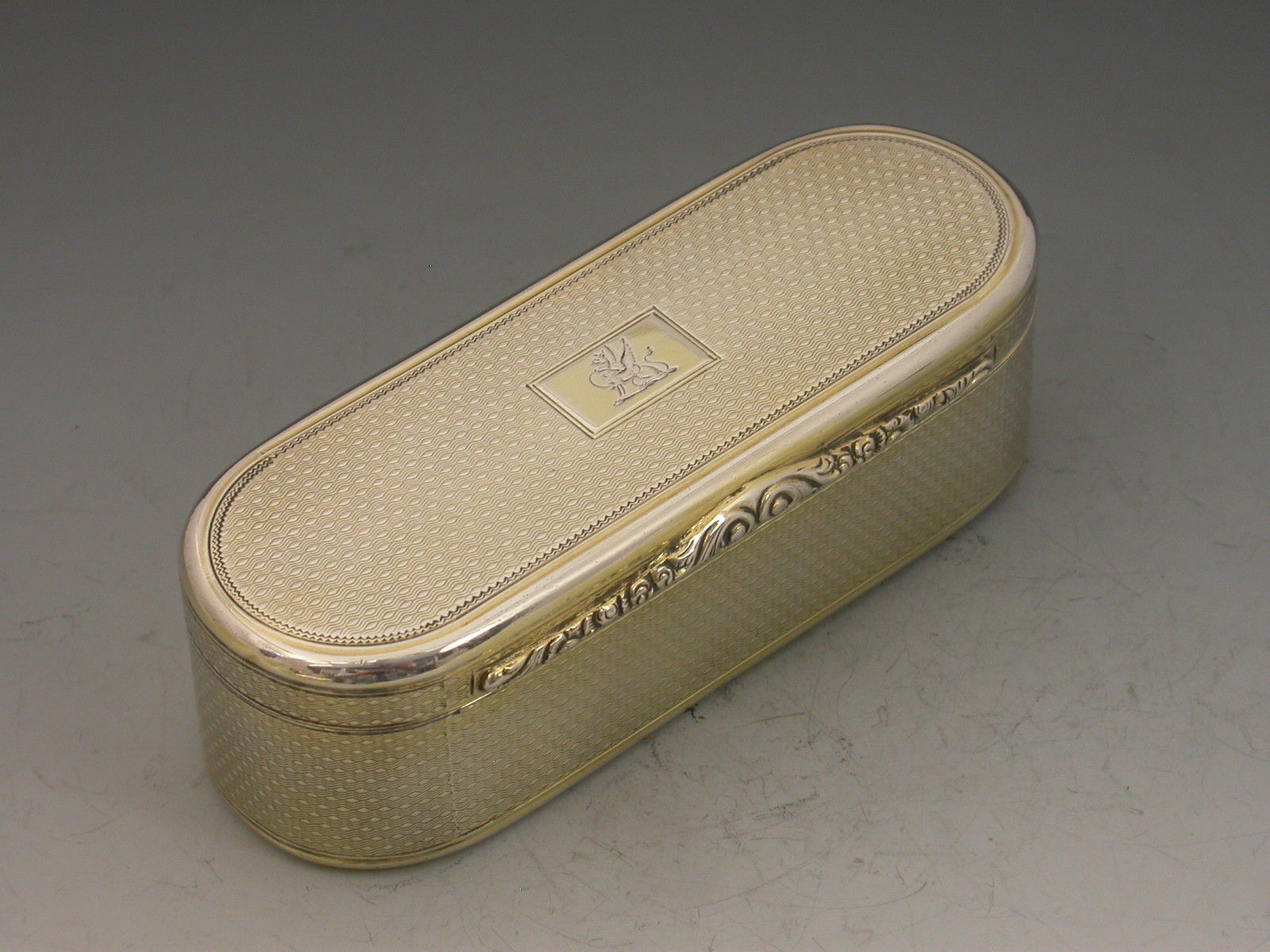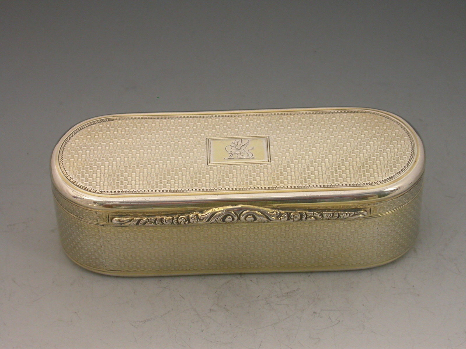 A good quality William IV silver gilt Snuff Box of rounded rectangular form with raised foliate scroll thumb piece, the base, lid and sides with engine turned decoration, the hinged cover with rectangular cartouche engraved with a crest depicting a Griffin.