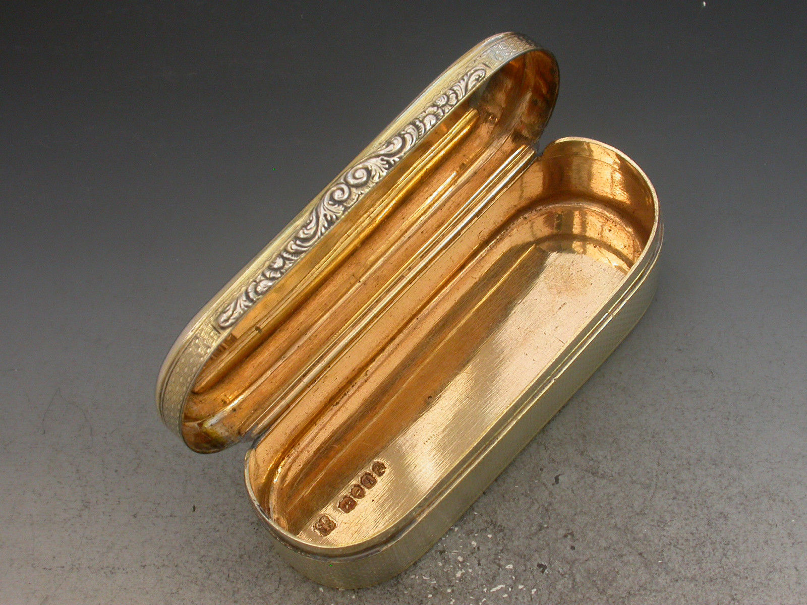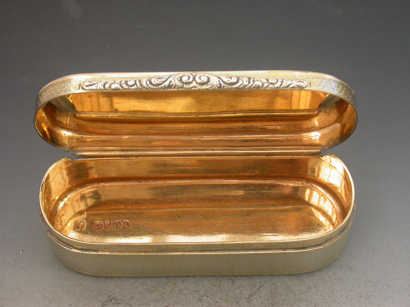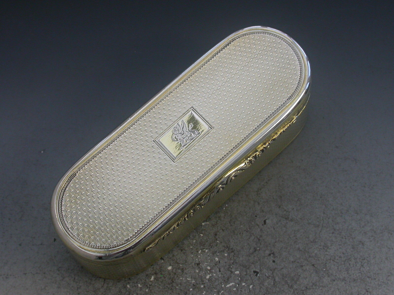 A good quality William IV silver gilt Snuff Box of rounded rectangular form with raised foliate scroll thumb piece, the base, lid and sides with engine turned decoration, the hinged cover with rectangular cartouche engraved with a crest depicting a Griffin.