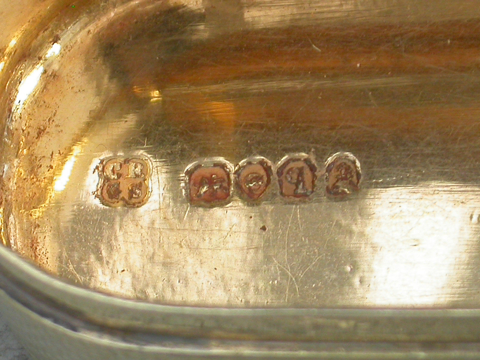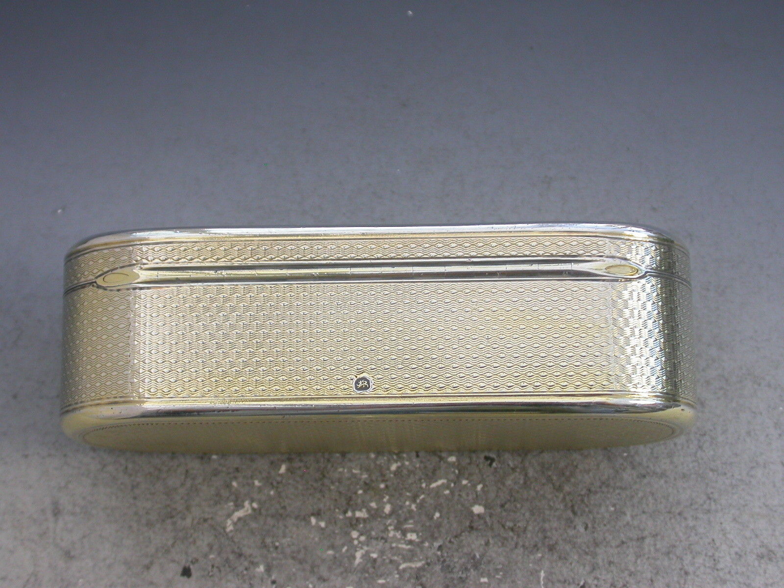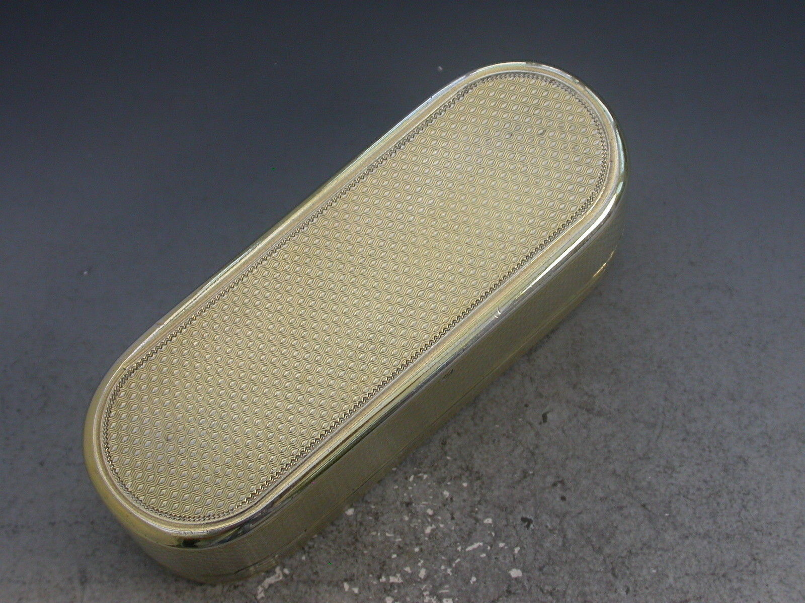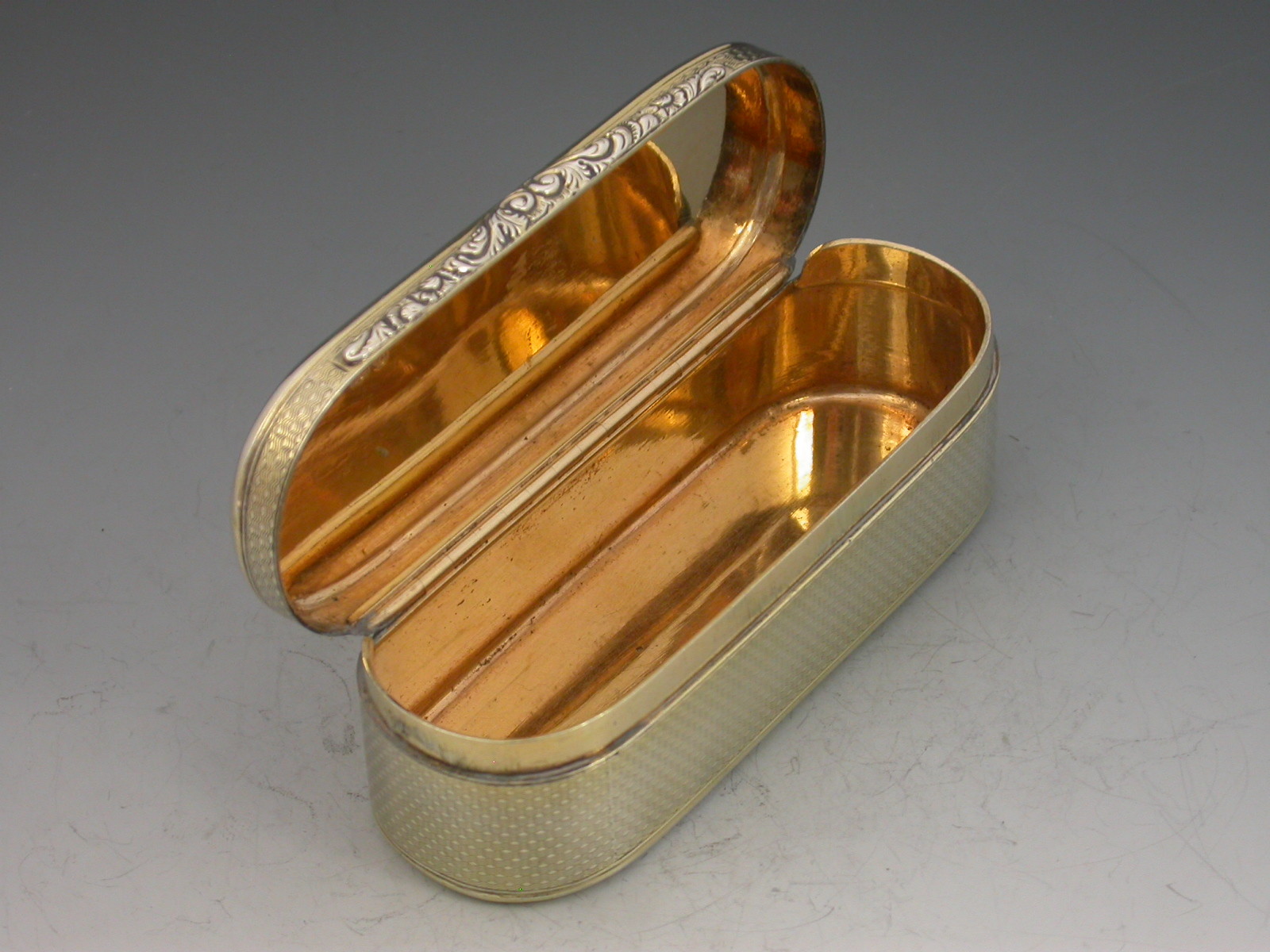 A good quality William IV silver gilt Snuff Box of rounded rectangular form with raised foliate scroll thumb piece, the base, lid and sides with engine turned decoration, the hinged cover with rectangular cartouche engraved with a crest depicting a Griffin.
