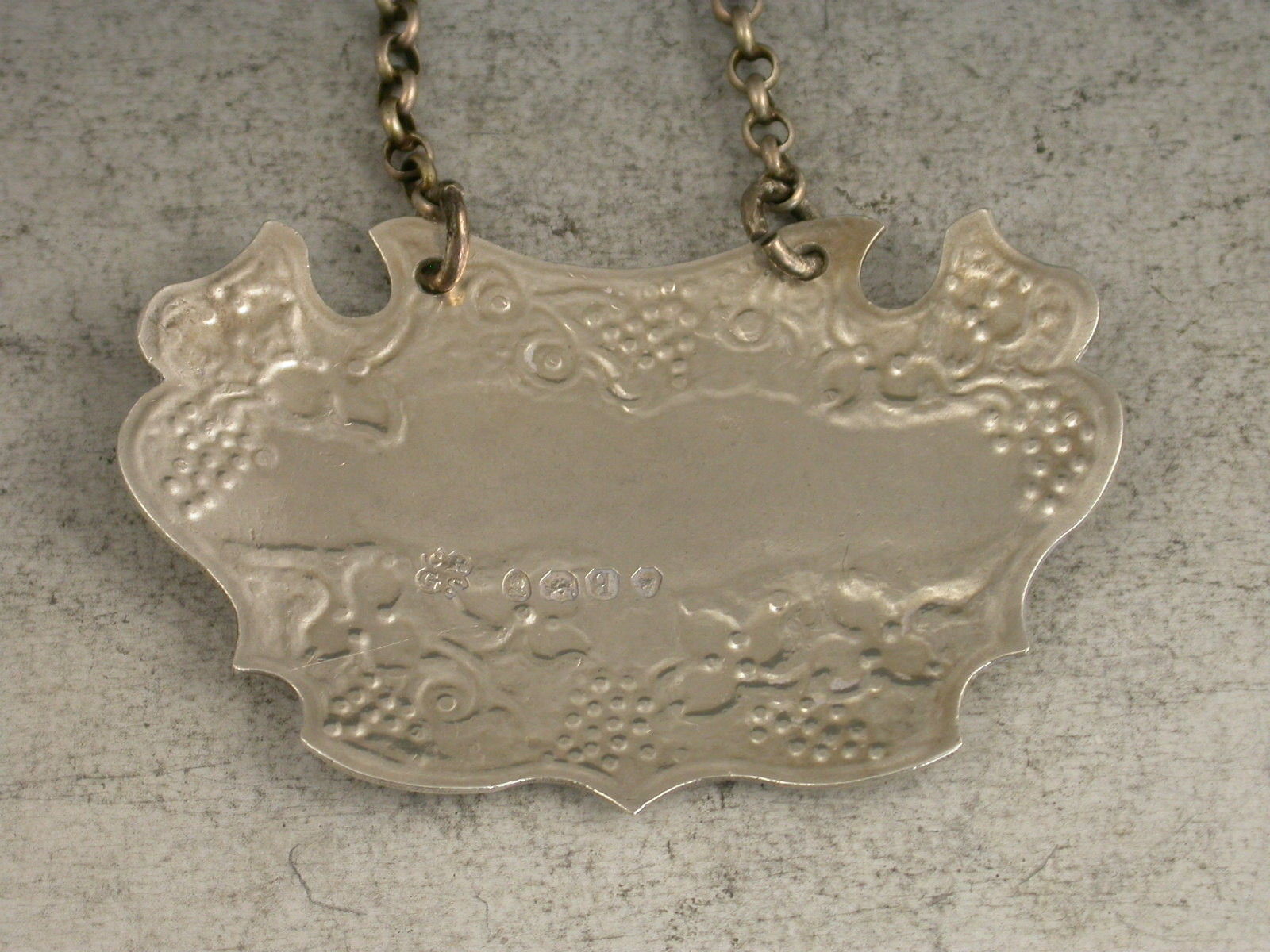 A William IV silver Wine Label in the mid 18th century style of flat chased escutcheon form, incised for Champagne within a border of vine leaves and grapes.