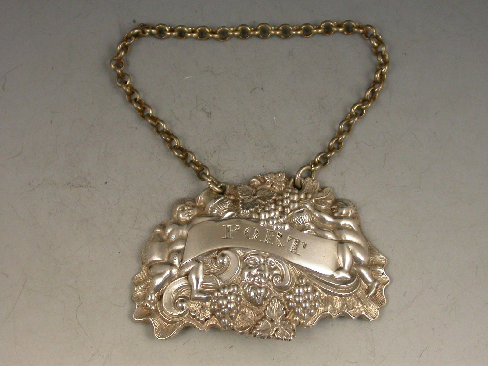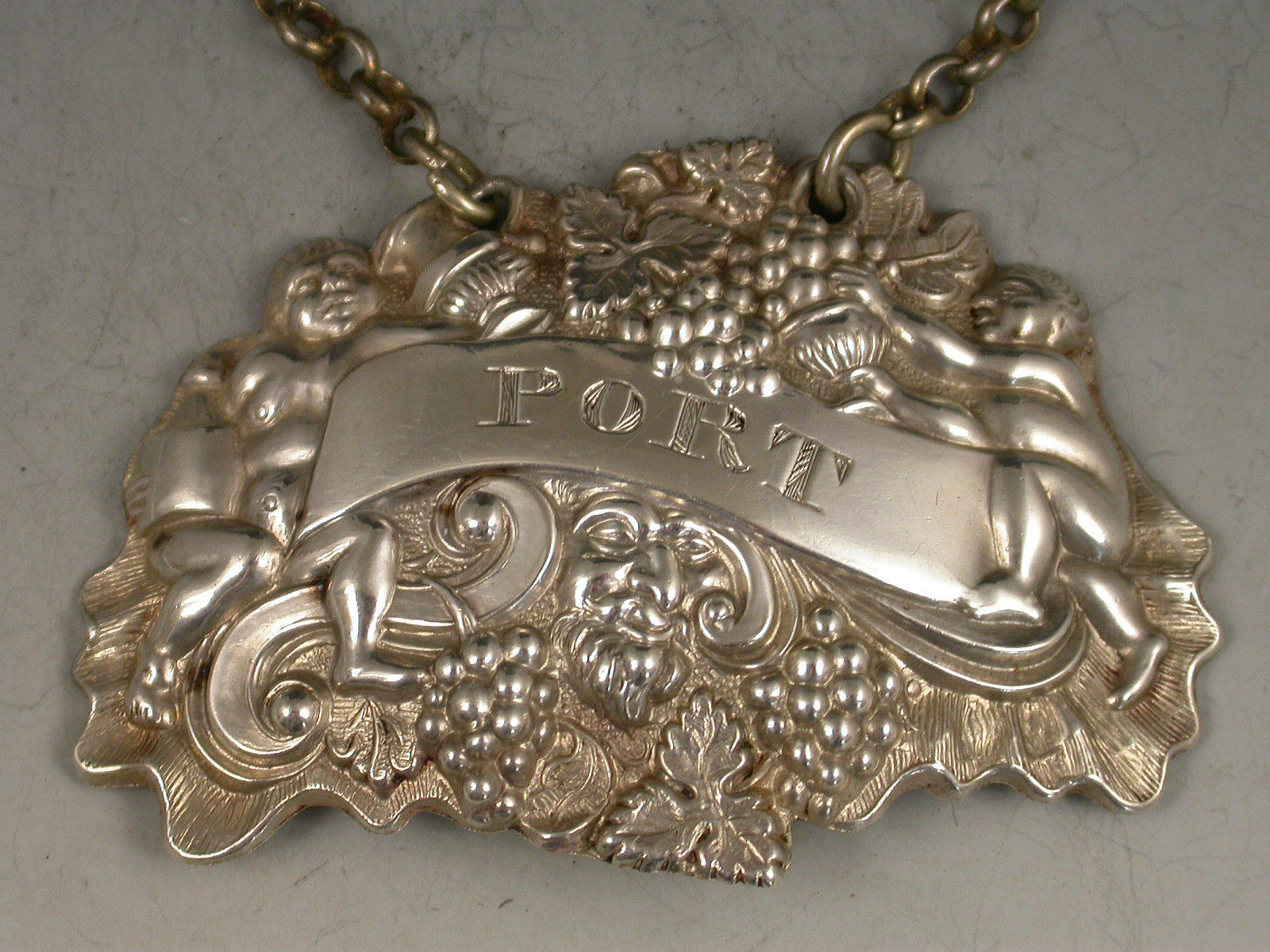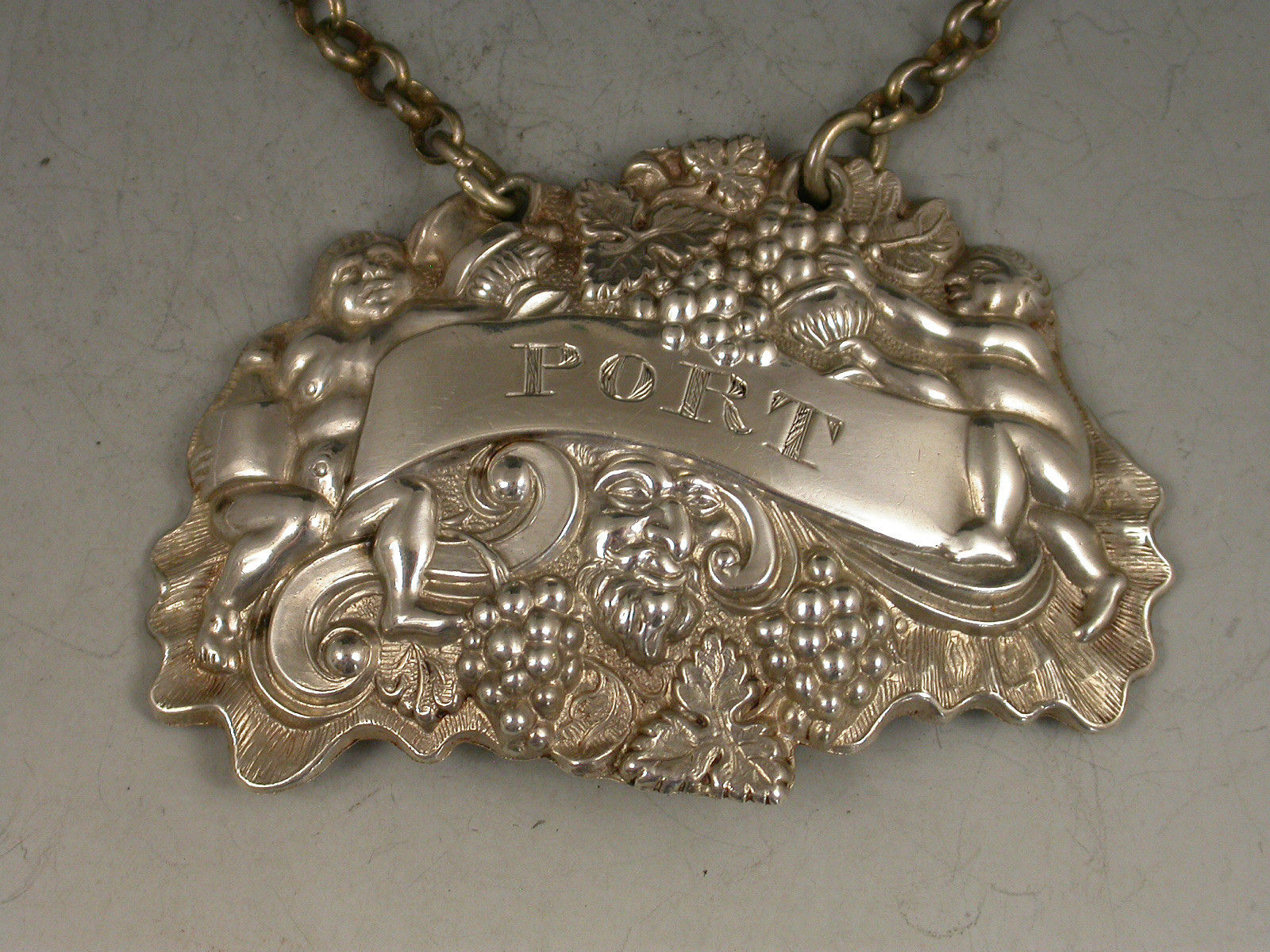 William IV Provincial Silver Two Putti with Jug & Bottle Wine Label 'Port'