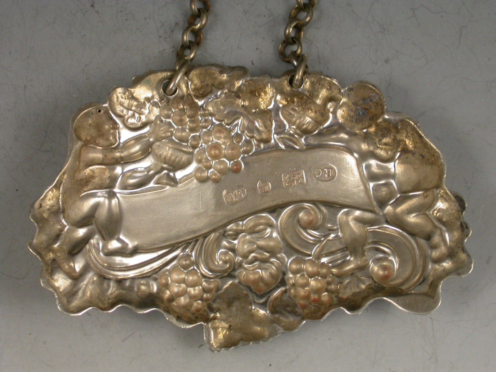 A William IV die-stamped Provincial silver Wine Label of ""two putti with jug and bottle"" form, the scroll name plate incised for Port.