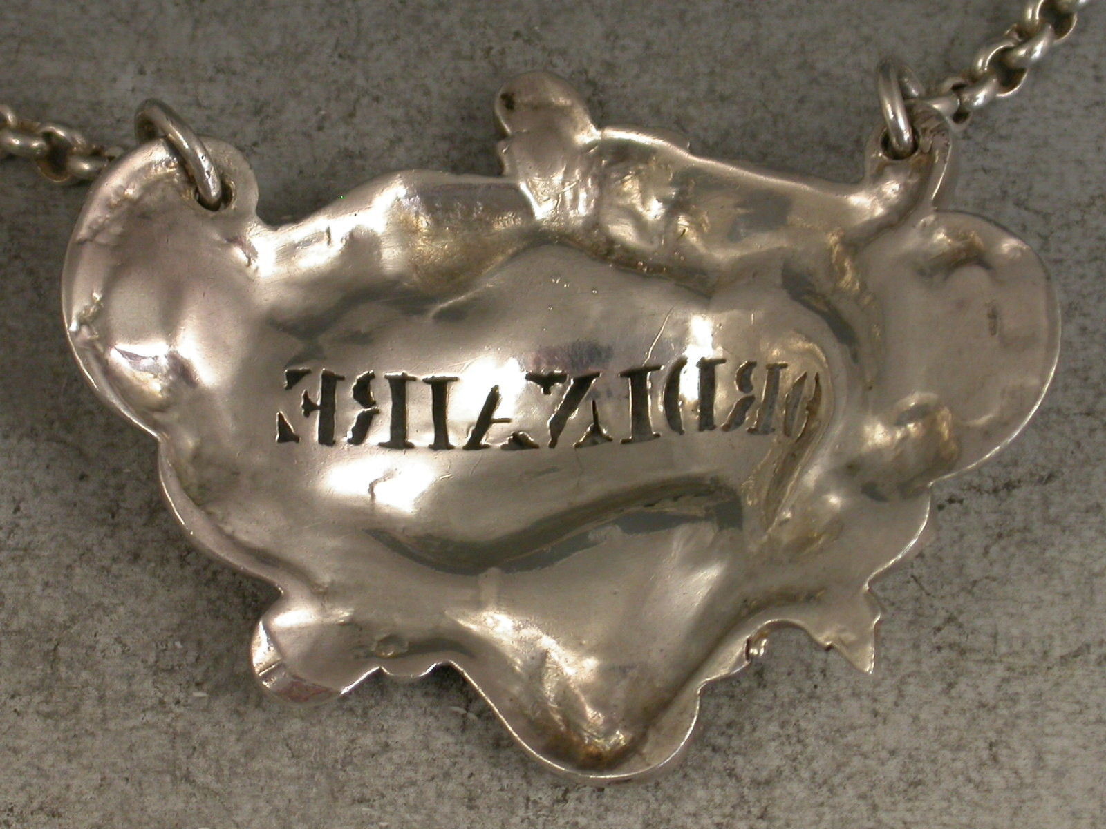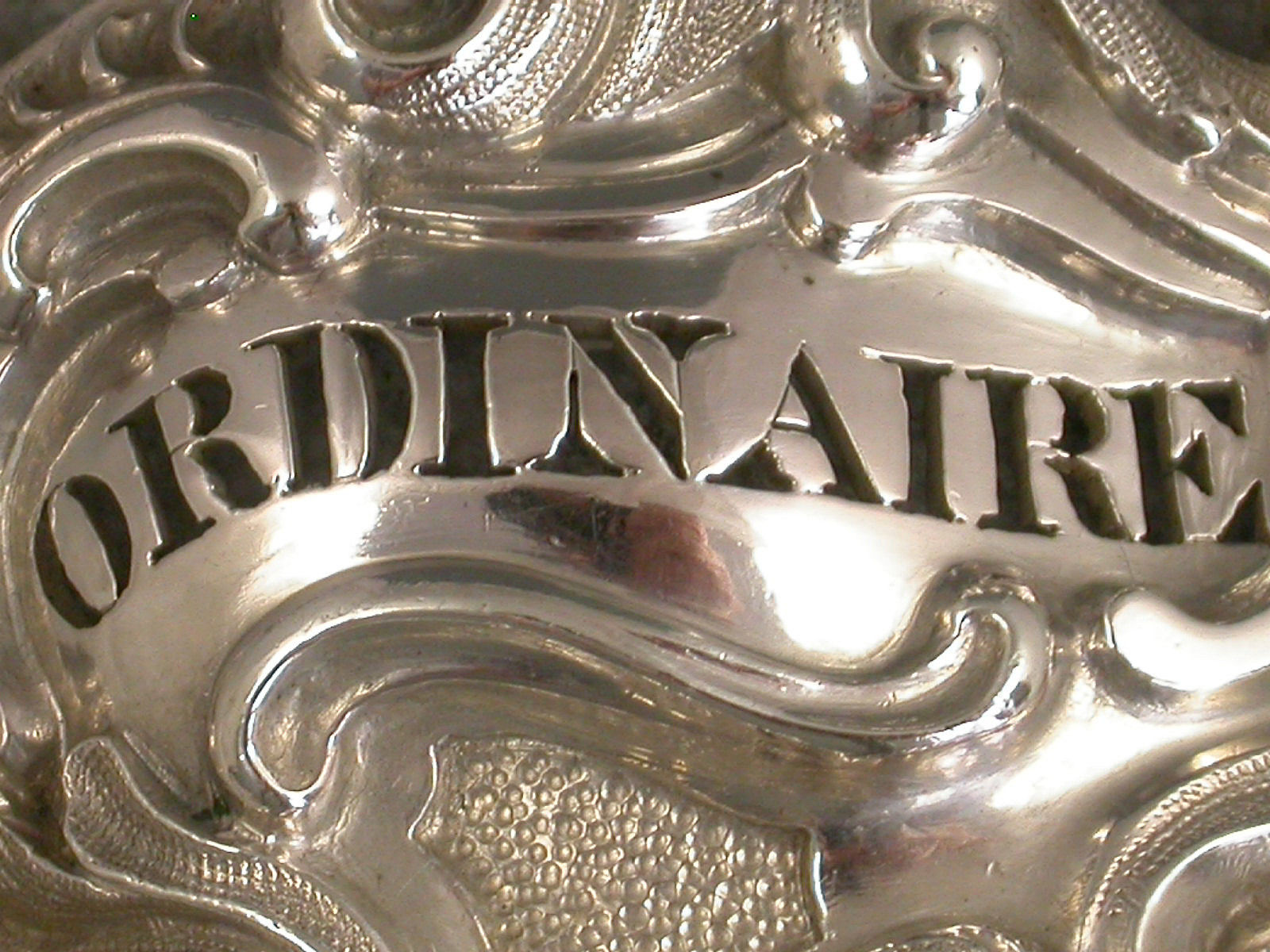 An extremely fine and rare William IV cast silver Wine Label of asymmetrical Rococo scroll cartouche form, pierced for Ordinaire.