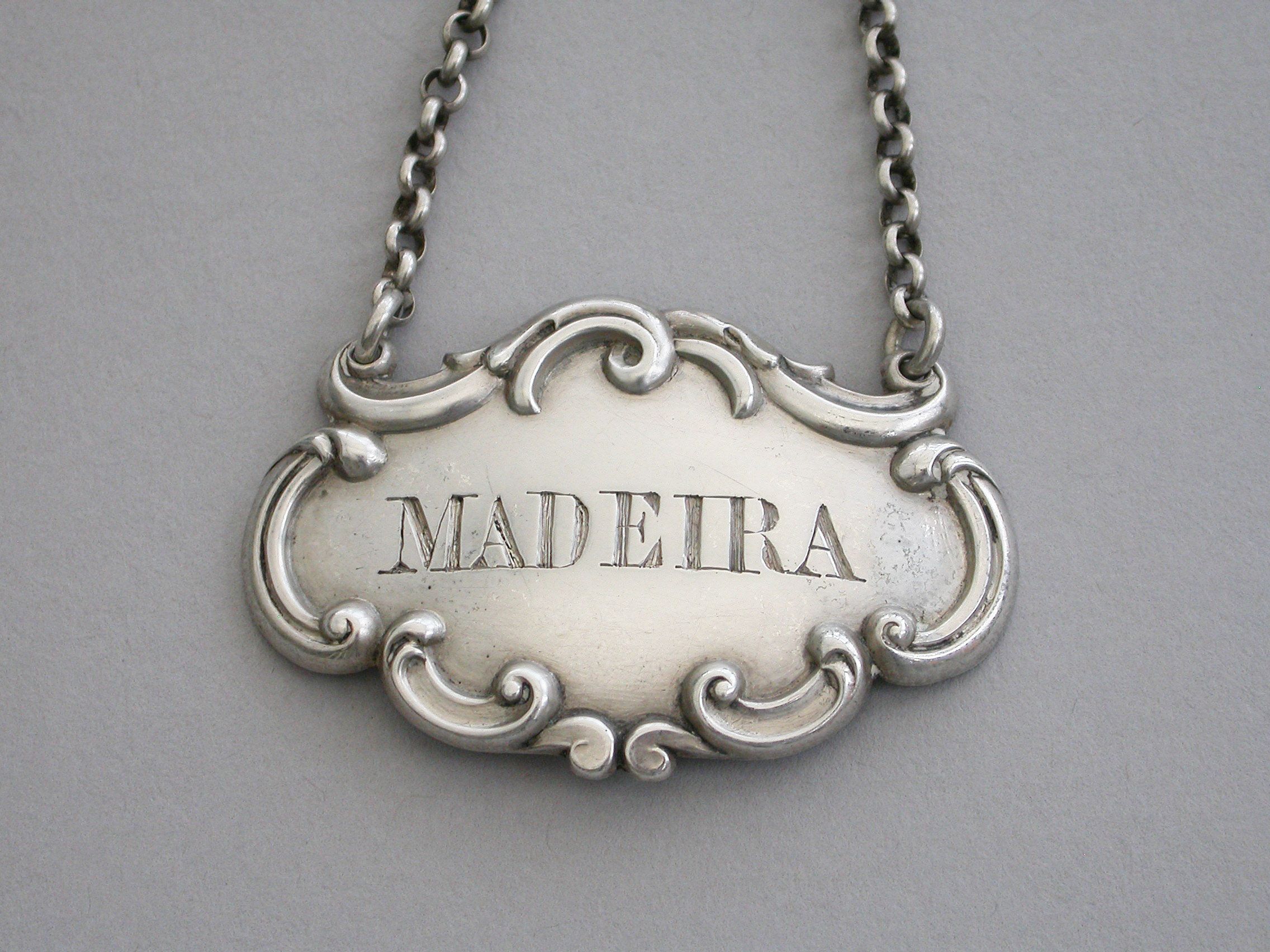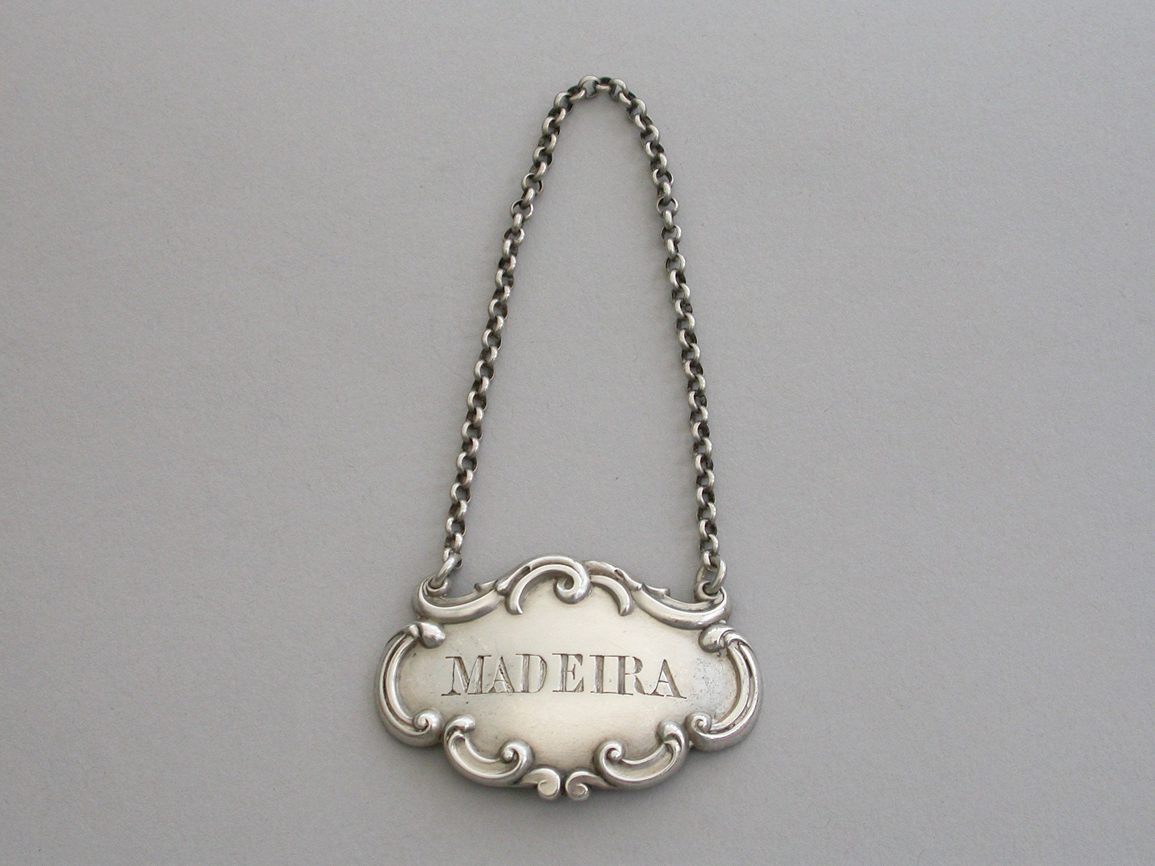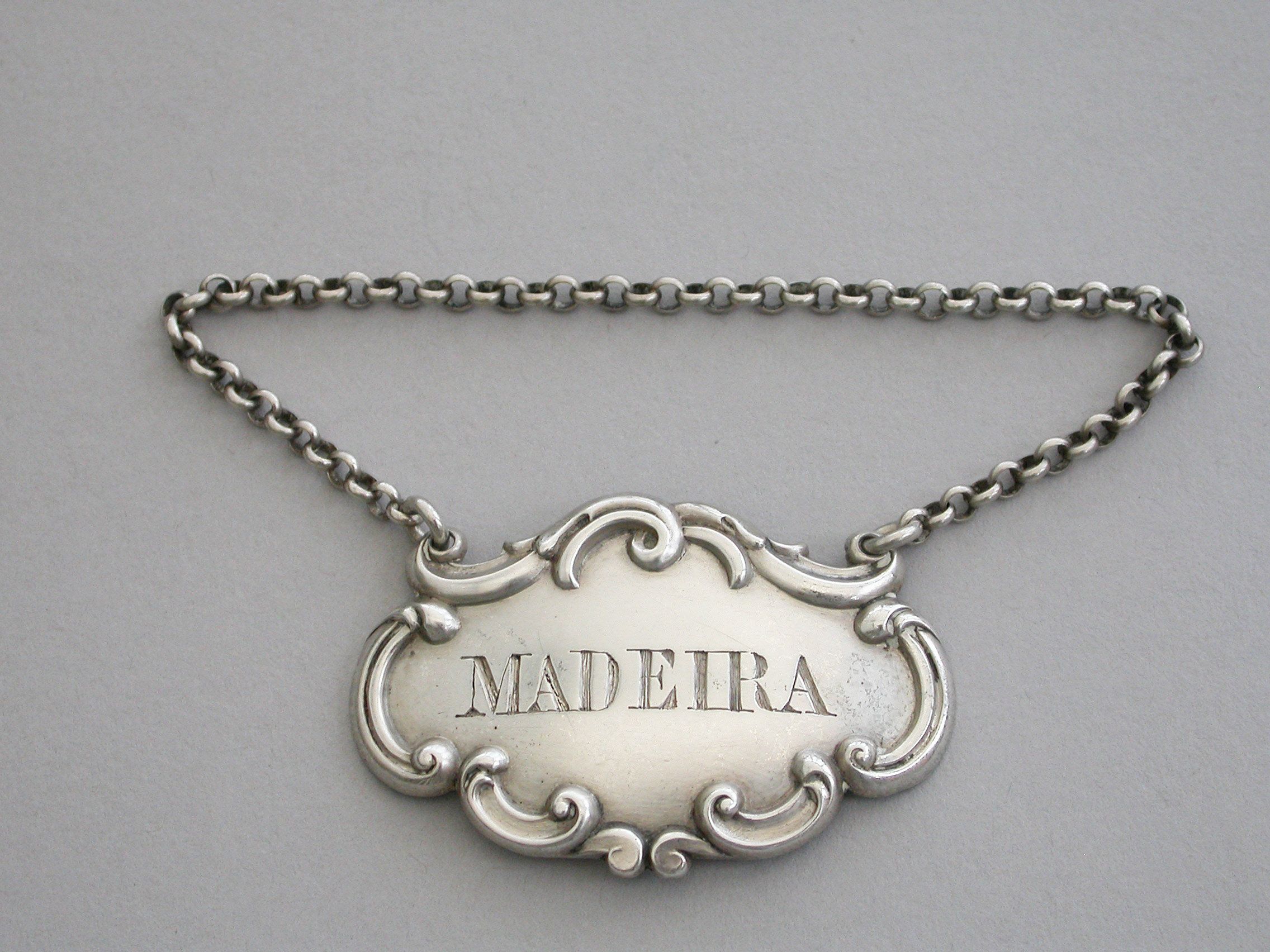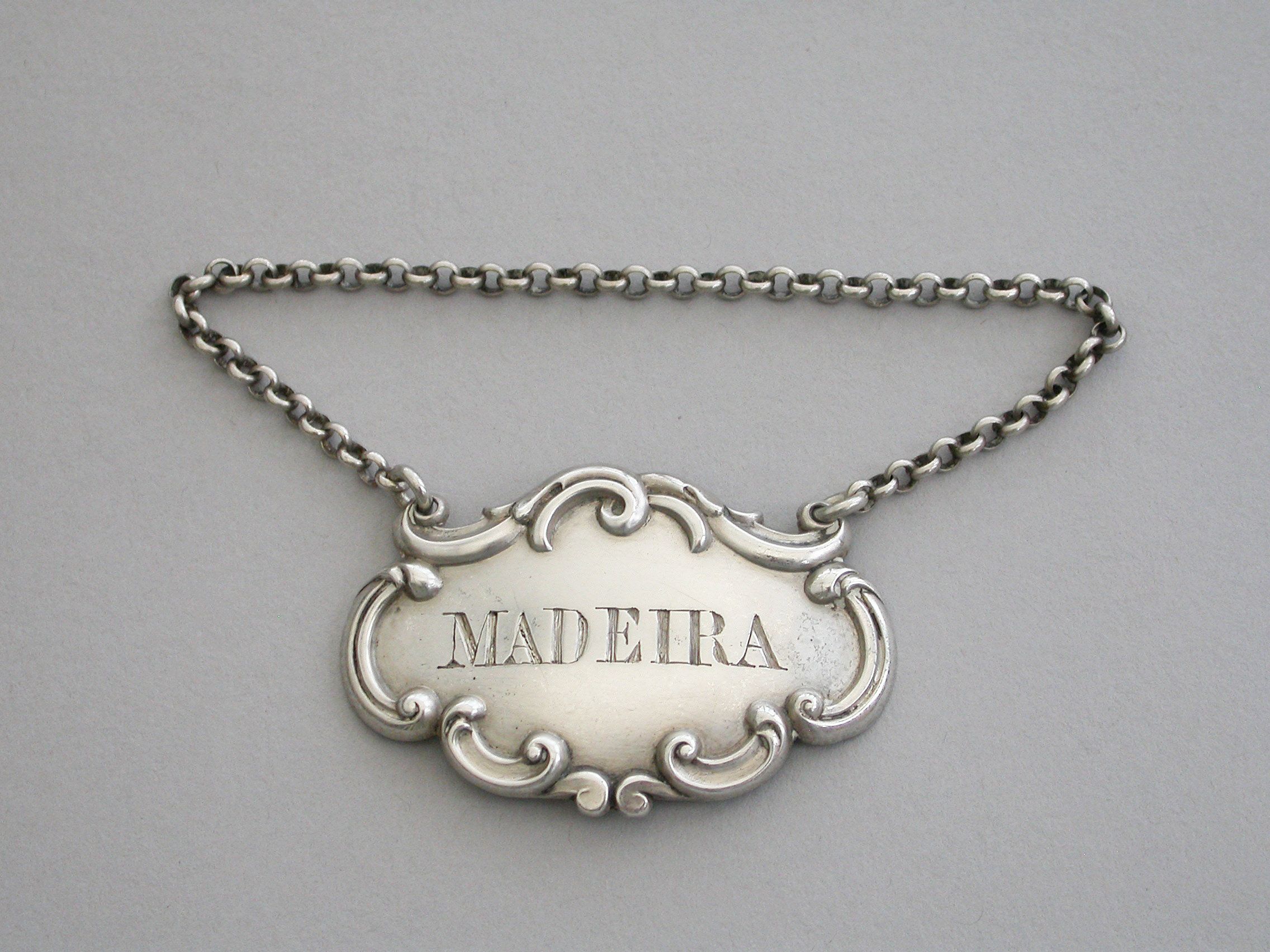 An unusual William IV Scottish silver Wine Label of shaped oval form with raised scrolled border, incised for Madeira.