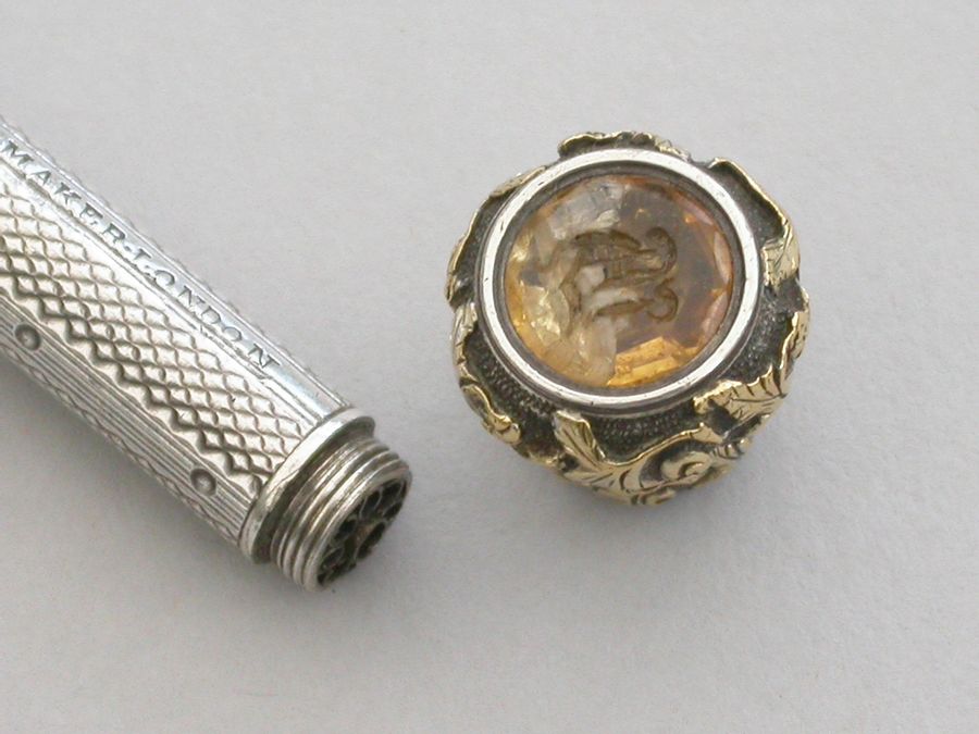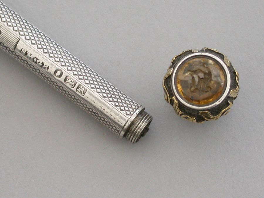 An unusual and good quality William IV fully hallmarked silver sliding Propelling Pencil, the barrel with engine turned and dot decoration, the slider ring and terminal with raised gilded foliate scroll highlights, the screw-off terminal revealing a lead reservoir and set with a citrine seal stone engraved with an initial.