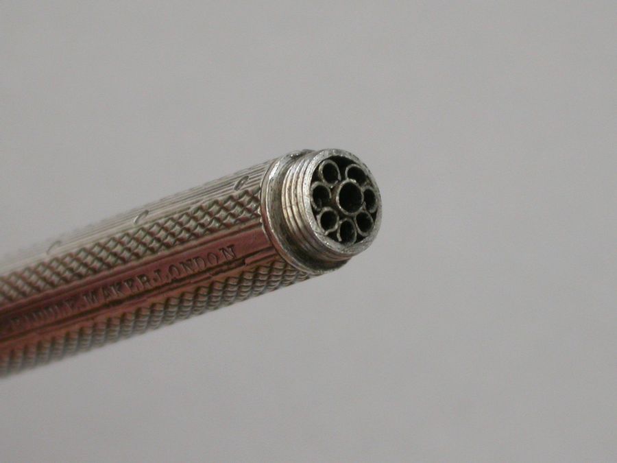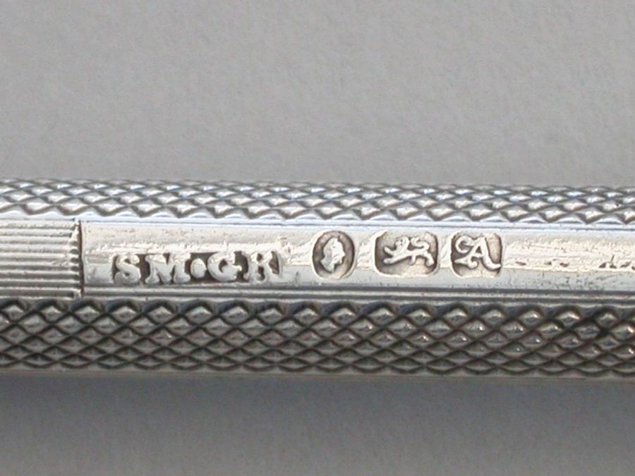 The combination of the 'SMGR' hallmark and the Riddle (on his own) Patent mark is unusual and interesting. The partnership was dissolved in December 1836 and Riddle only started using his Patent mark in 1837. Presumably at the split of the partnership Riddle took a stock of pencil shafts that had already been sent to assay and then added his own stamp before selling the piece.
