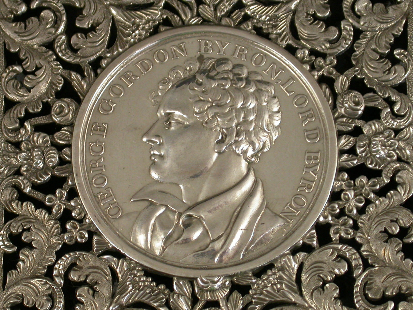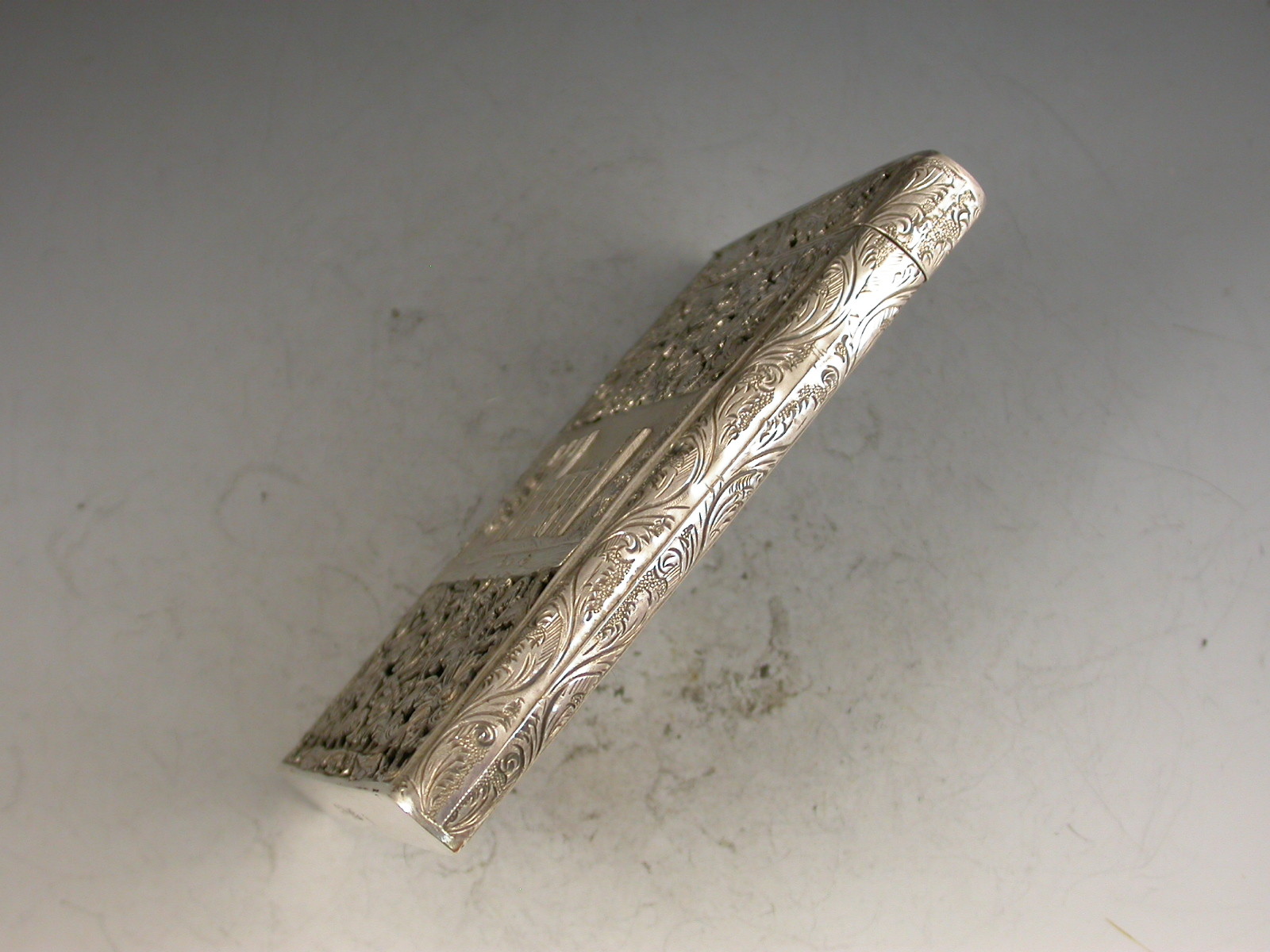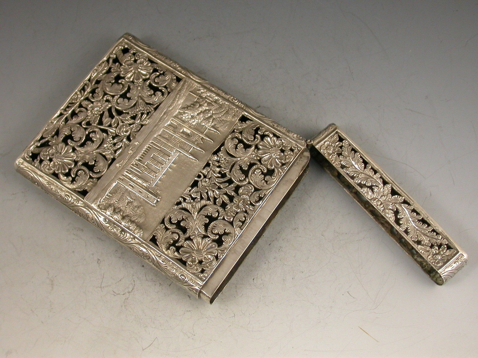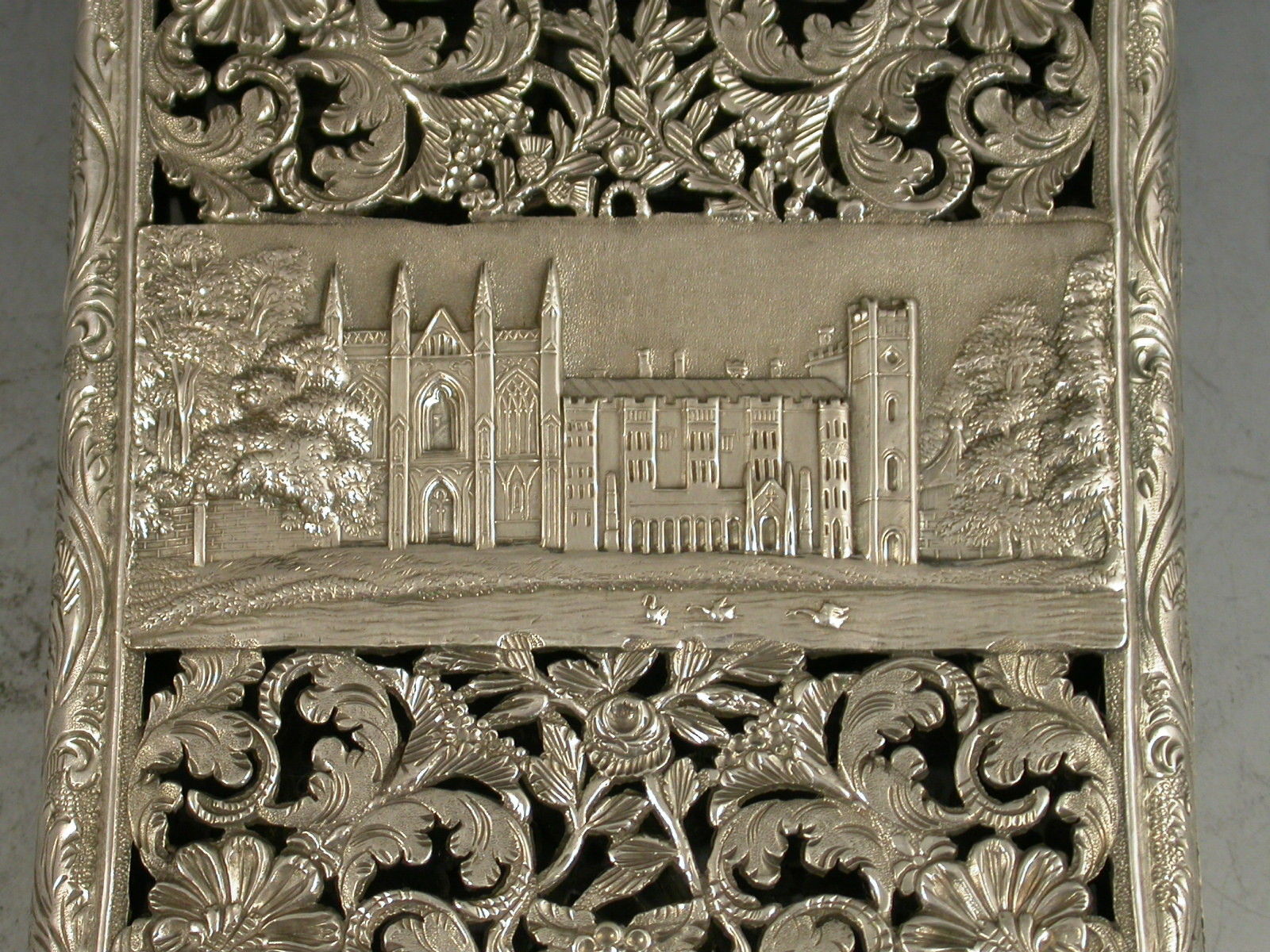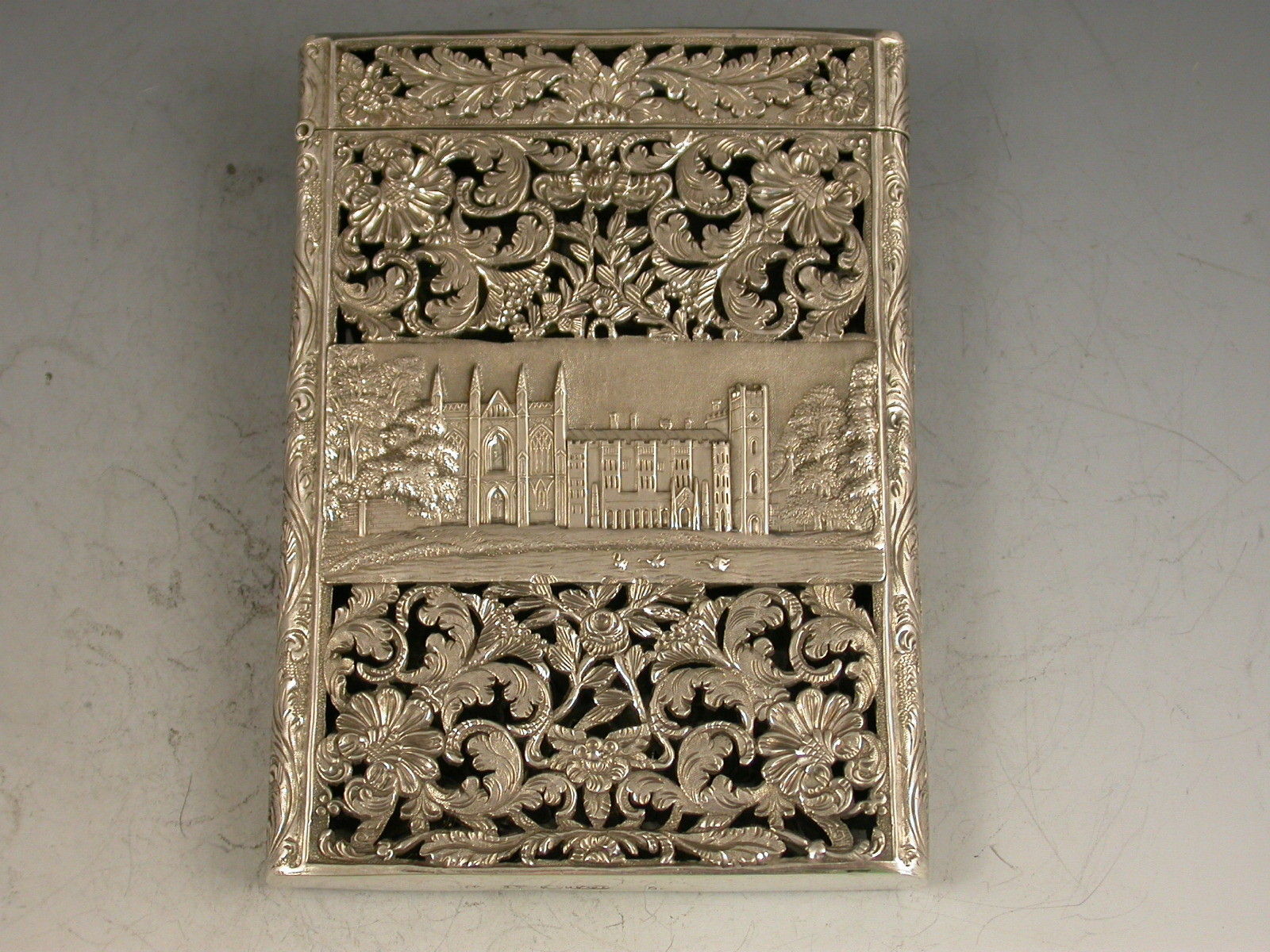 A fine quality William IV silver ""Castle Top"" Card Case of rectangular form with intricately foliate scroll pierced sides, the face with a panel chased with a raised scene of Newstead Abbey (the home of Lord Byron), the reverse inset with a medallion depicting Lord Byron.