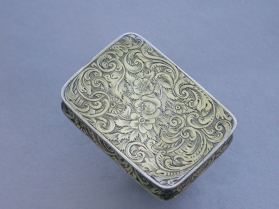 An extremely rare and fine quality William IV rectangular silver gilt Vinaigrette, hand engraved with scrolling foliate motifs, the base with leaves and flower heads in the centre, the sides slightly incurving, the lid set with a blister pearl mounted as a Cat. The silver gilt grille pierced with scrolling leaves.