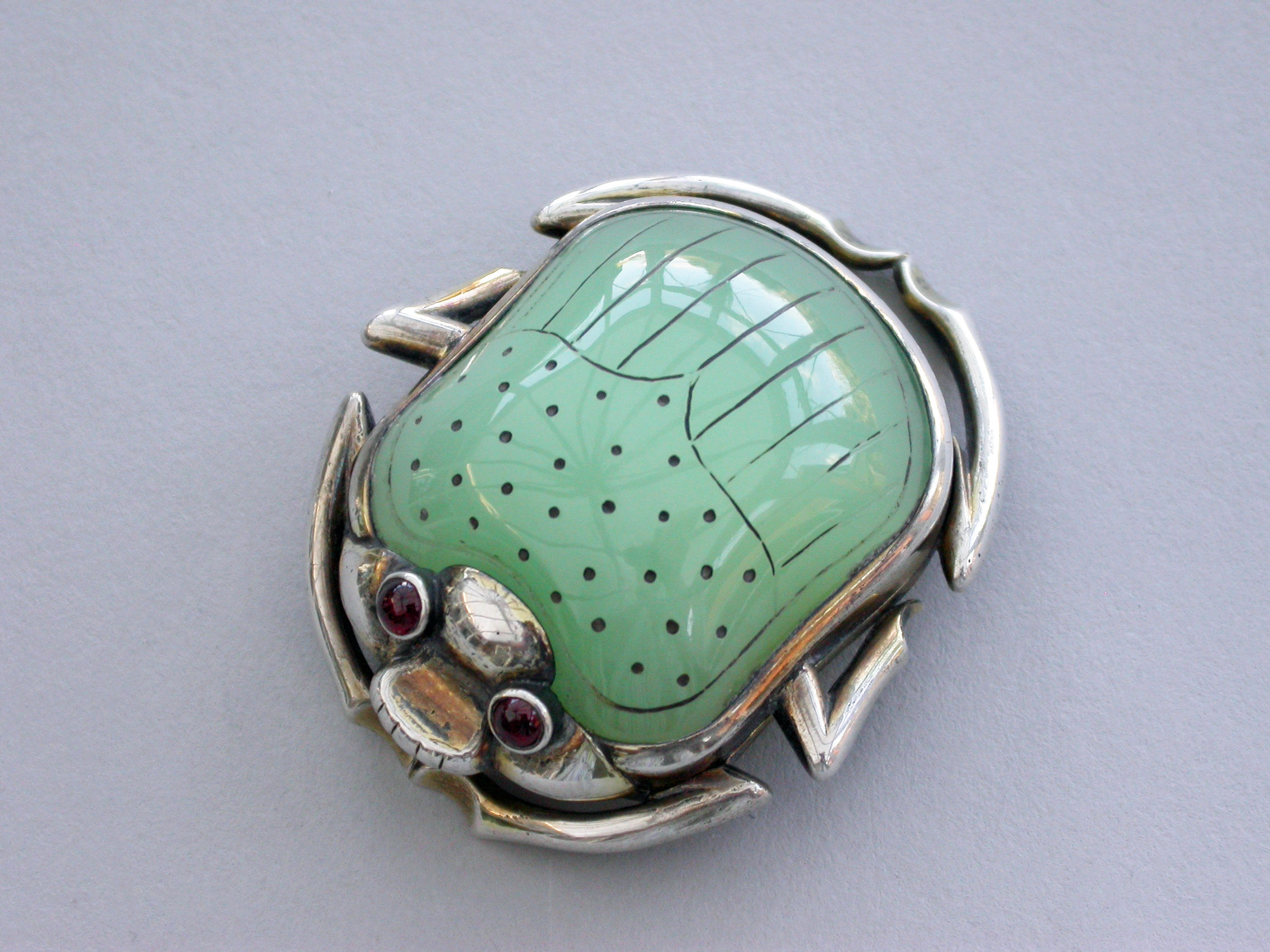 An extremely fine quality William IV silver gilt Vinaigrette formed as a Scarab Beetle, the lid inset with a polished and decorated Chrysoprase, red cabochon eyes, mandibular detail and separated legs to the side, the base contoured and with front and back legs attached. The silver gilt grille shaped as the body with pierced decoration of an exotic bird amongst foliage.