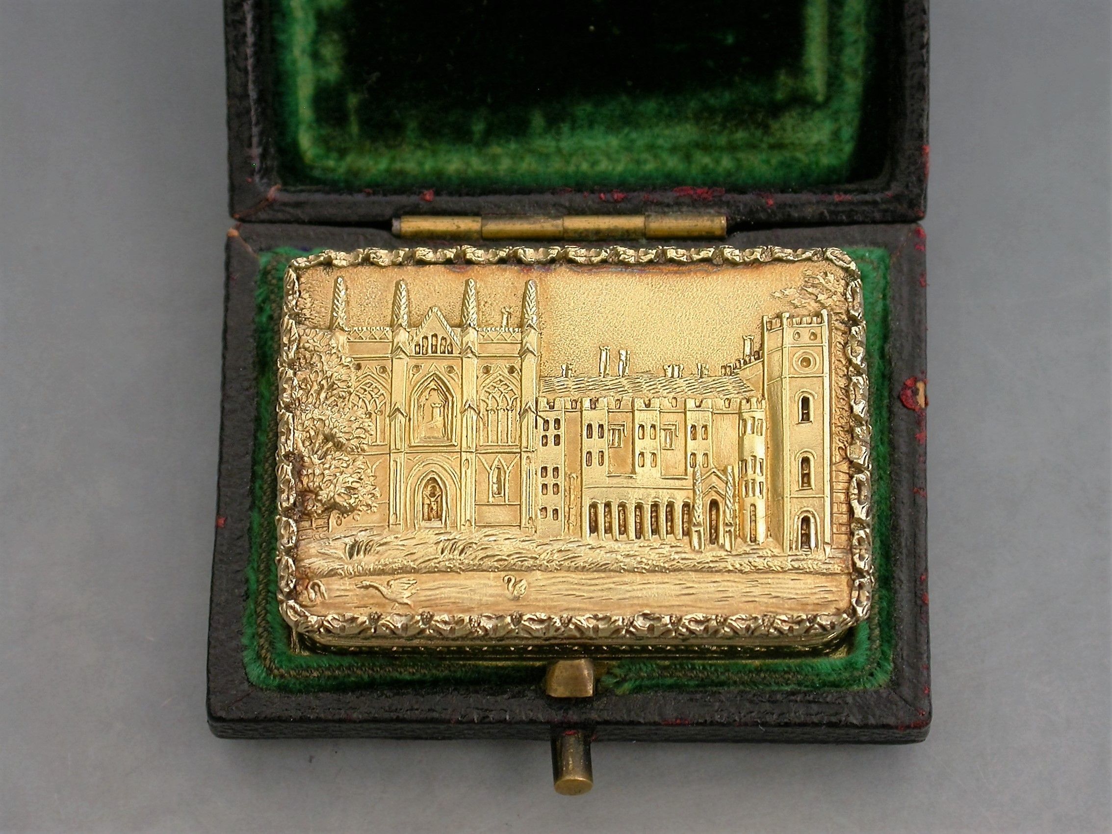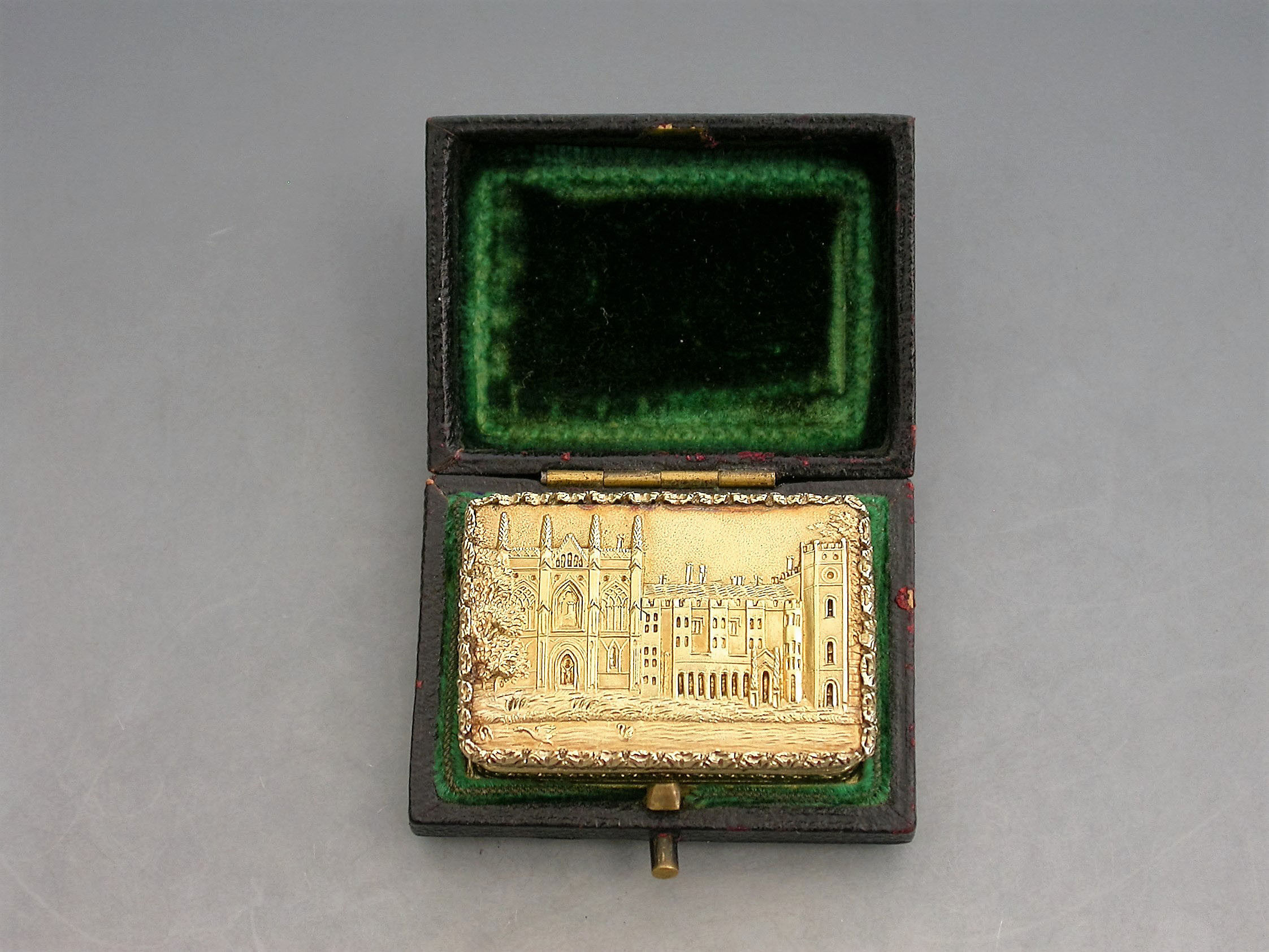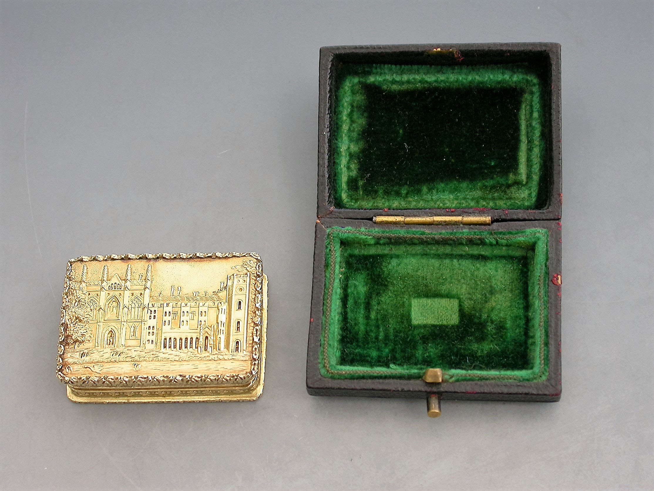 A fine quality William IV silver gilt ""Castle Top"" Vinaigrette of rectangular form, the base with engine turned decoration and a vacant rectangular cartouche, the sides chased with flower heads on a matt background, the cover with a high relief view of Newstead Abbey. The interior hinged grille pierced and engraved with scrolls and flower heads.