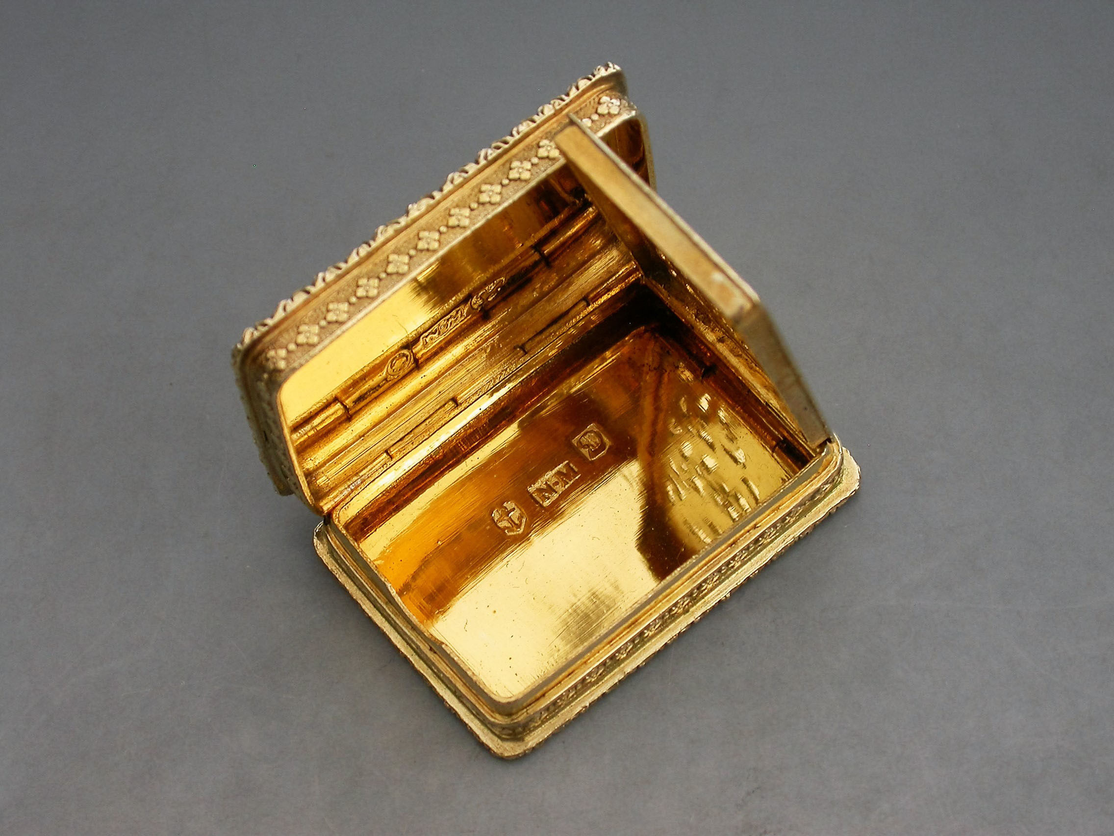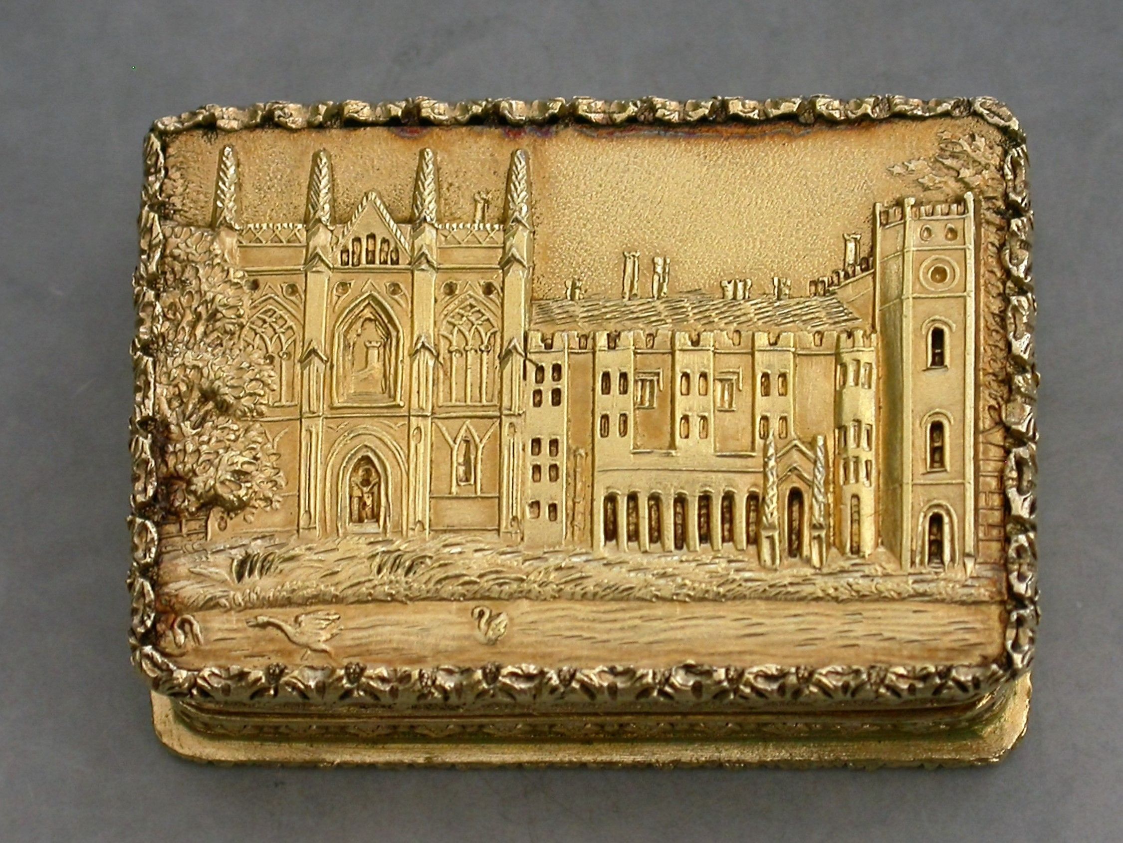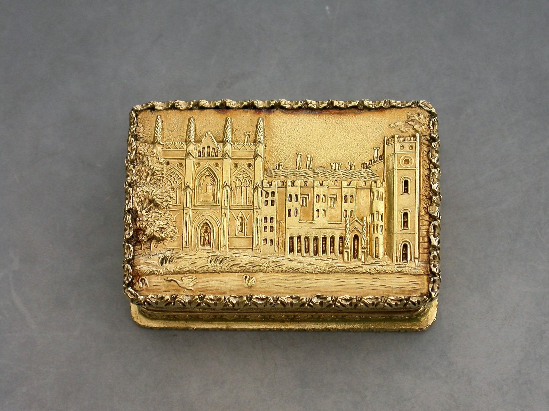 A fine quality William IV silver gilt ""Castle Top"" Vinaigrette of rectangular form, the base with engine turned decoration and a vacant rectangular cartouche, the sides chased with flower heads on a matt background, the cover with a high relief view of Newstead Abbey. The interior hinged grille pierced and engraved with scrolls and flower heads.