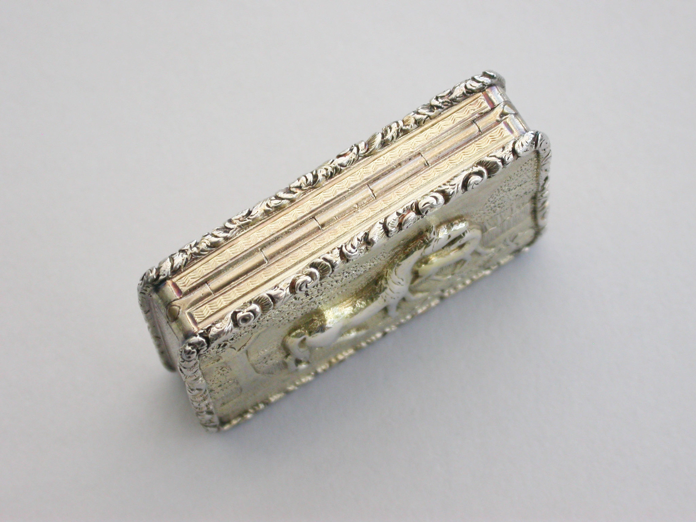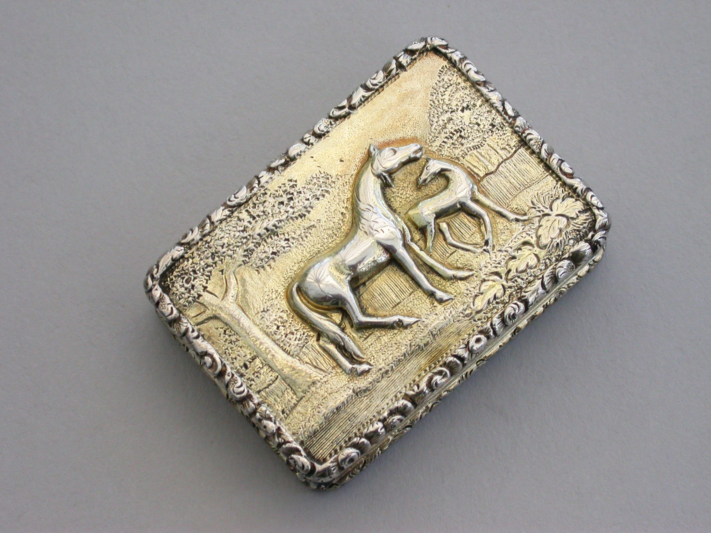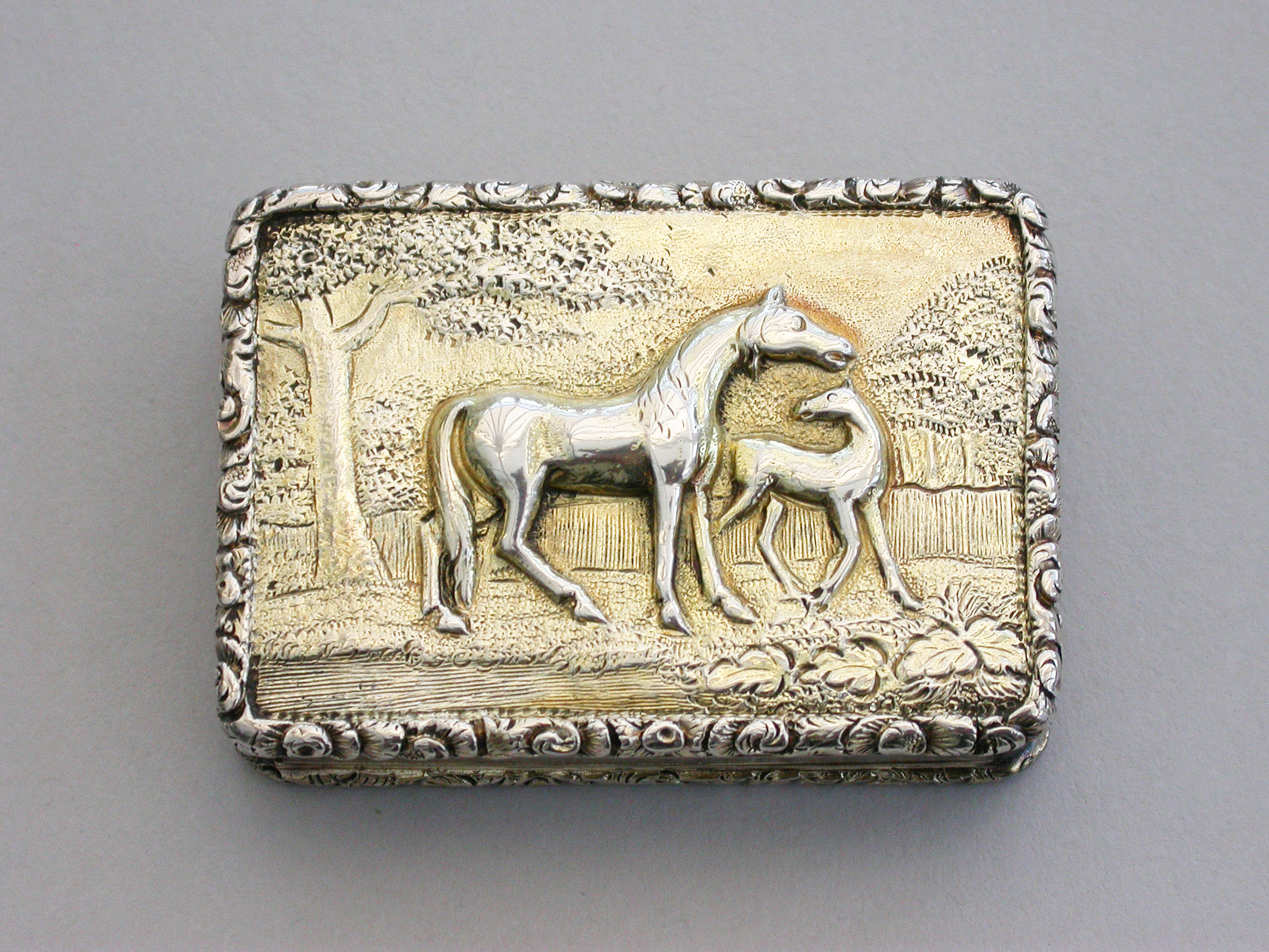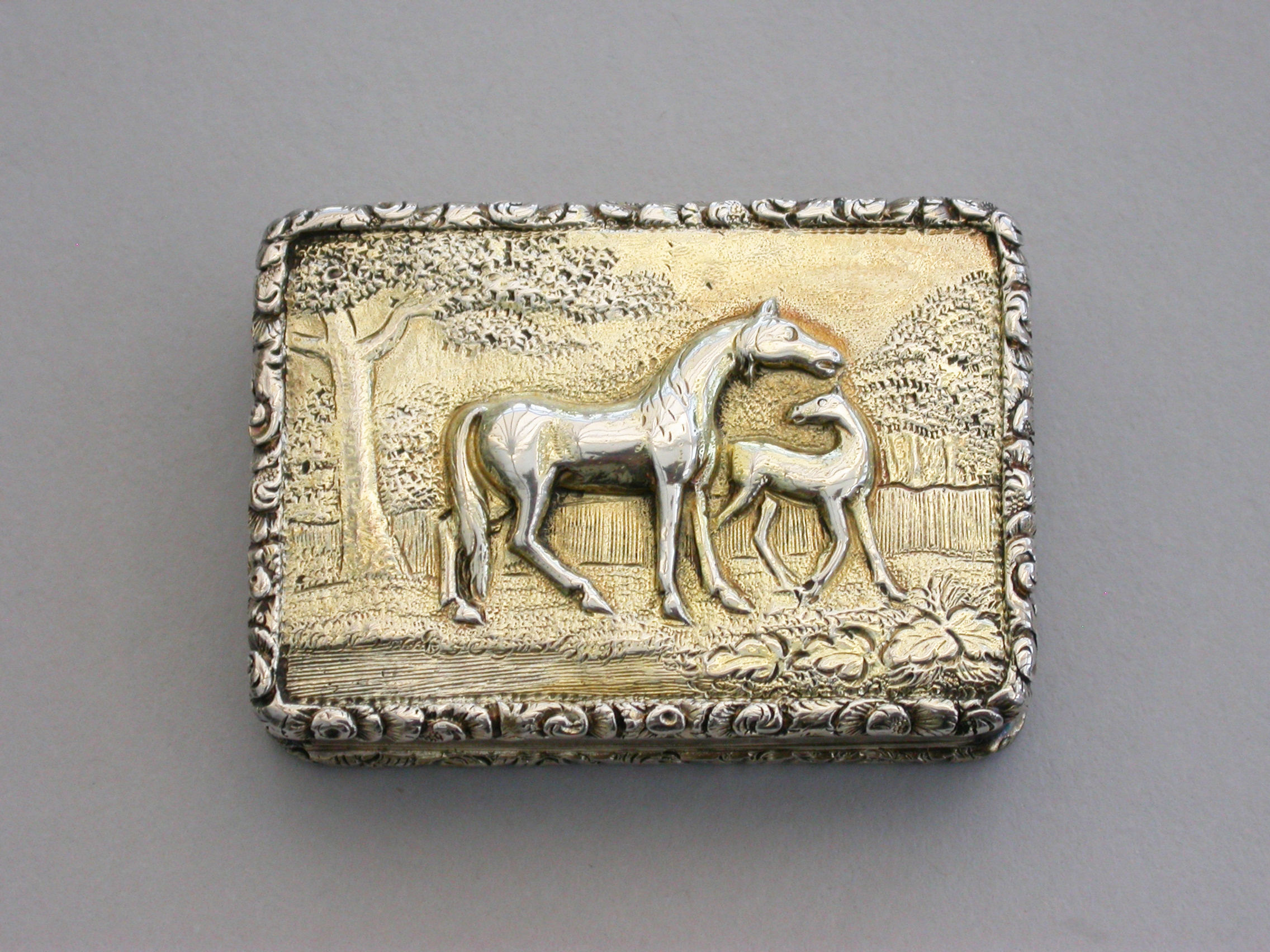 A fine quality William IV heavy silver gilt Vinaigrette, the cover cast with a mare and her foal in a landscape scene within a cast foliate border, probably after George Stubbs. The base and sides with engine turned decoration a vacant rectangular cartouche. The silver gilt grille pierced with scrolls and flower heads.