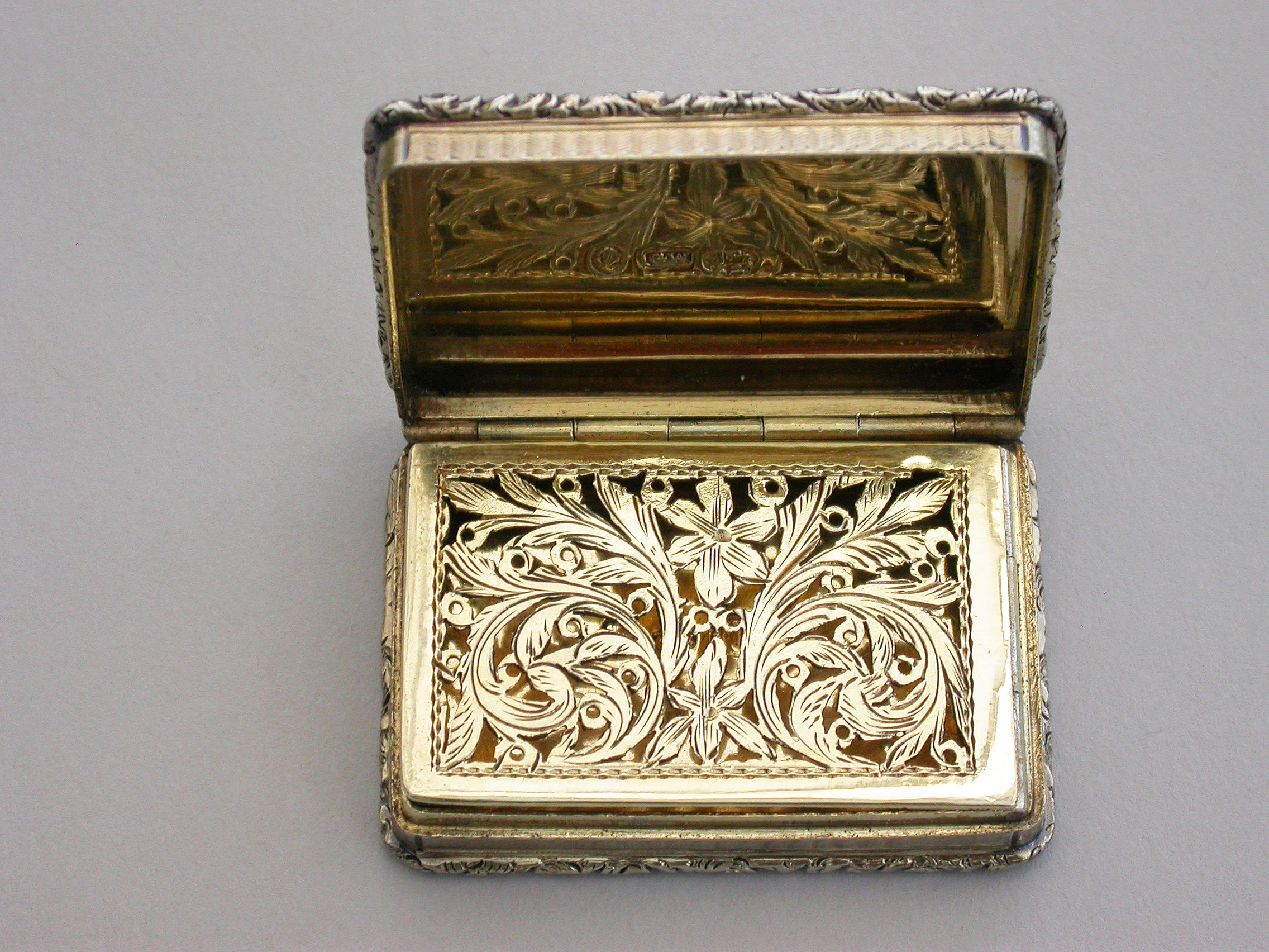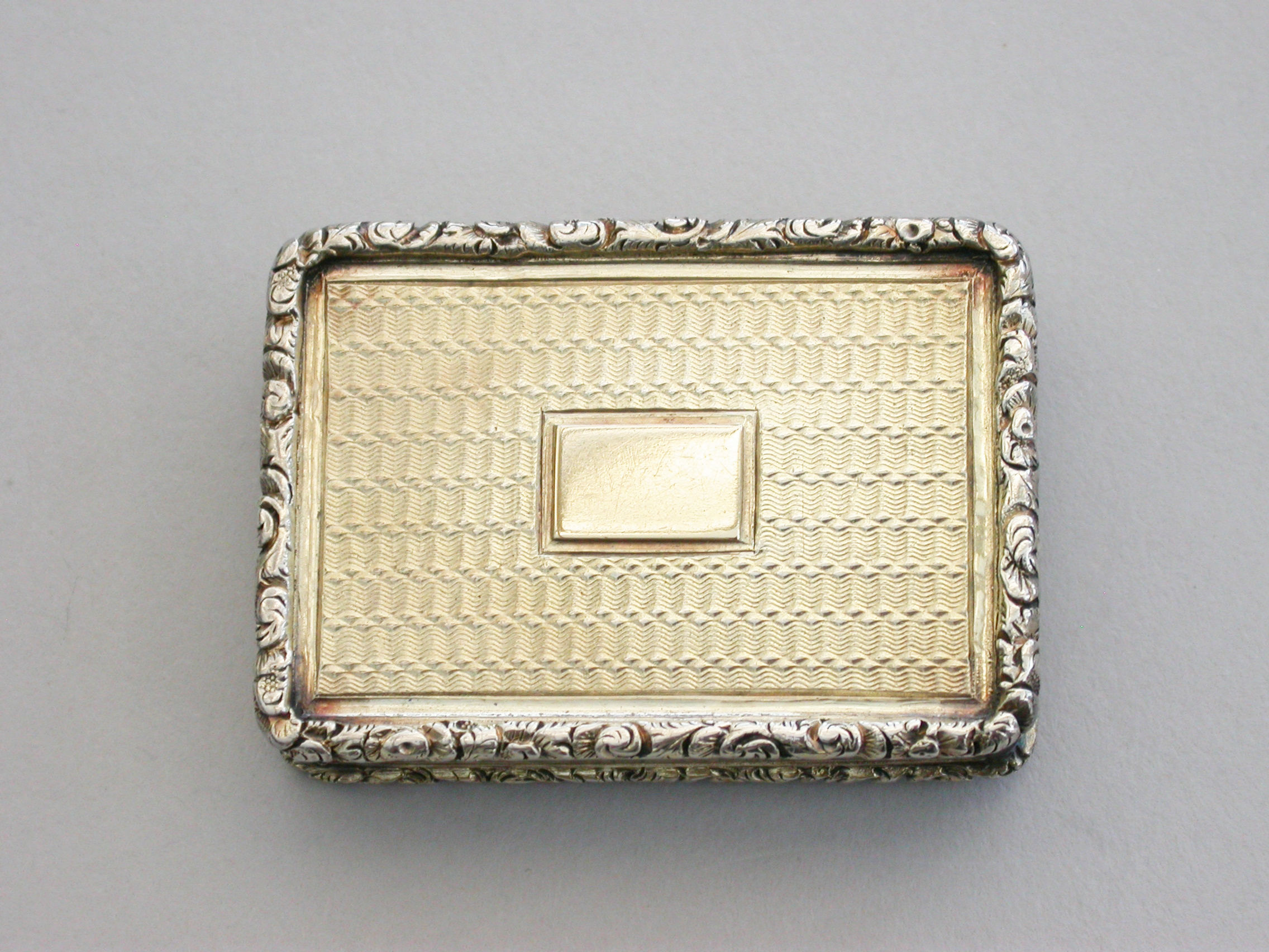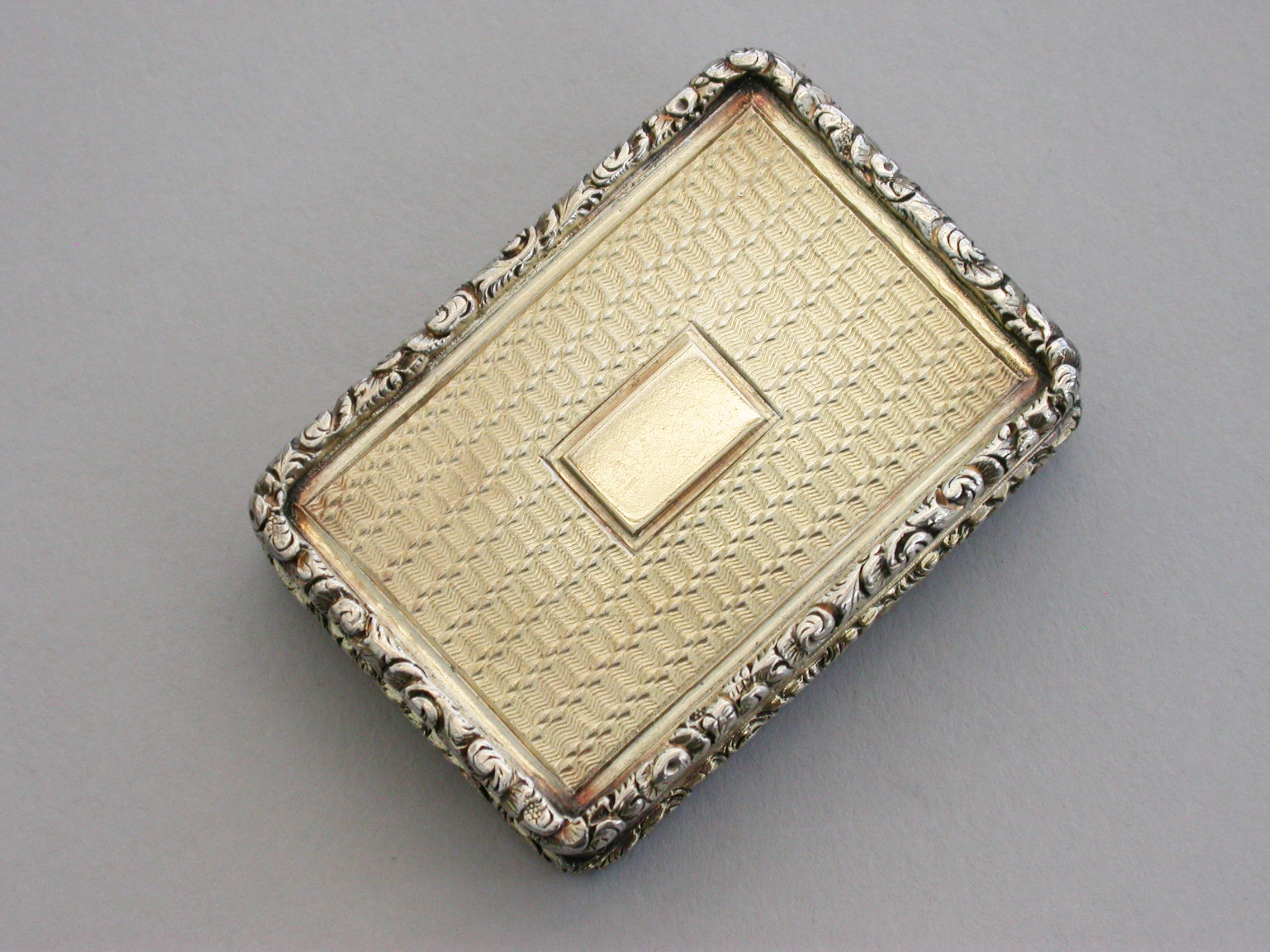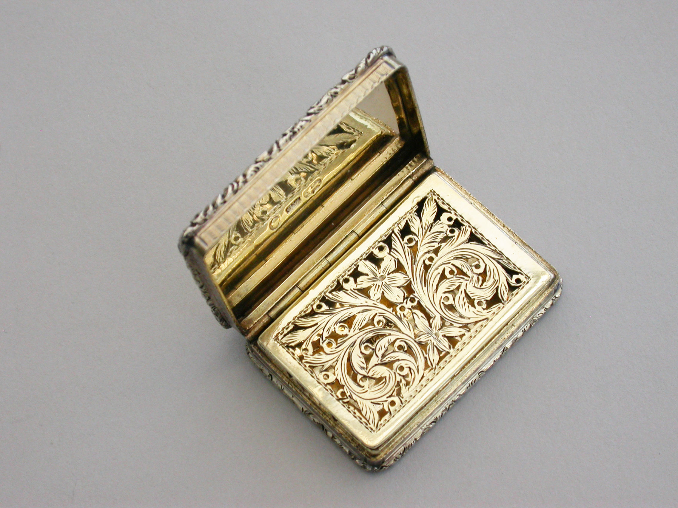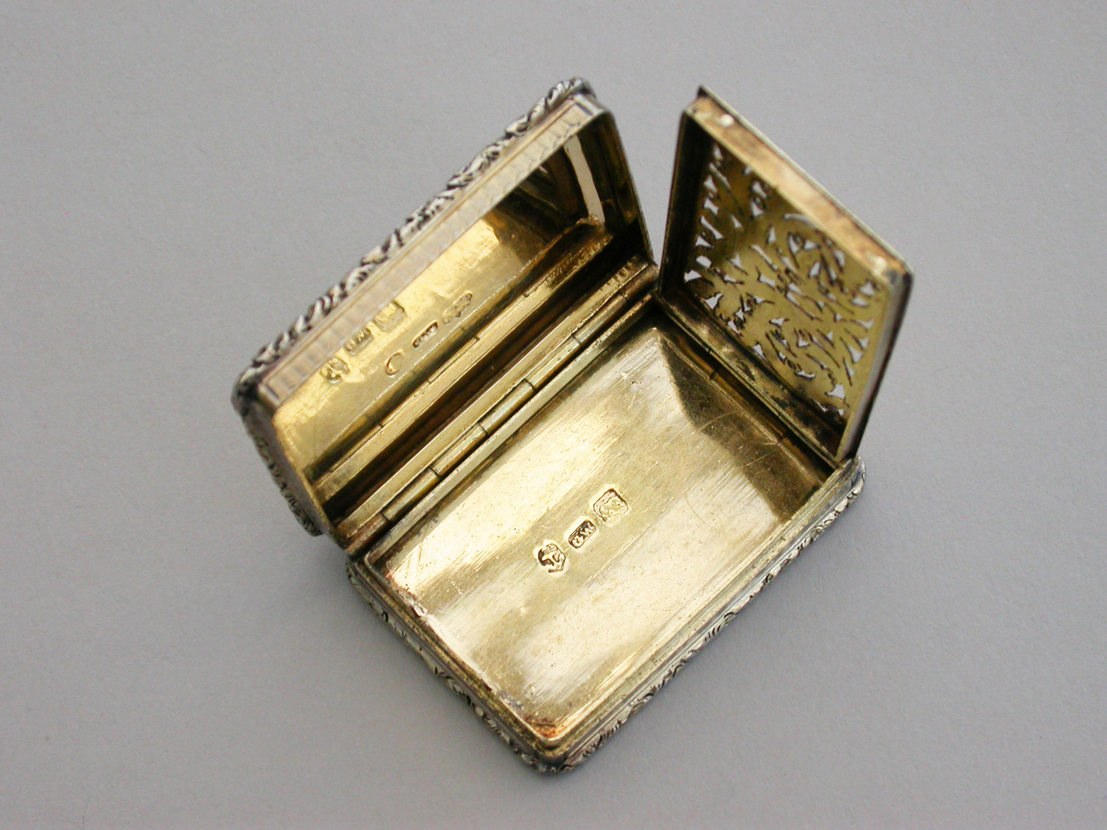 A fine quality William IV heavy silver gilt Vinaigrette, the cover cast with a mare and her foal in a landscape scene within a cast foliate border, probably after George Stubbs. The base and sides with engine turned decoration a vacant rectangular cartouche. The silver gilt grille pierced with scrolls and flower heads.
