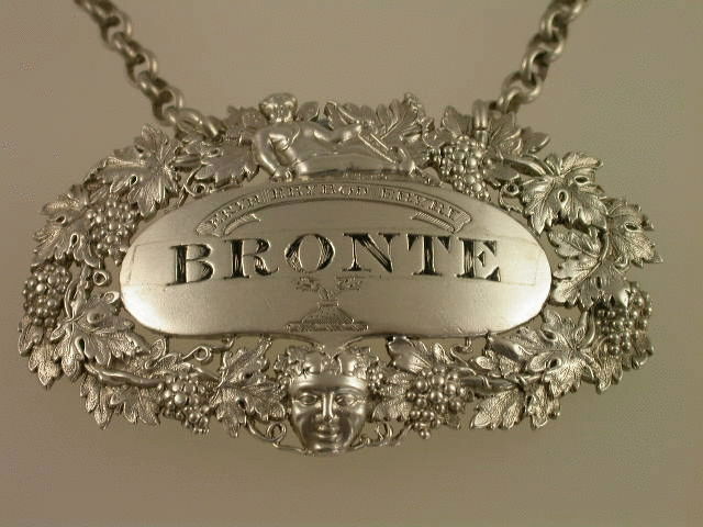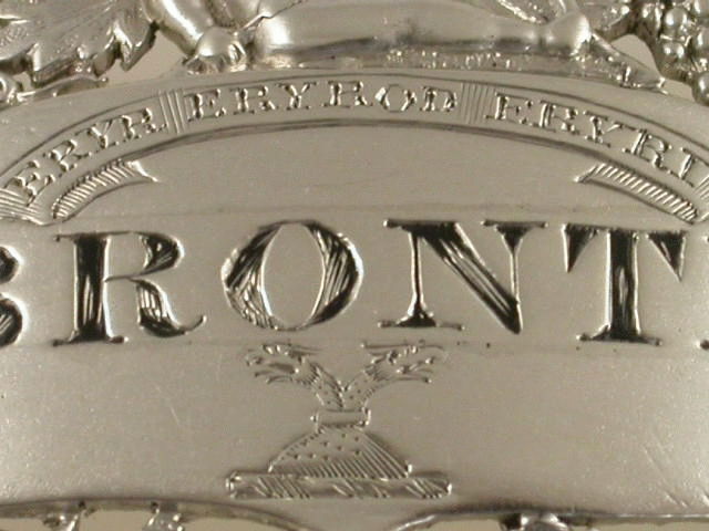 A very fine and rare George III cast silver Wine Label of pierced oval form, the border of vine leaves and grapes, surmounted by a figure of cupid with bow and arrow, a smiling Bacchus mask head below, the oval name plate incised and niello filled for BRONTE, a motto above and a crest below. The motto: “ERYR ERYROD ERYRI” (The Eagle of the Eagles of North Wales). The Crest: An Eagle’s head with two necks couped proper, for the family of OWEN, Worcestershire. See Wine Labels 1730 – 2003 by John Salter, page 77, fig 287.