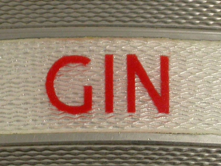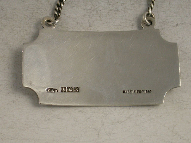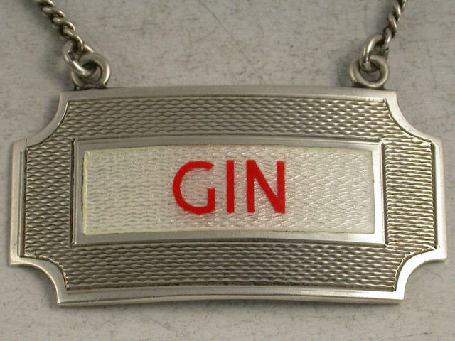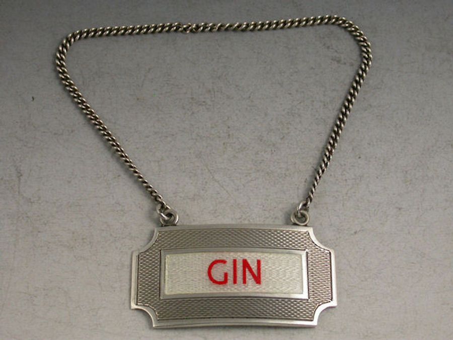 A mid 20th century silver and enamel Wine Label in the Art Deco style, of rectangular form with raised eyelets and concave cut corners, engine turned background, enamelled in red for GIN on a white guilloche enamel panel.