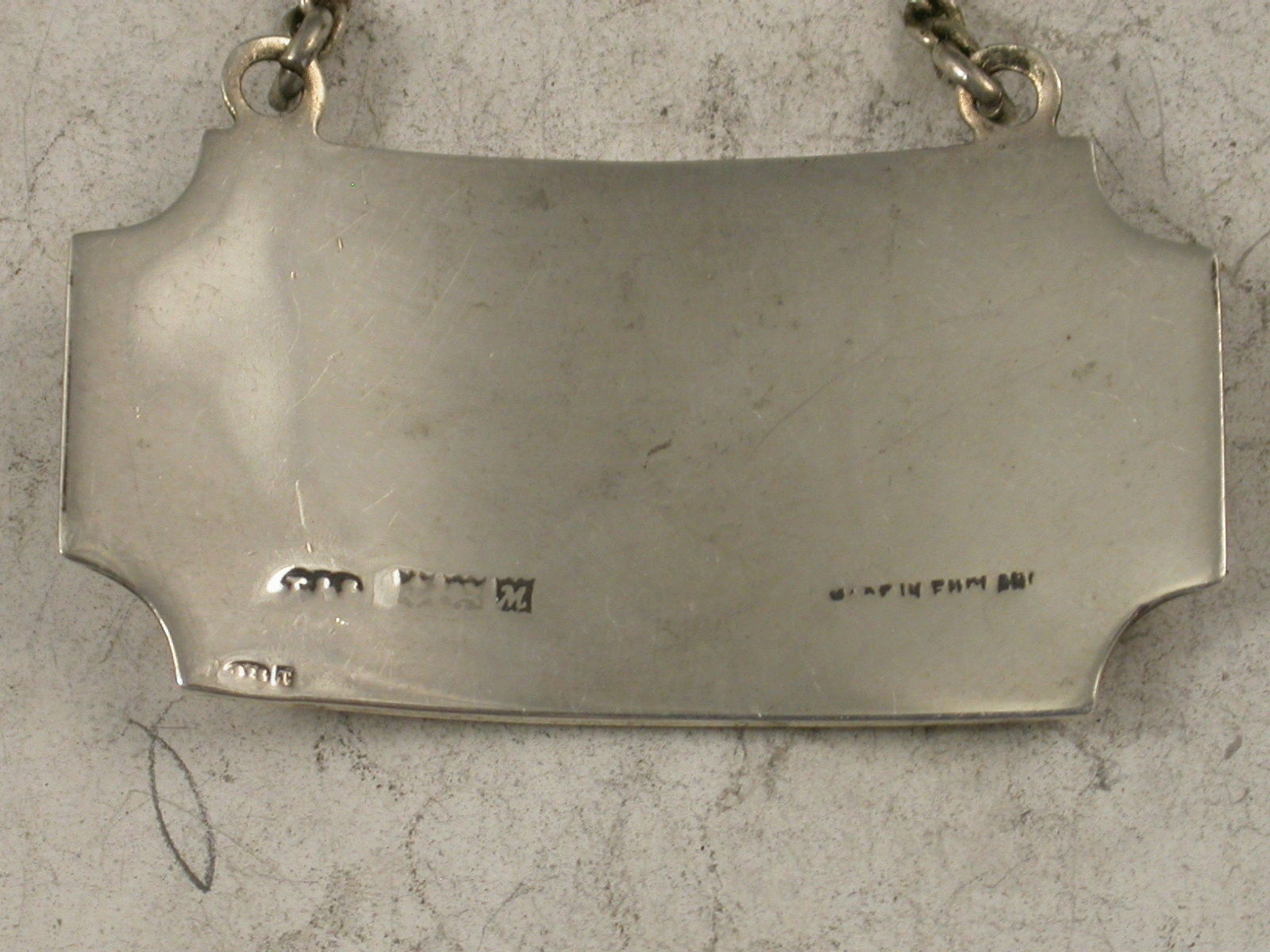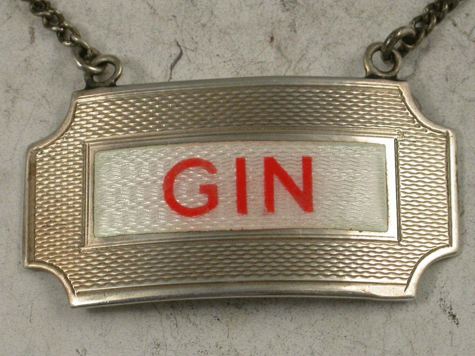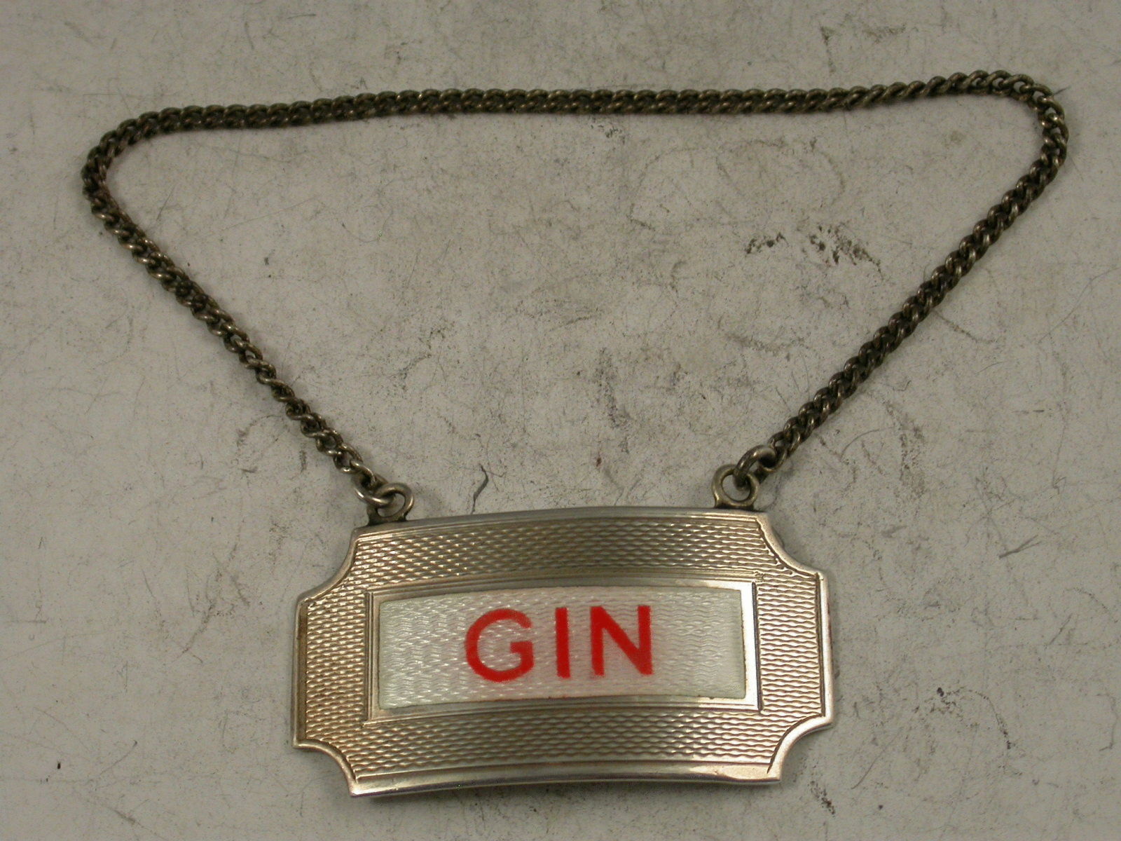 A mid 20th century silver and enamel Wine Label in the Art Deco style, of rectangular form with raised eyelets and concave cut corners, engine turned background, enamelled in red for GIN on a white guilloche enamel panel.
