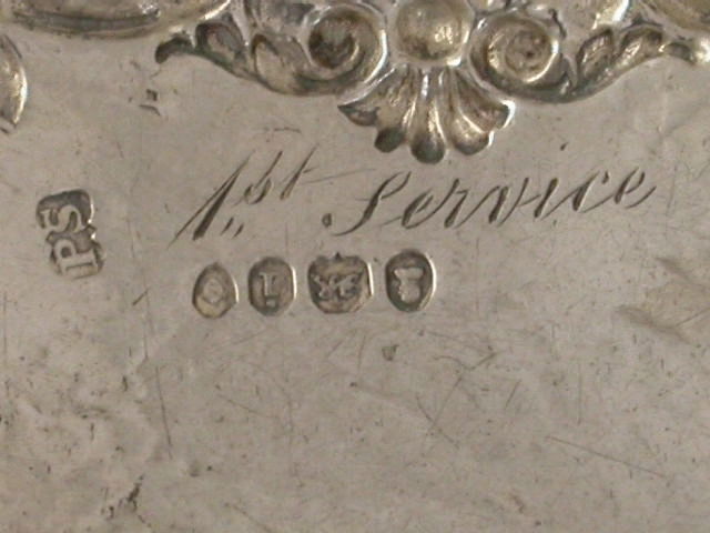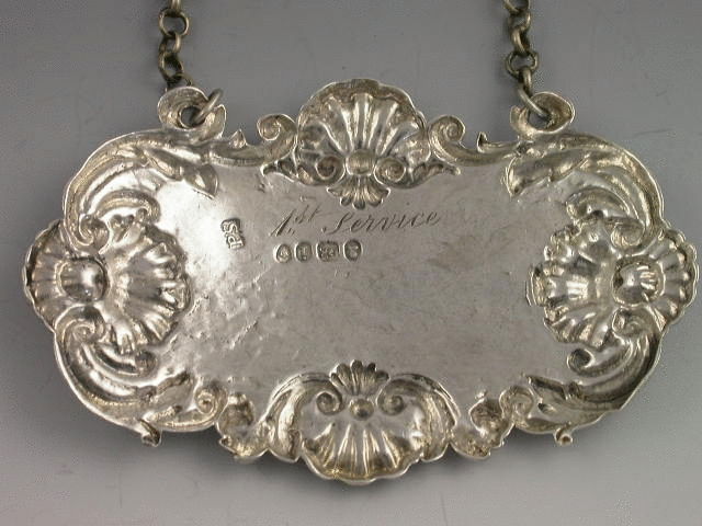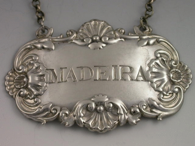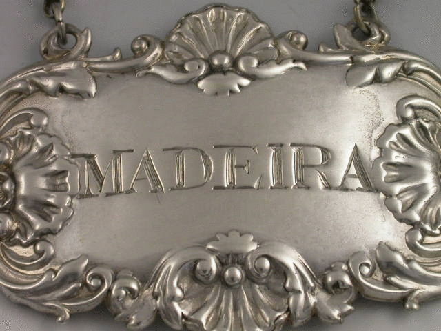 A rare George IV die-stamped silver Wine Label of shaped oval cartouche form, the border with scrolls and shells, incised for MADEIRA. The reverse engraved 1st Service.