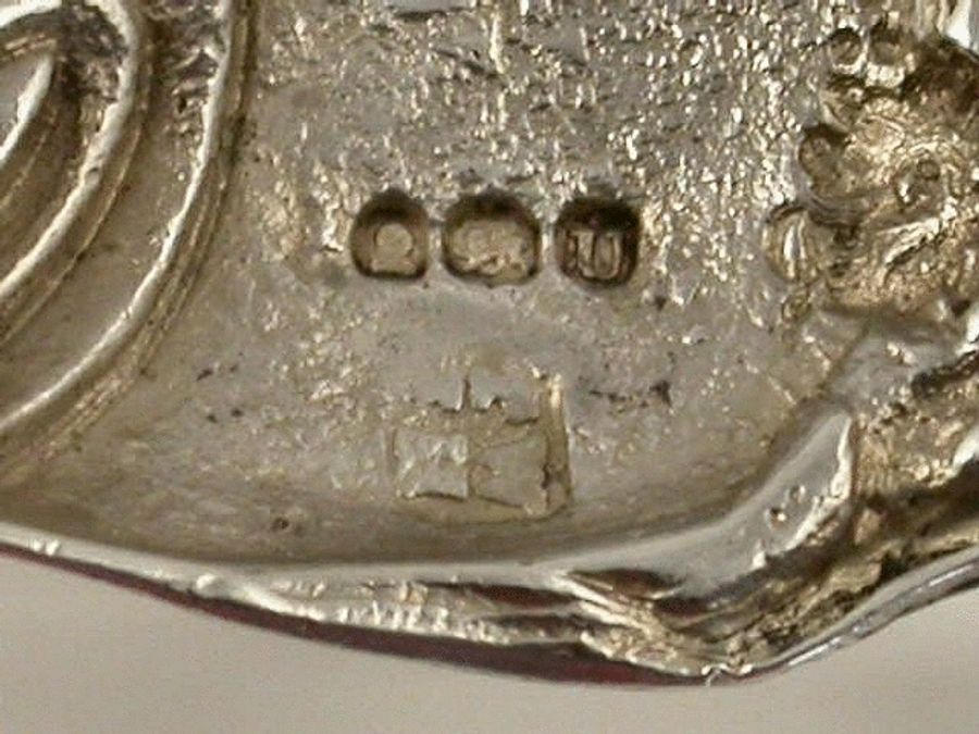 A rare George III heavy die-stamped silver Wine Label with elaborately decorated border depicting a bowl with two goblets, a naked putto amongst vine leaves and grapes, with a lion looking around the end of the scrolled title plate incised for PORT.