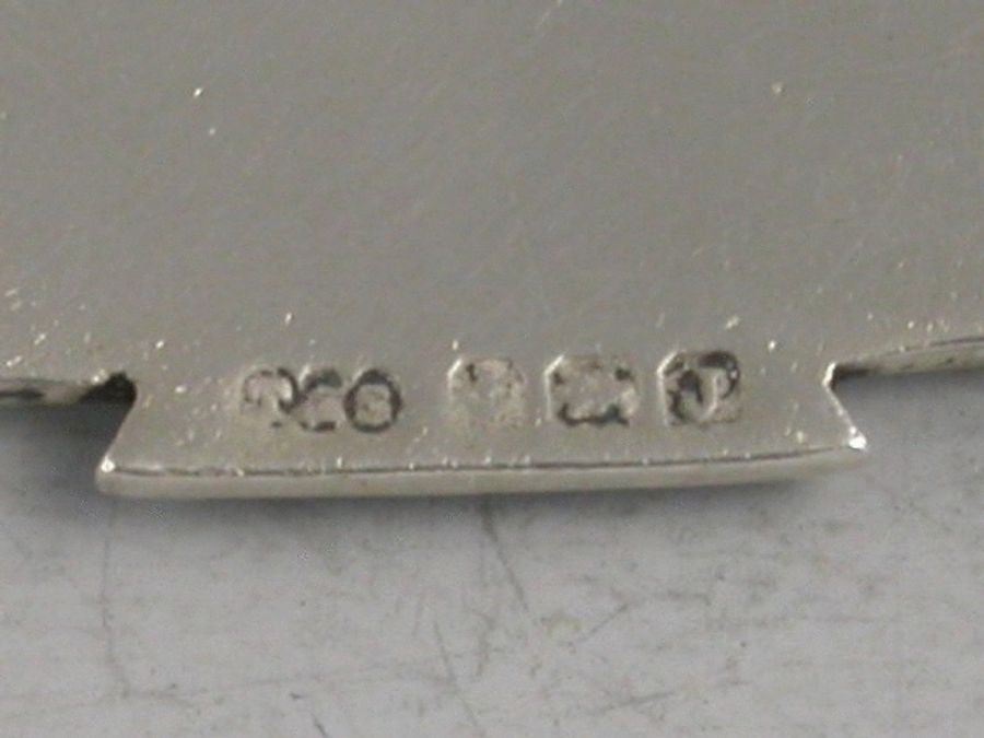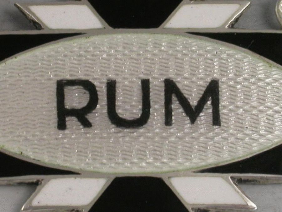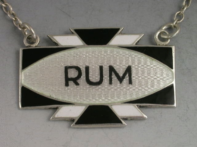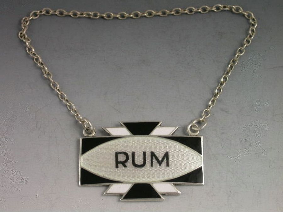 A stylish Art Deco silver and enamel Wine Label of typical geometric design with panels of black and white enamel with guilloche background to name plate enamelled for RUM.