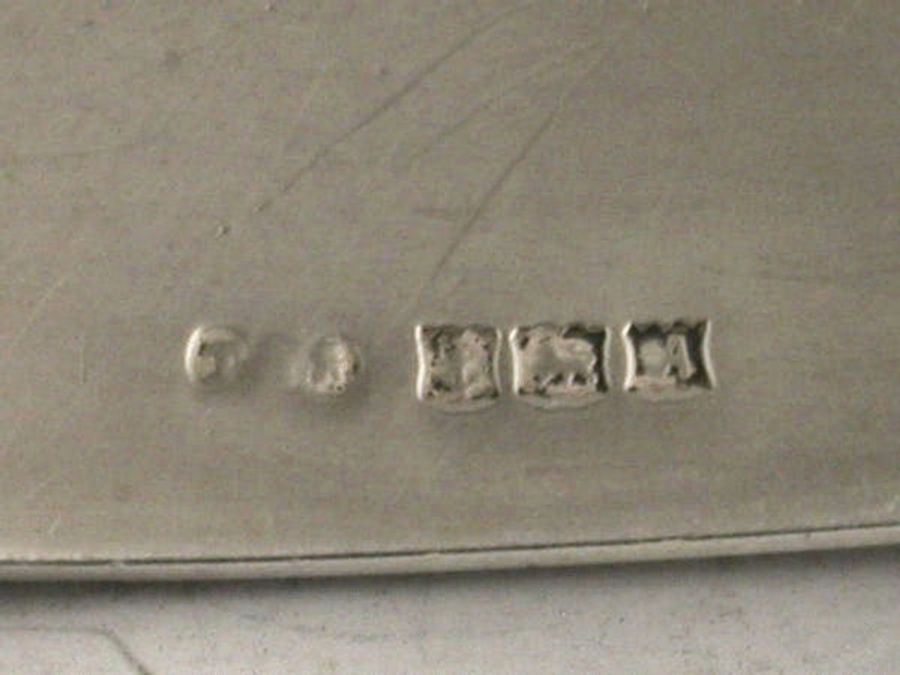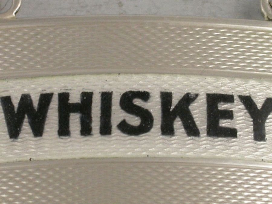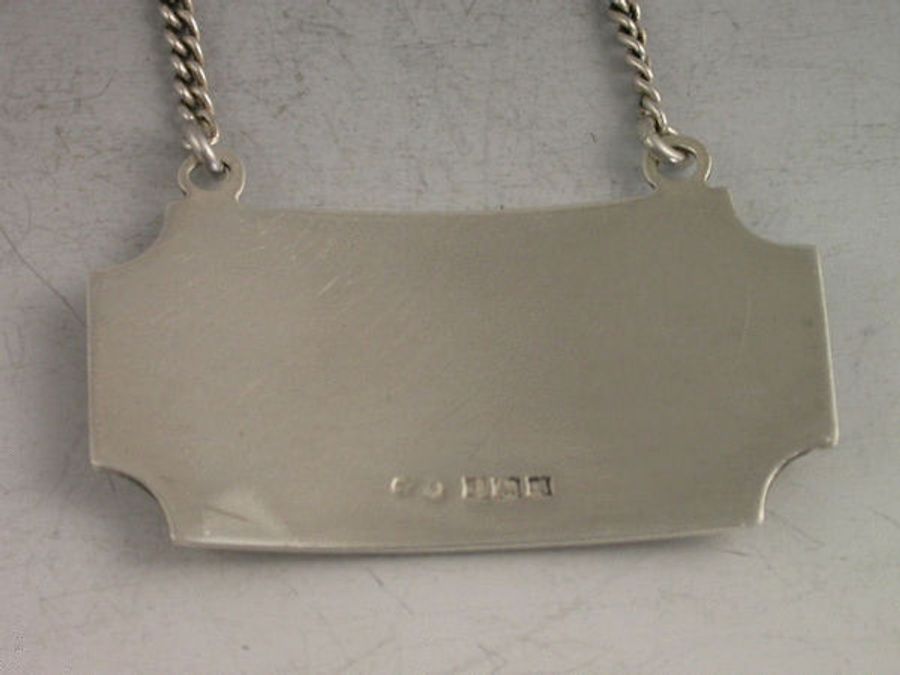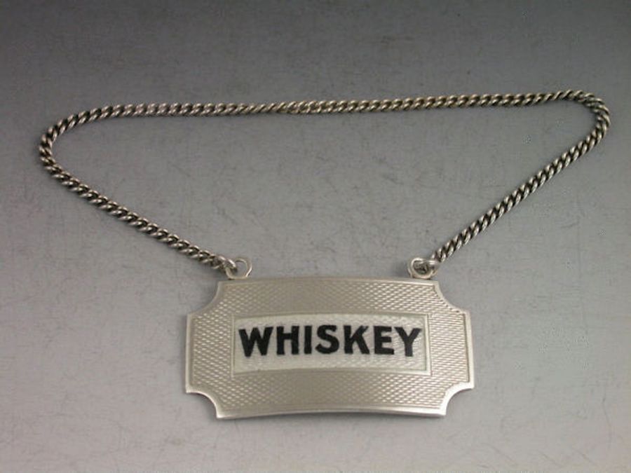 A mid 20th century silver and enamel Wine Label in the Art Deco style, of rectangular form with raised eyelets and concave cut corners, engine turned background, enamelled in black for WHISKEY on a white guilloche enamel panel.