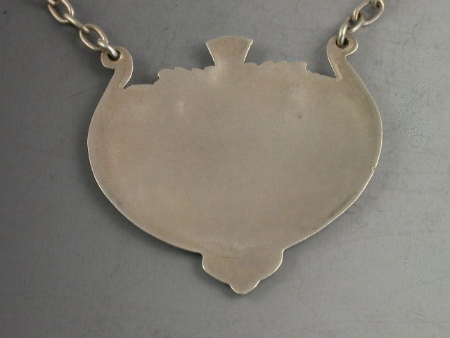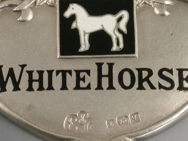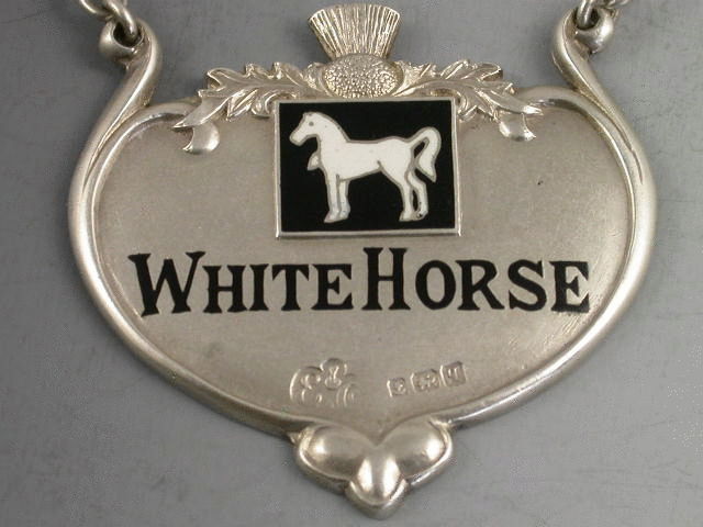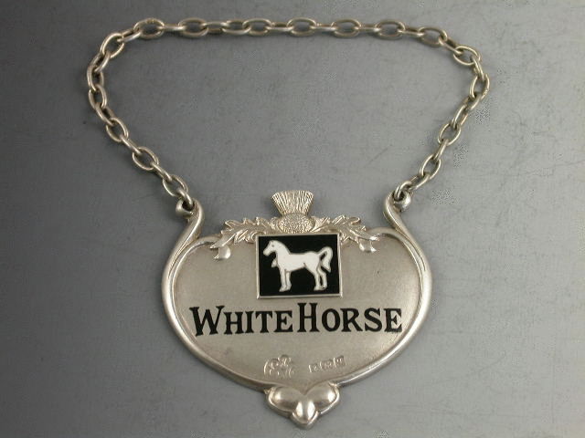 A rare early 20th century silver and enamel “Advertising” Wine Label, made in the Art Nouveau style with black enamelled name and logo for White Horse Whisky, scrolled outline and thistle surmount.