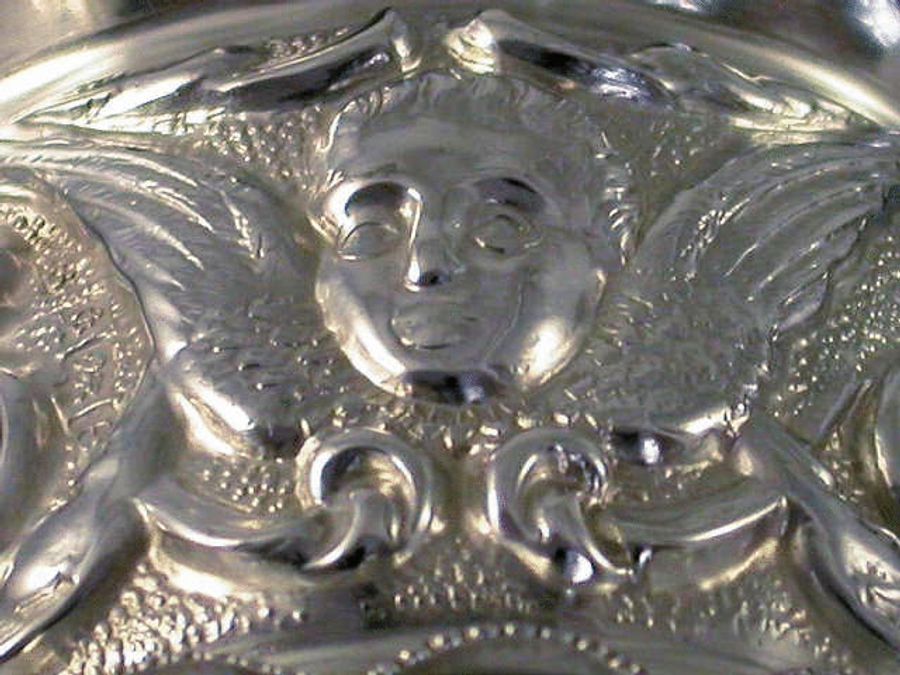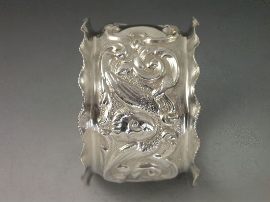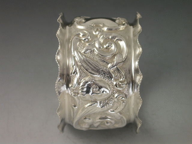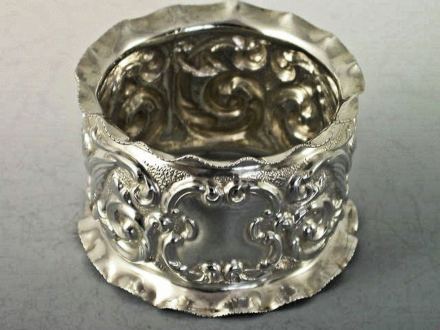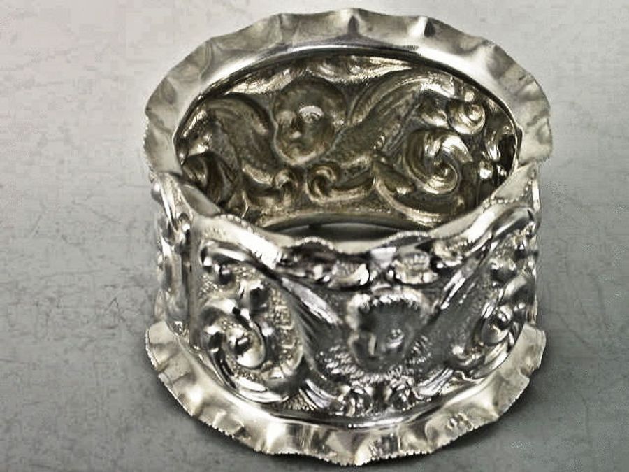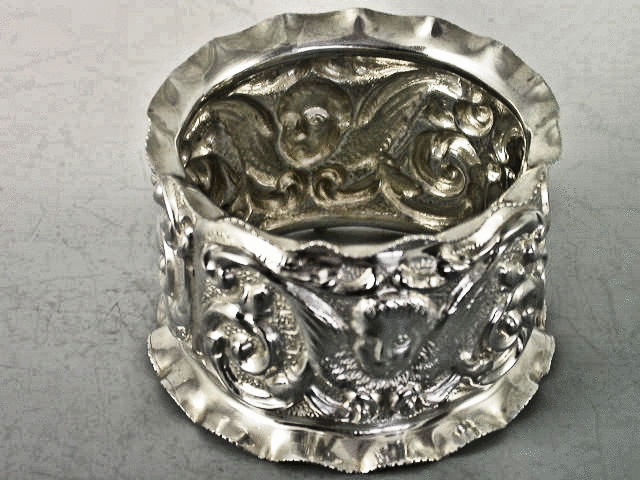 A good quality Edwardian silver Napkin Ring with turned over crenolated rim, chased and embossed with scrolls, cherub masks with wings and a vacant shield shape cartouche, on matt background.
